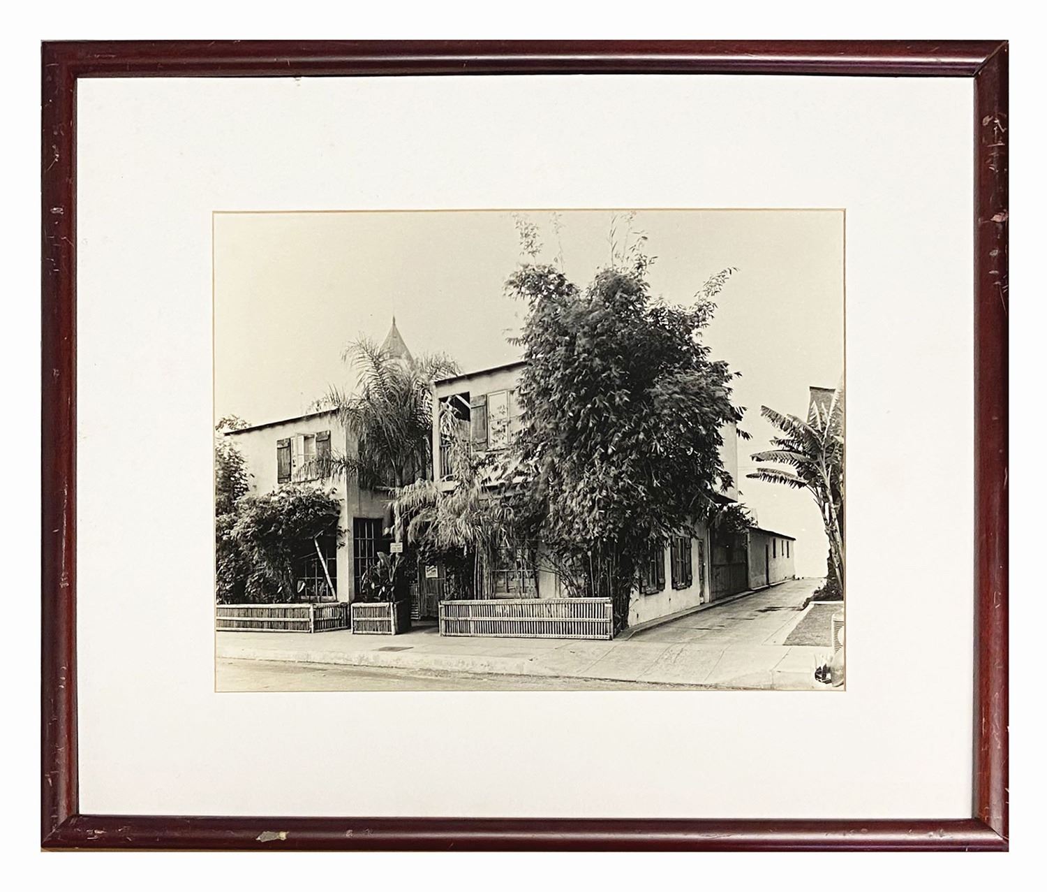 (Disney-MGM, c.1990s) A high quality black and white photo print, used as wall decor at Disney-MGM Studios. The photo depicts a vintage Hollywood bungalow, and is believed to have been used in the early years of The Brown Derby restaurant. The photo has an image size of 9.5"x13" within its original 16.5"x20" frame. The condition is good with frame wear from use.