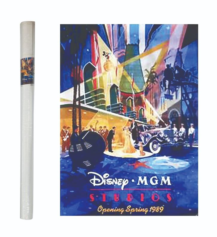 (Disney-MGM, c.1987) A fantastic poster celebrating the soon to open Disney-MGM Studios in Spring 1989. This poster is styled after posters of the 1920s and features a colorful Hollywood scene. Measuring 24"x18", the poster is unopened in its original wrapping but appears to be in good condition, aside from some slight crushing on one end which may leave bend marks.