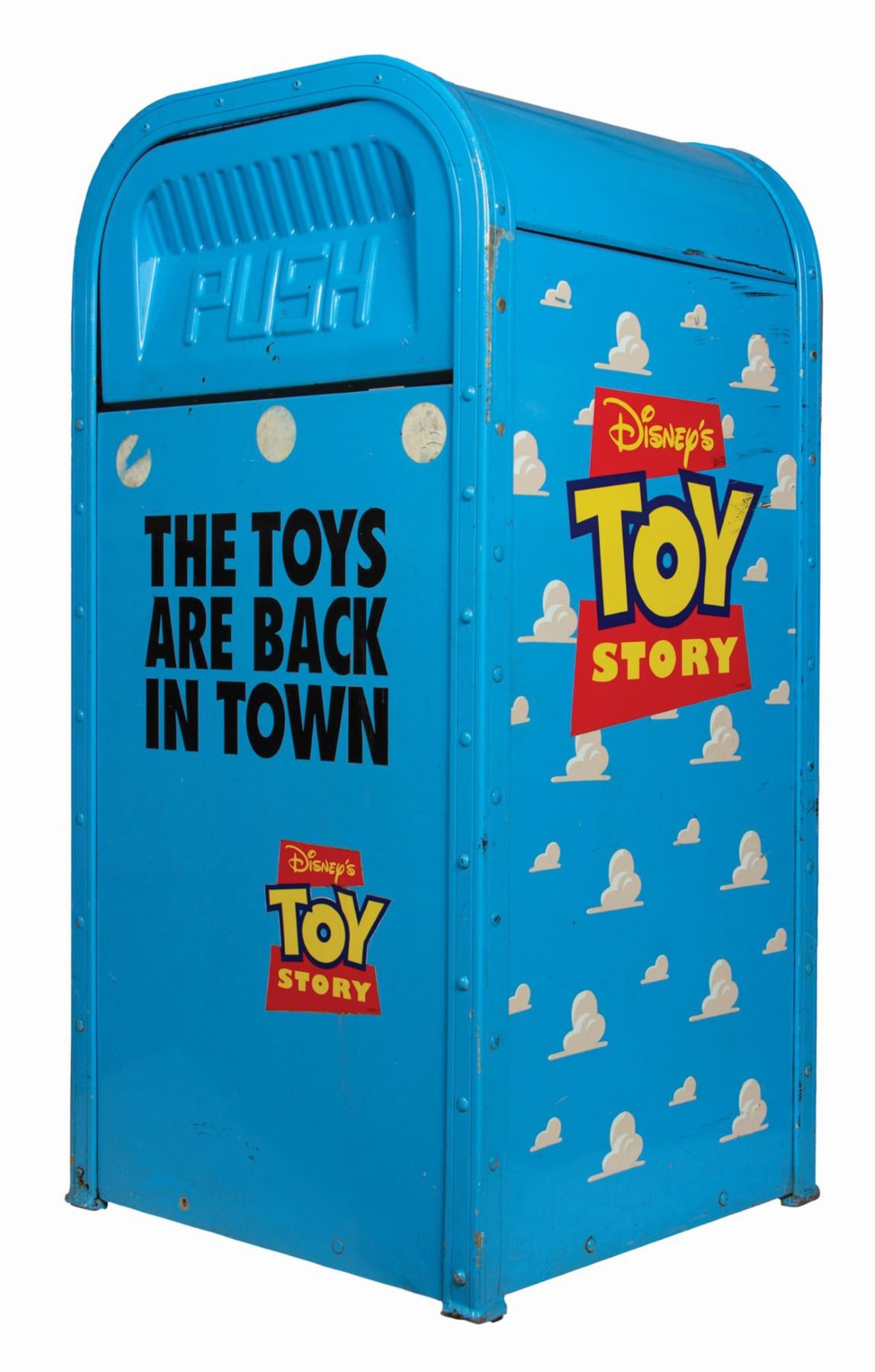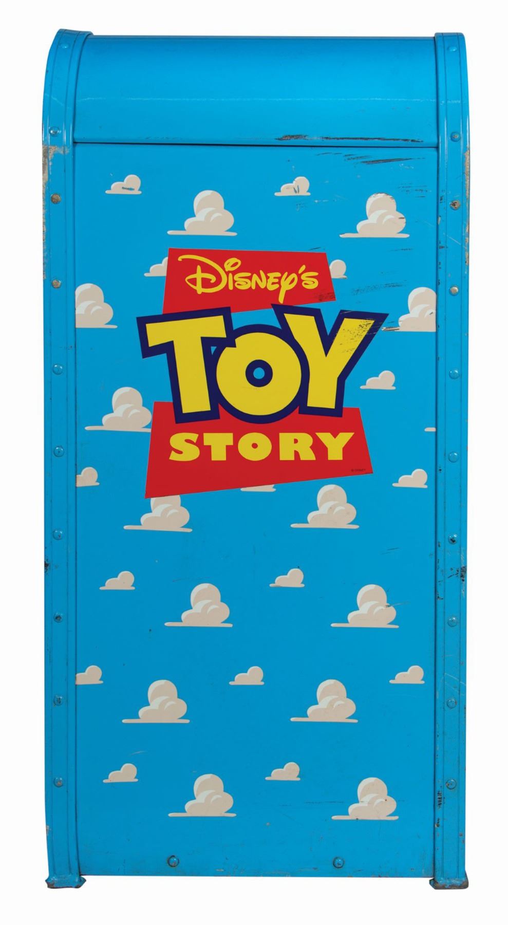 (Disney-MGM, c.1995) A custom-made trash can from Disney-MGM Studios. The success and popularity of the original Toy Story was celebrated at Disney-MGM Studios through themed parades, walk-around character appearances, and even specialty trash cans such as this. The sky-blue painted trash can features hand-trimmed and applied imagery on each side, as well as the film's slogan, "The Toys are Back in Town." Due to the specific theme of these trash cans, they were only in use within the park for a short while, making surviving examples extremely scarce. Measuring just over 20"x21" and 42" tall, the trash can is in fair condition with warping to the metal access door, thin cracks in one of the "push" flaps, a few missing small bolts, and various scratches and scuffs throughout from its use and removal. This item may require special shipping arrangements, please inquire for details and estimates.