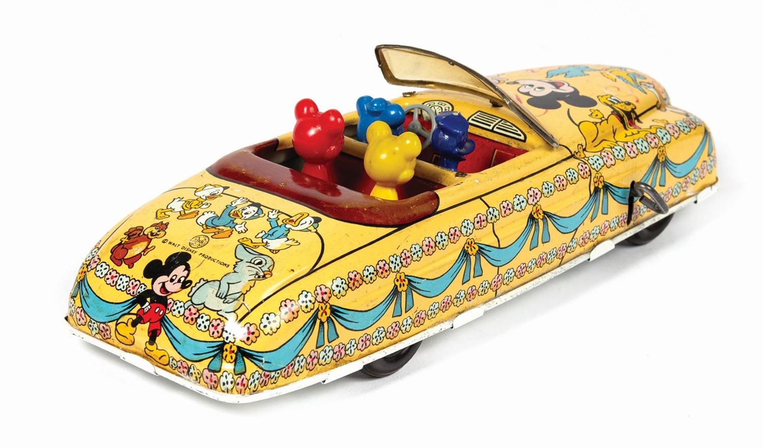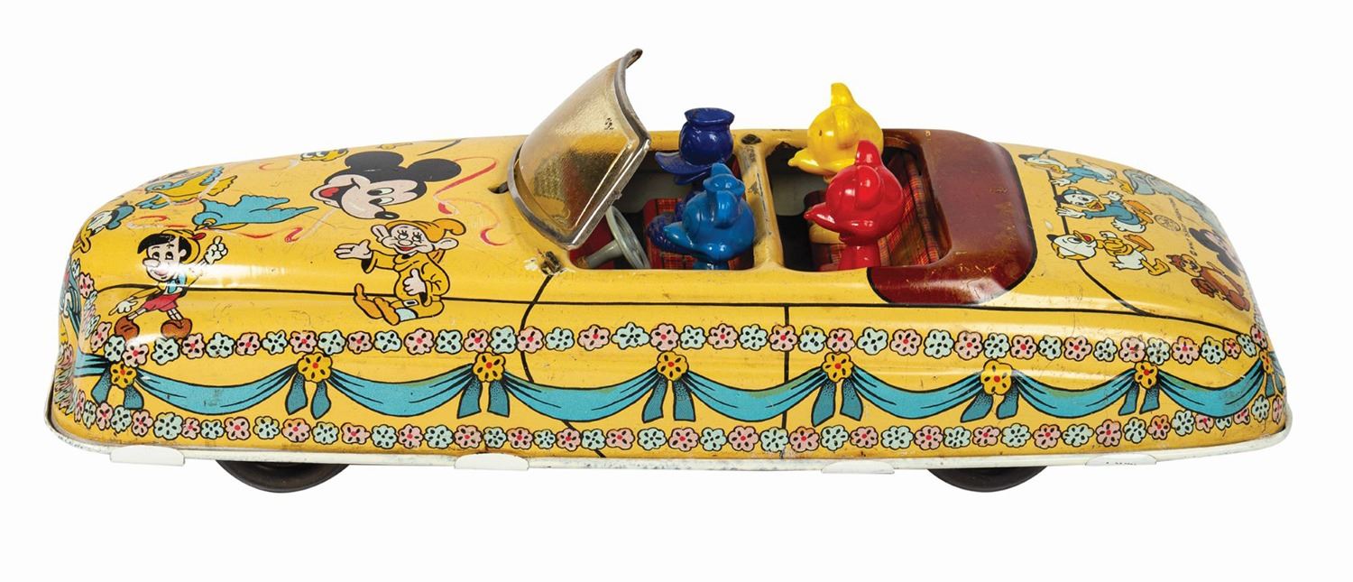 (Disney, c.1950s) A vintage tin-litho parade car with mechanical spring-wound action manufactured by Marx. The plastic windshield, plastic steering wheel, and metal winding key are all present and the internal mechanicals have been tested and are in working order. Measuring 11.25”x4.25” and 3” tall, the parade car is in good condition. It exhibits some scratching, scuffs, chipping, and soiling to the surface of the car and minor soiling to the figures.