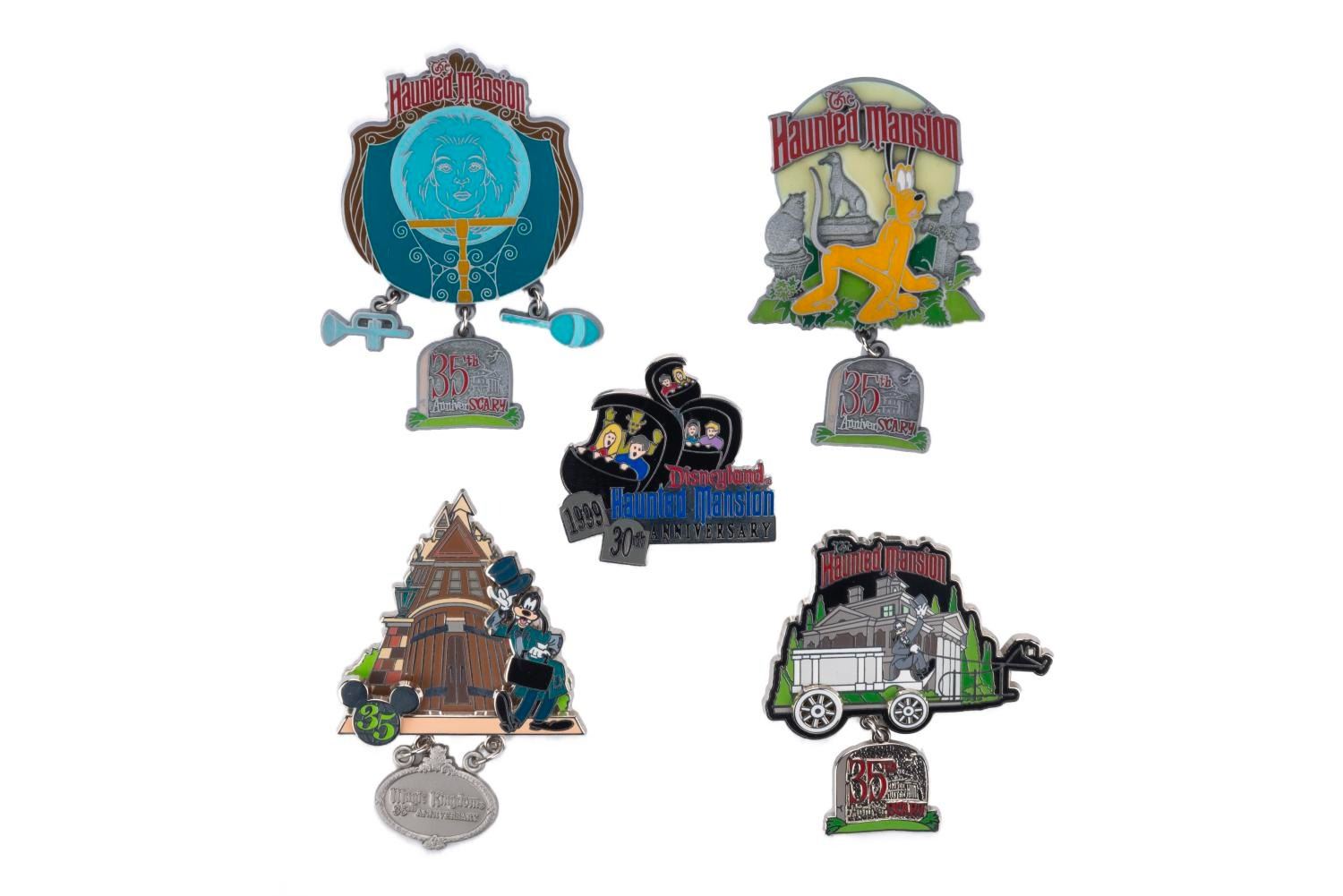 (Disneyland/Walt Disney World, 1999-2006) A collection of five Haunted Mansion Anniversary Pins from 1999, 2004, and 2006, with dangler and "pin-on-pins" features. Each pin is in fine condition.