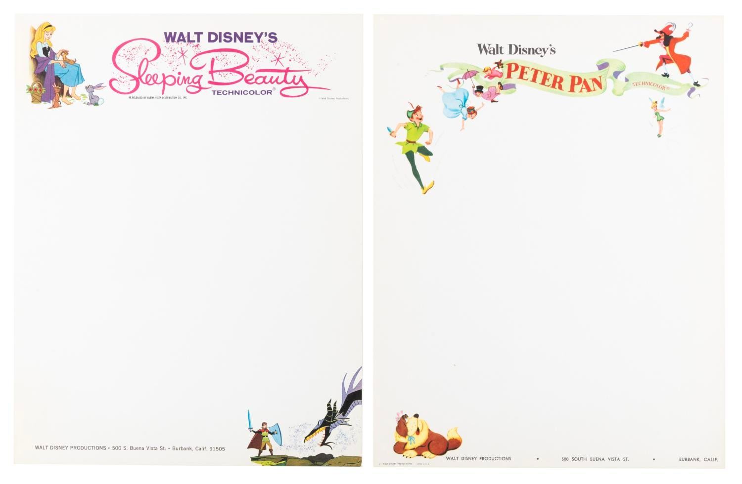 (Disney, 1950s) Two beautiful sheets of Disney Studio letterhead for “Peter Pan" and “Sleeping Beauty." These were created and used only for correspondence during the production of these two animated classic films. Each measuring 8.5" x 11", the stationery is in very good to fine condition with the slightest wear from age and handling.