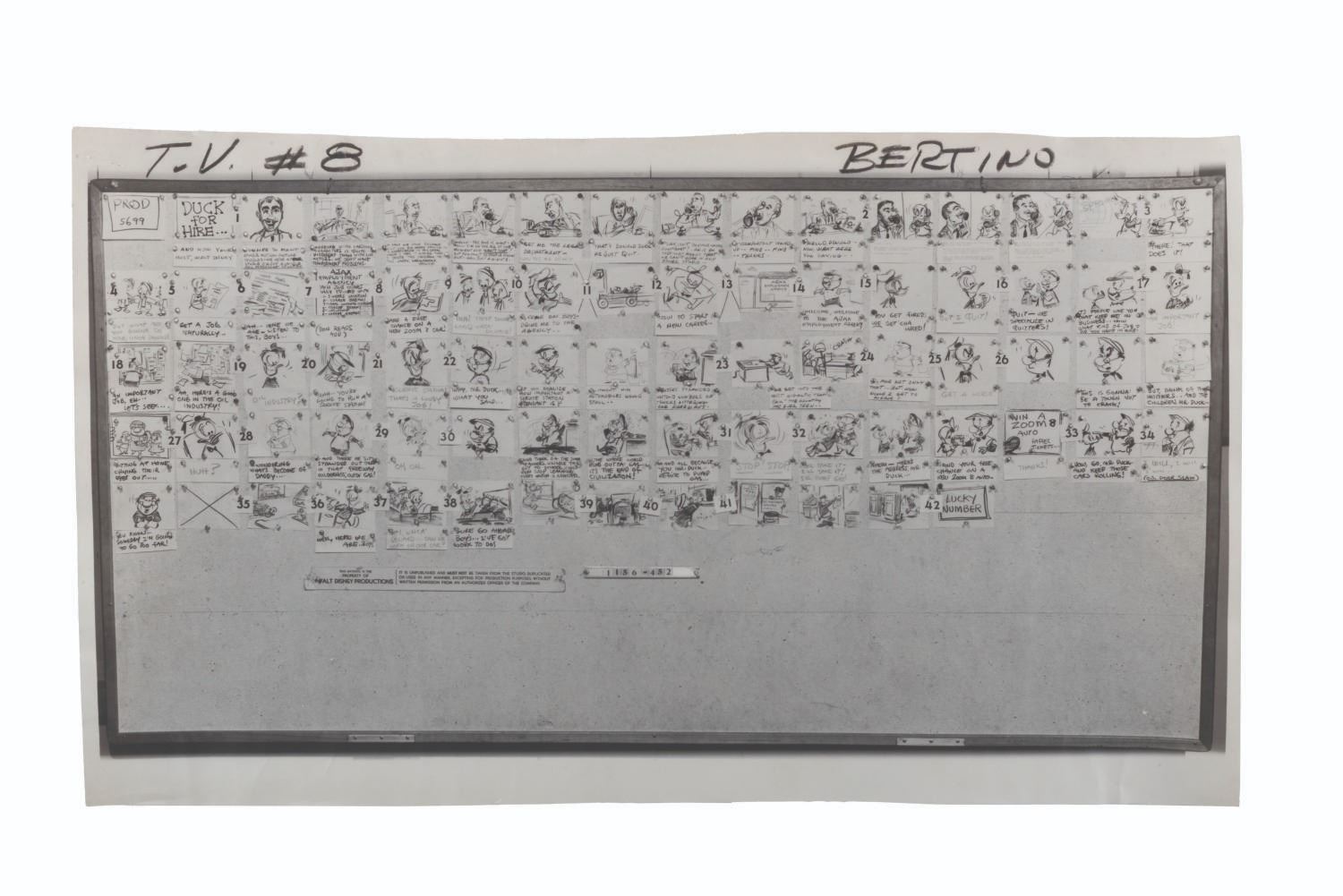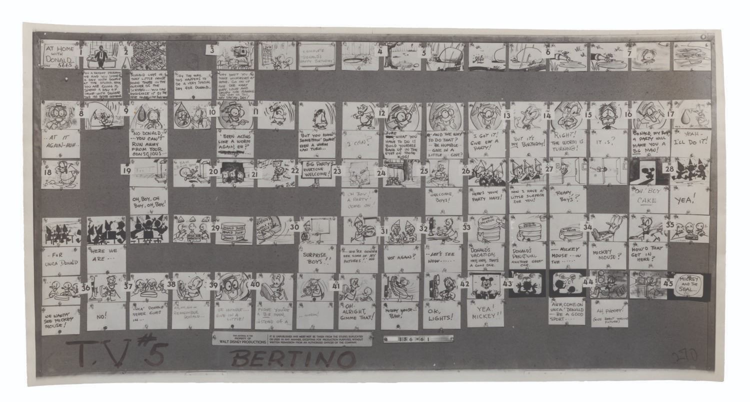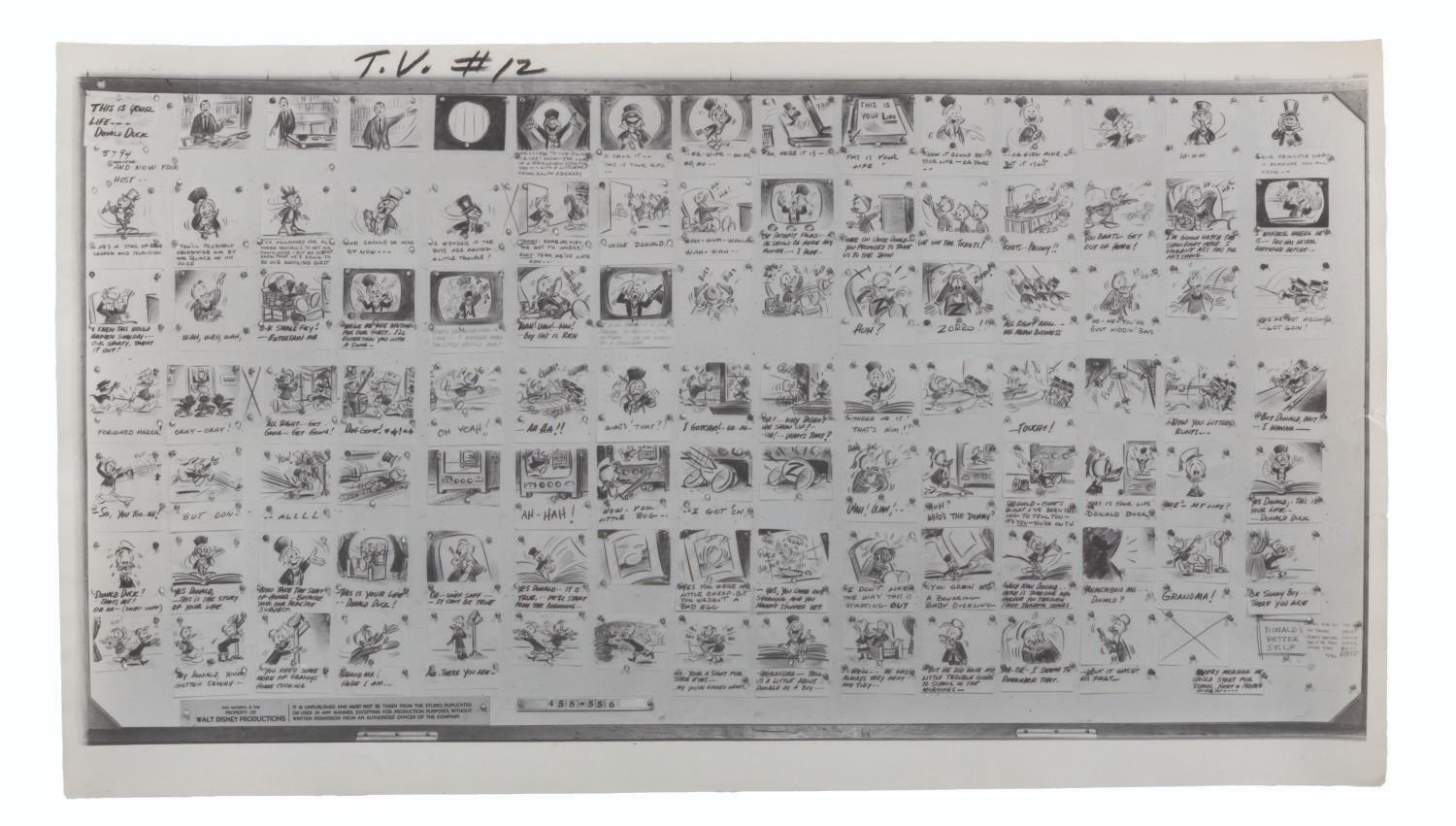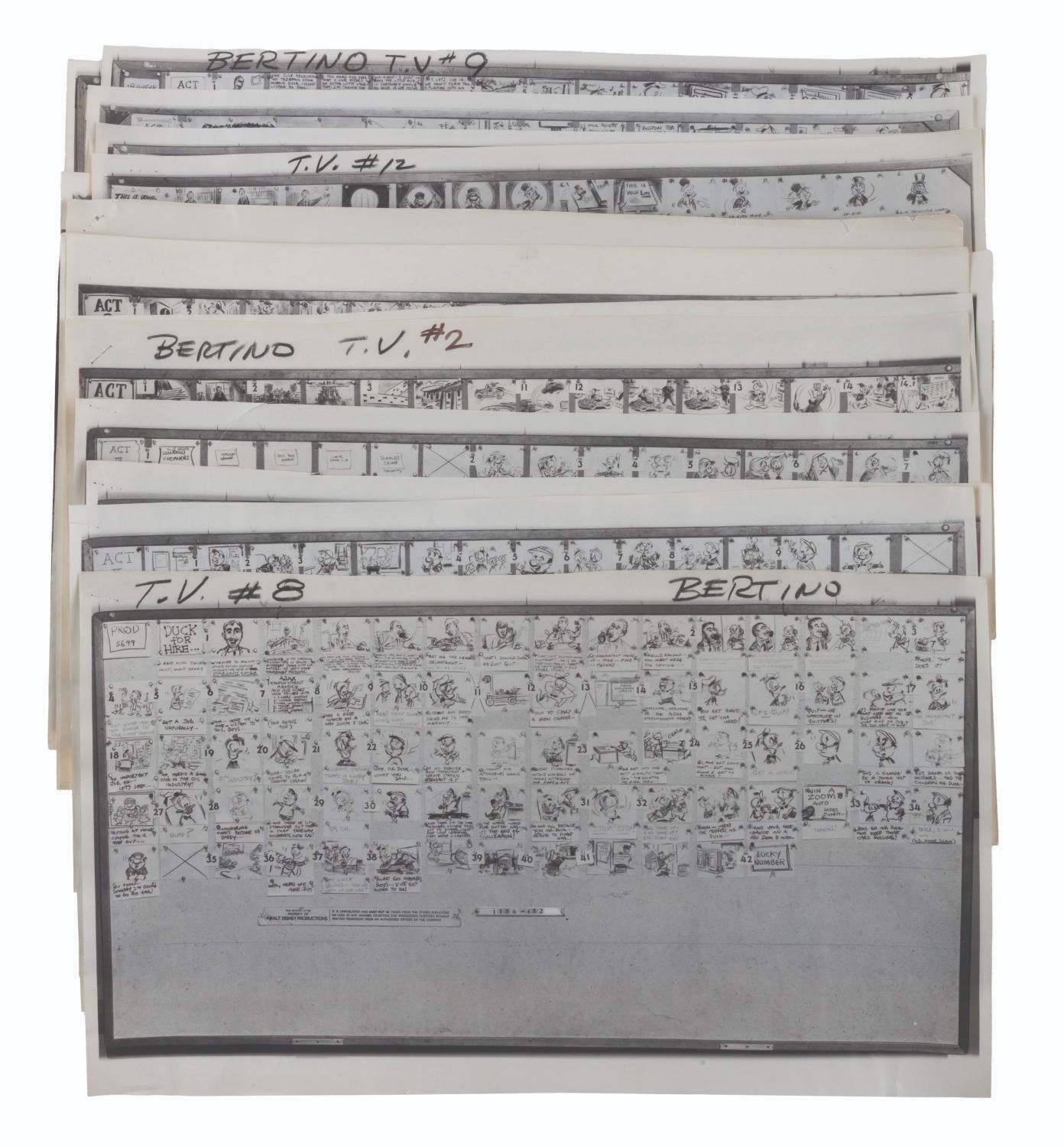 (Disney, 1956-1960) A collection of 22 production-used photostat storyboards from six episodes of the “Disneyland” and “Walt Disney Presents” anthology series, each starring Donald Duck. Included are the complete sets for episodes “At Home with Donald Duck,” “Duck Flies Coop,” and “Duck for Hire.” Also included are incomplete sets of photostats for “A Day in the Life of Donald Duck,” “Highway to Trouble,” and “This is Your Life, Donald Duck.” Ranging in size from 9” x 17” to 9” x 29”, the photostats are in good condition with edge wear, light warping, pinholes from production use, folds, and notations in grease pencil.