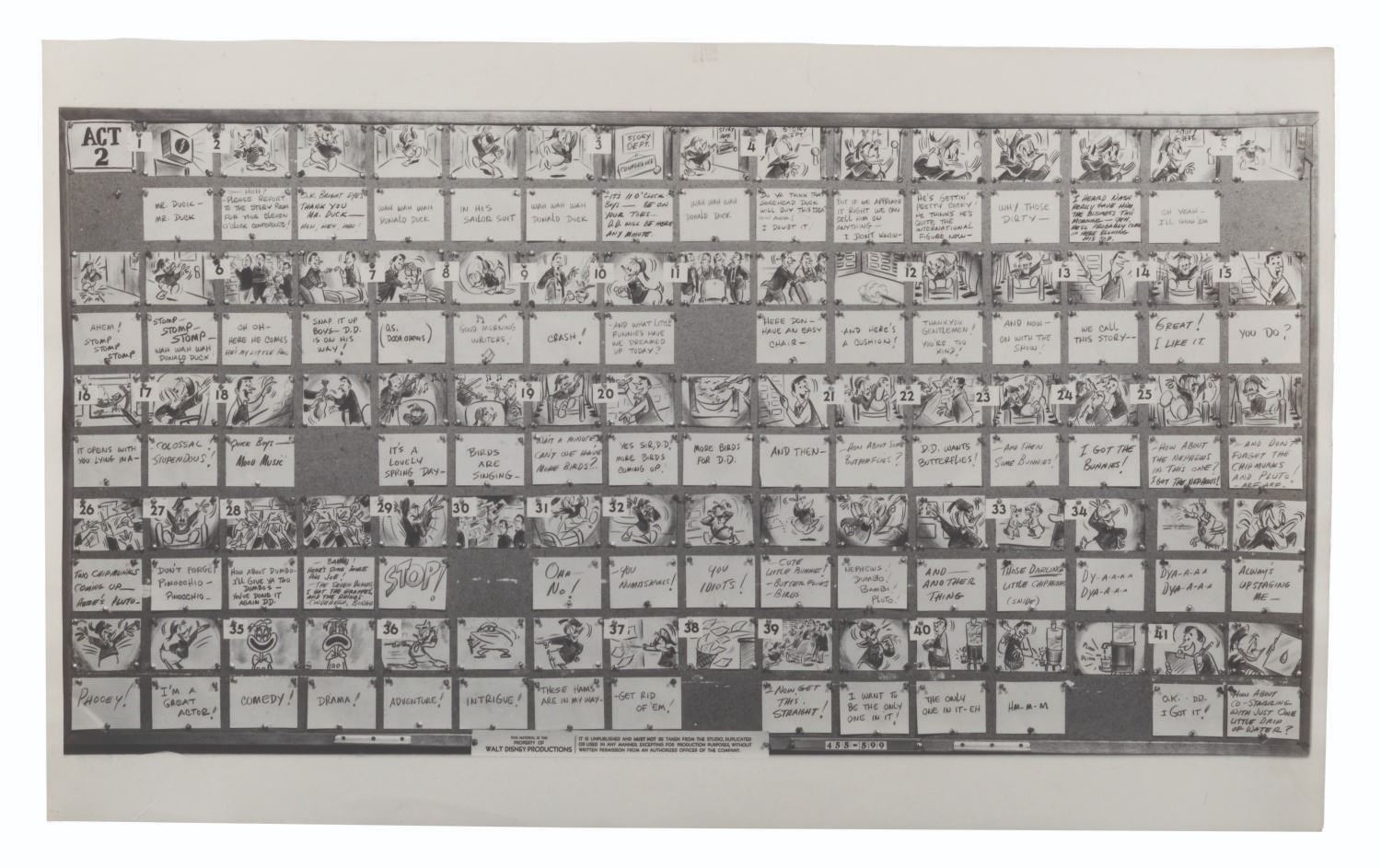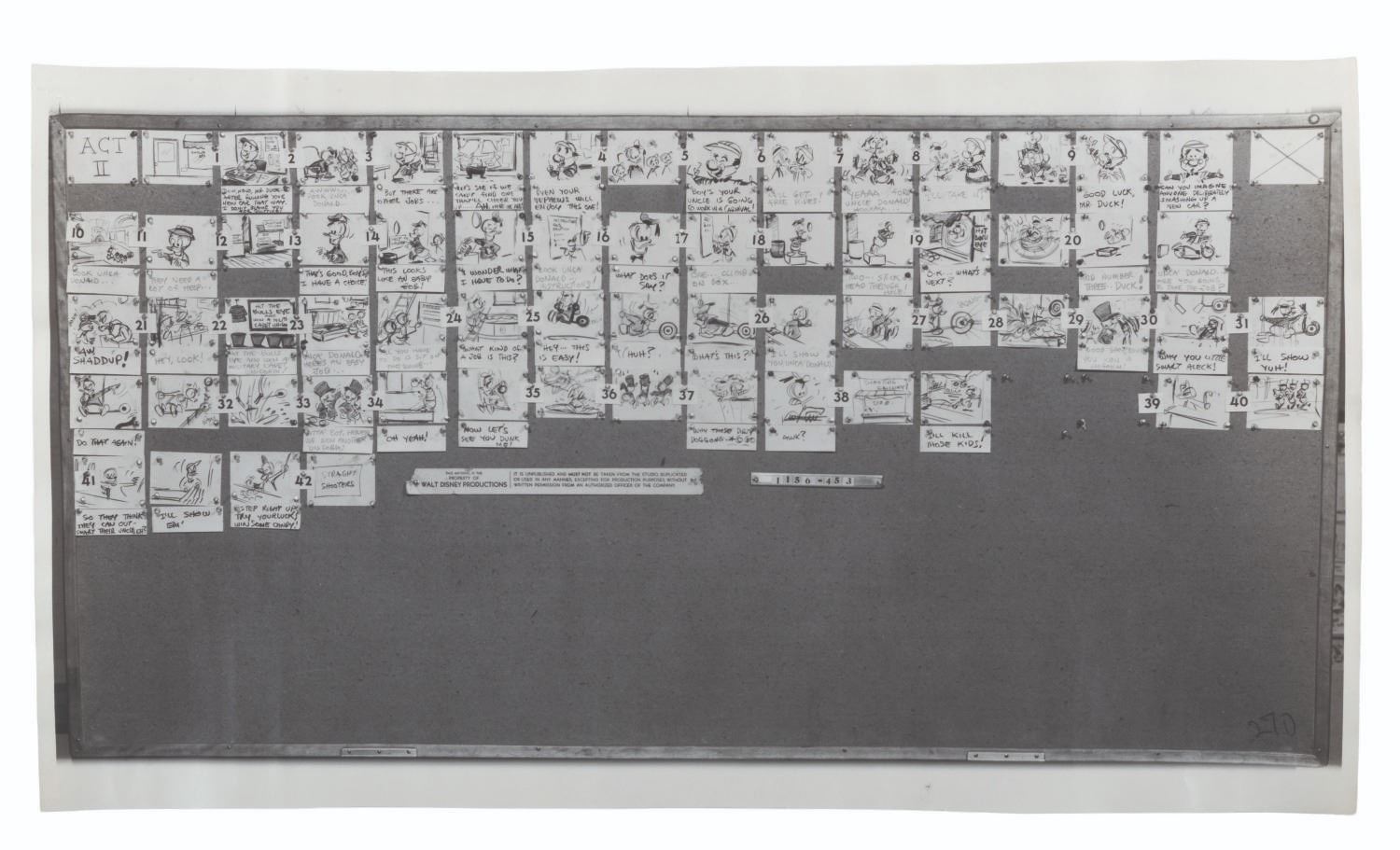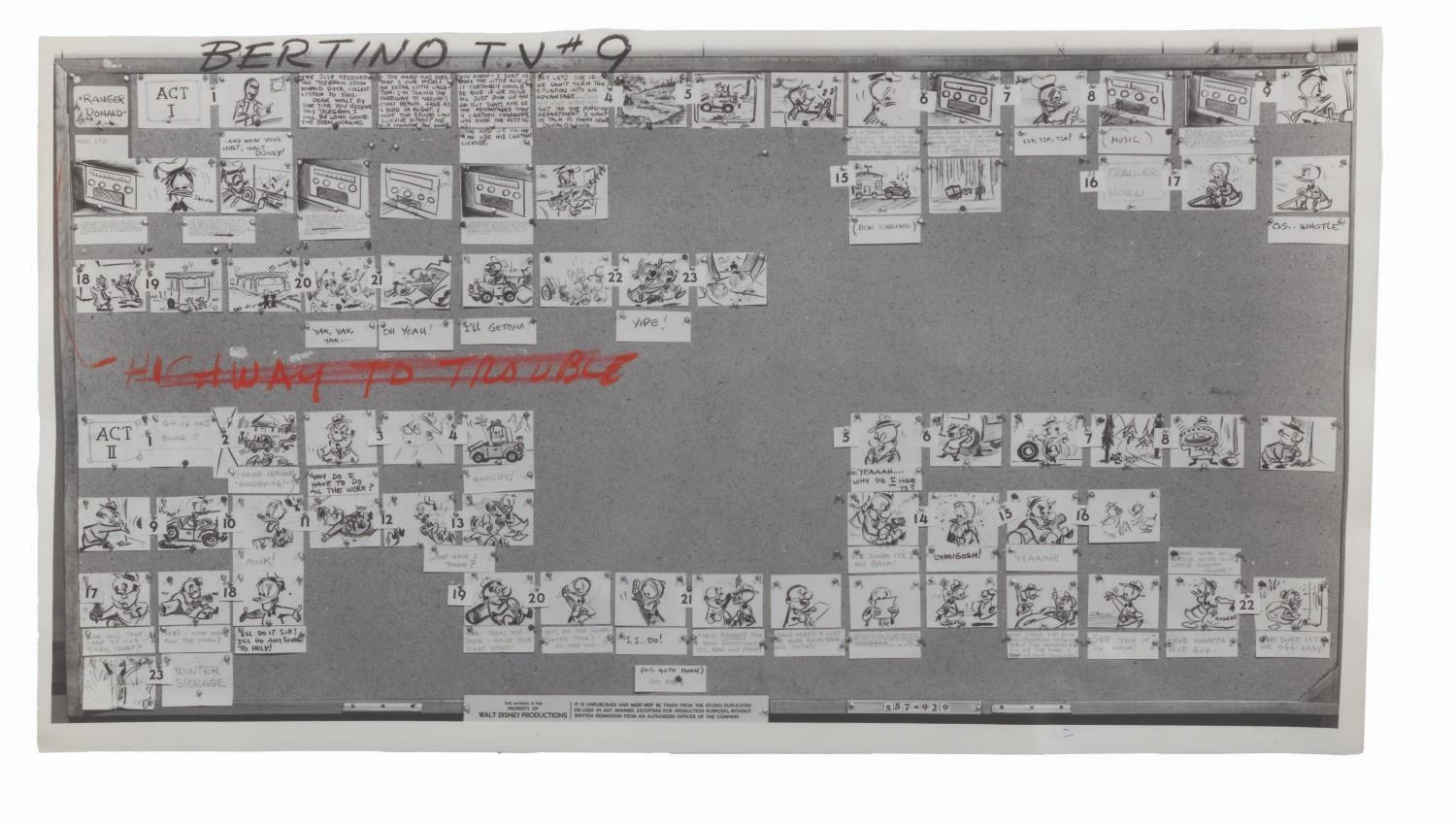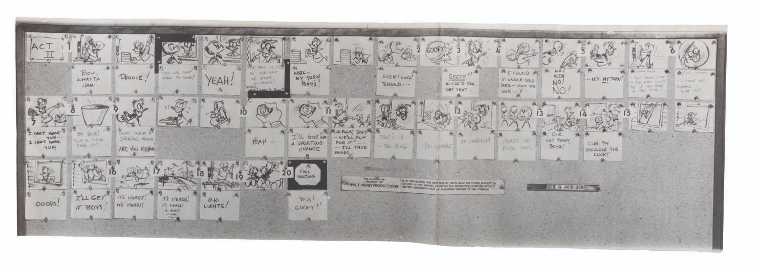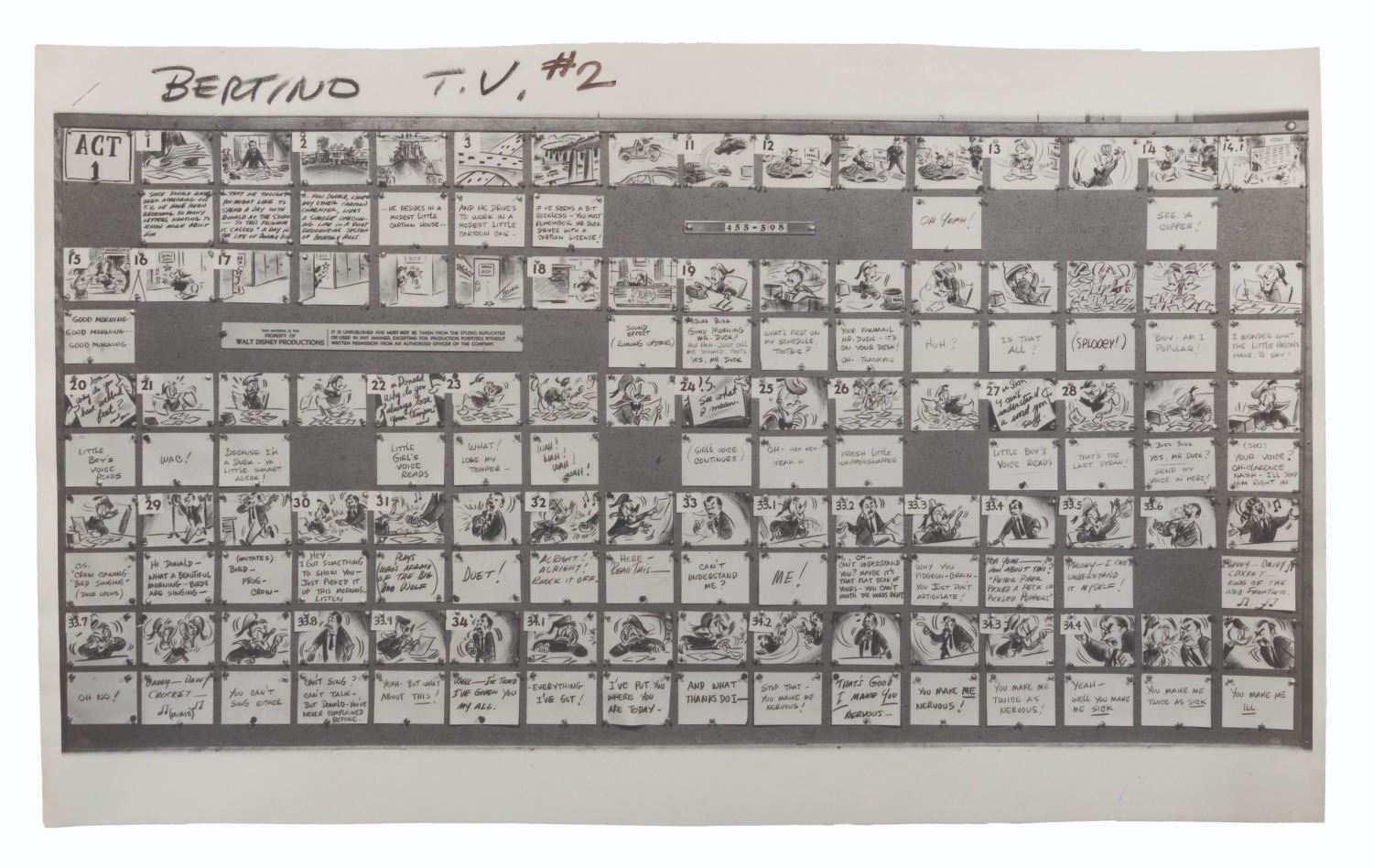 (Disney, 1956-1960) A collection of 22 production-used photostat storyboards from six episodes of the “Disneyland” and “Walt Disney Presents” anthology series, each starring Donald Duck. Included are the complete sets for episodes “At Home with Donald Duck,” “Duck Flies Coop,” and “Duck for Hire.” Also included are incomplete sets of photostats for “A Day in the Life of Donald Duck,” “Highway to Trouble,” and “This is Your Life, Donald Duck.” Ranging in size from 9” x 17” to 9” x 29”, the photostats are in good condition with edge wear, light warping, pinholes from production use, folds, and notations in grease pencil.