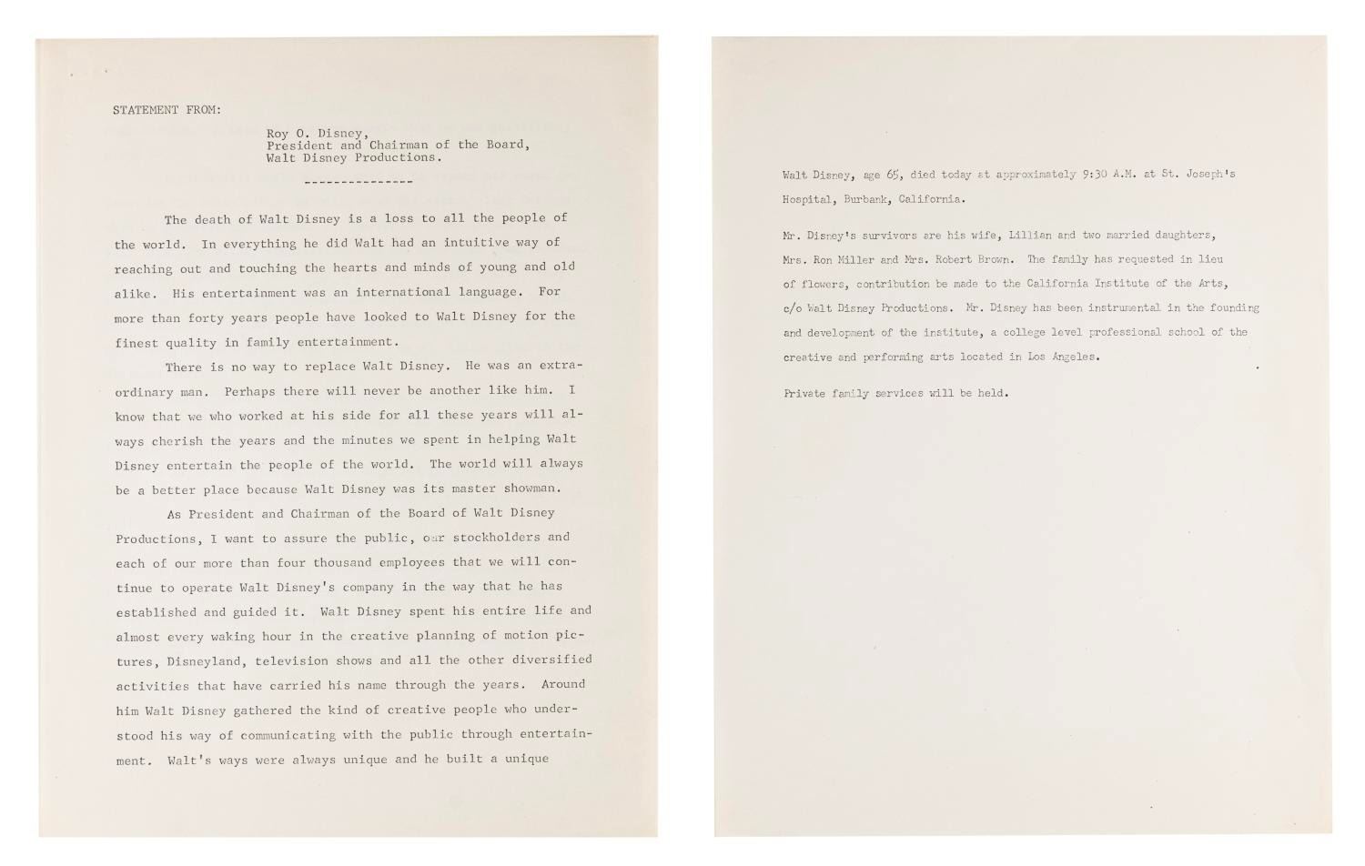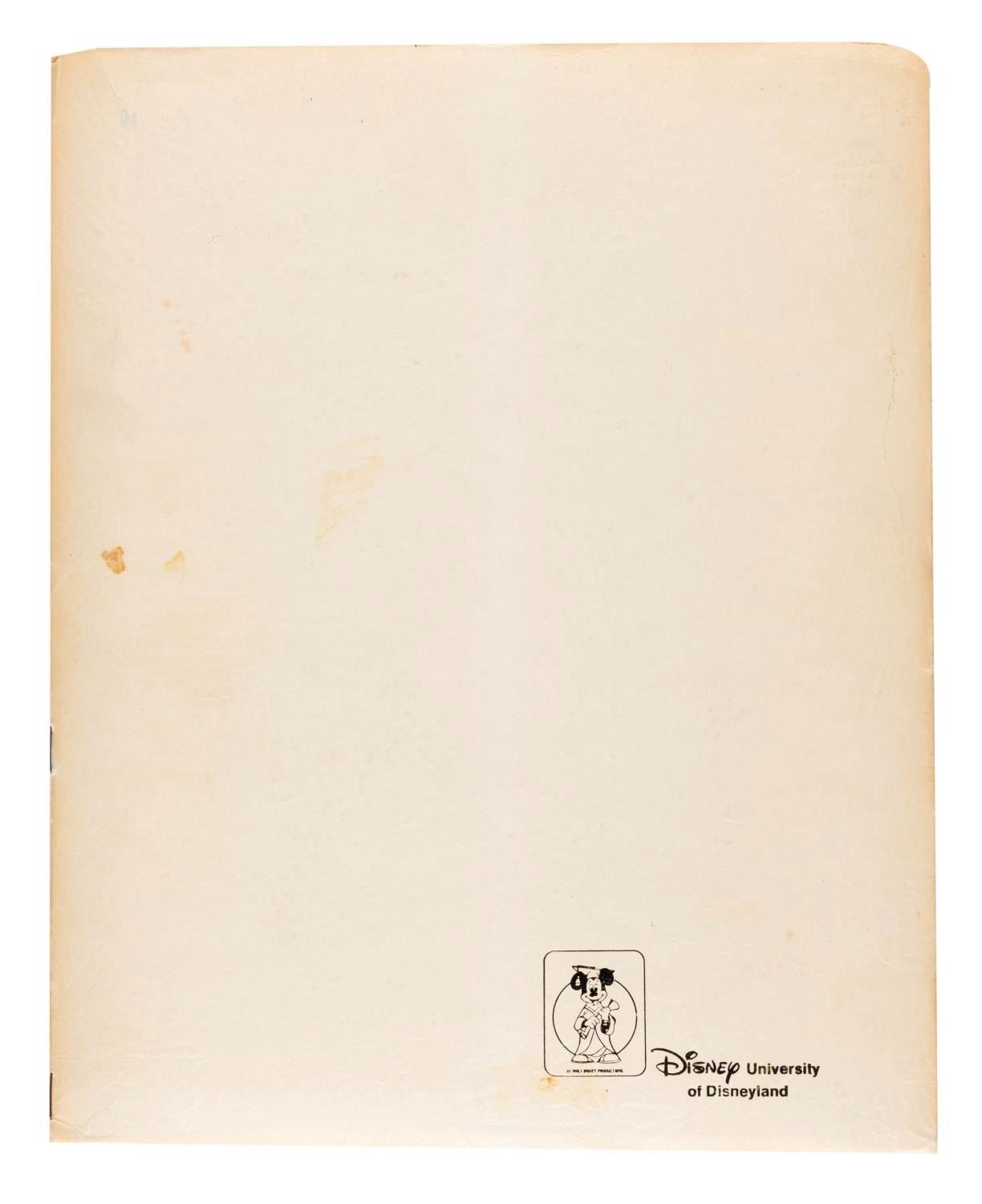 (Disneyland, 1960s-90s) A Disney University folder full of hiring and history documents from Disneyland. Included are brochures and xeroxed copies relating to working at Disneyland that date from 1971 through 1990. Historical copies include a 1966 overview of New Orleans Square, biography of Walt Disney, and the press release and Roy O. Disney’s statement upon Walt’s passing. Also included is a four page list of the opening of Disneyland attractions in chronological order up until 1974, with a cover memo signed by Disney Archivist Dave Smith. Measuring 9.25” x 11.75”, the folder is in fair condition with stains and wear. The documents and brochures measure 8.5” x 11” and smaller, and are in good to fine condition, with typical wear from use.