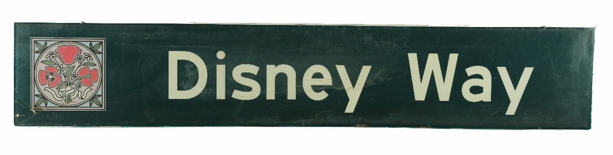 (Disneyland, 2000) Large vinyl laminated street sign for Disney Way at the Disneyland resort. Measures 95"x17.5". The sign shows lots of wear from its time exposed to the elements but still presents itself well.