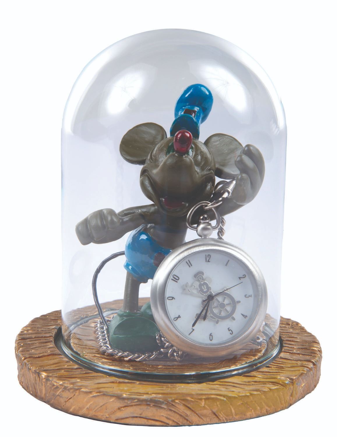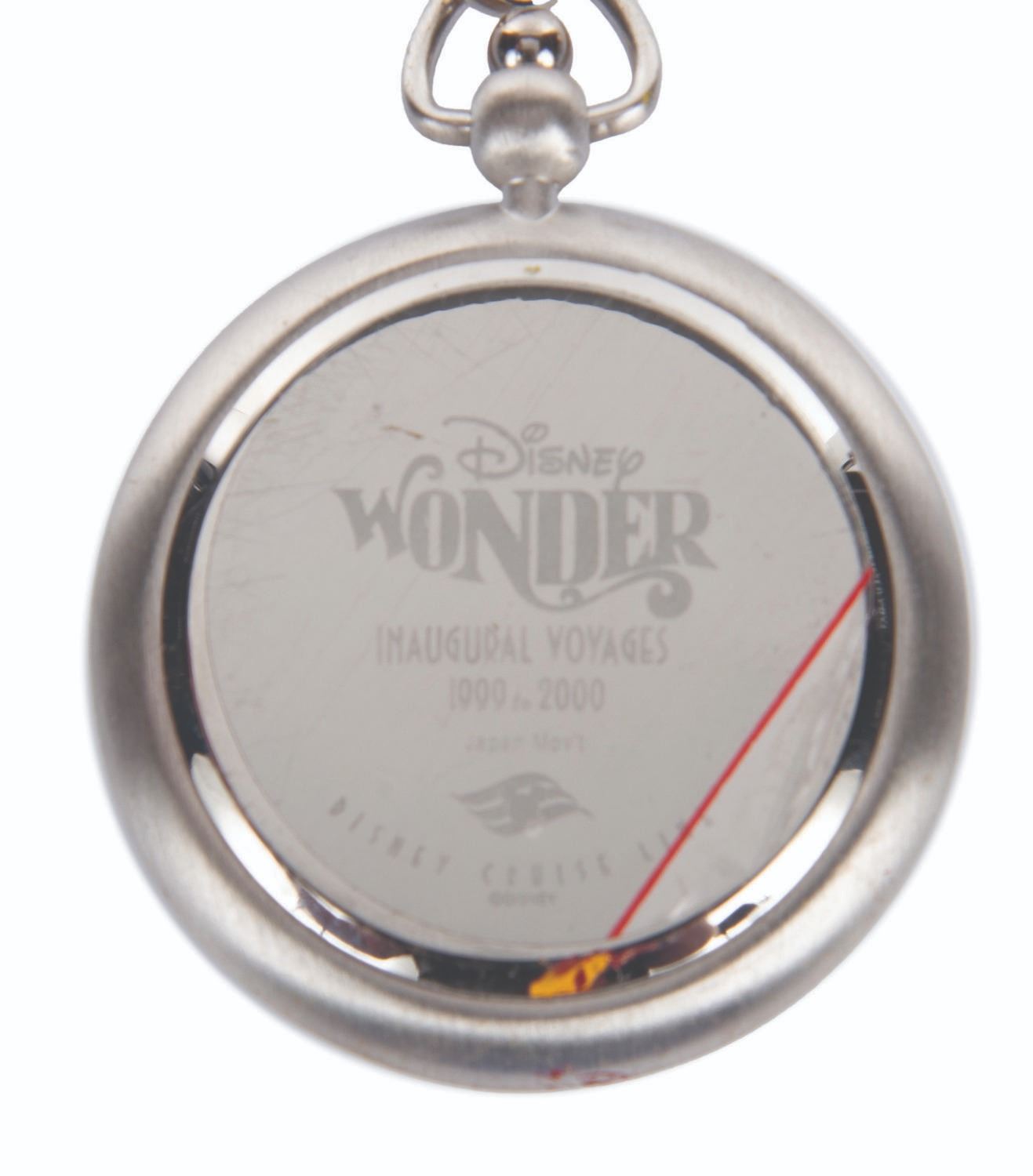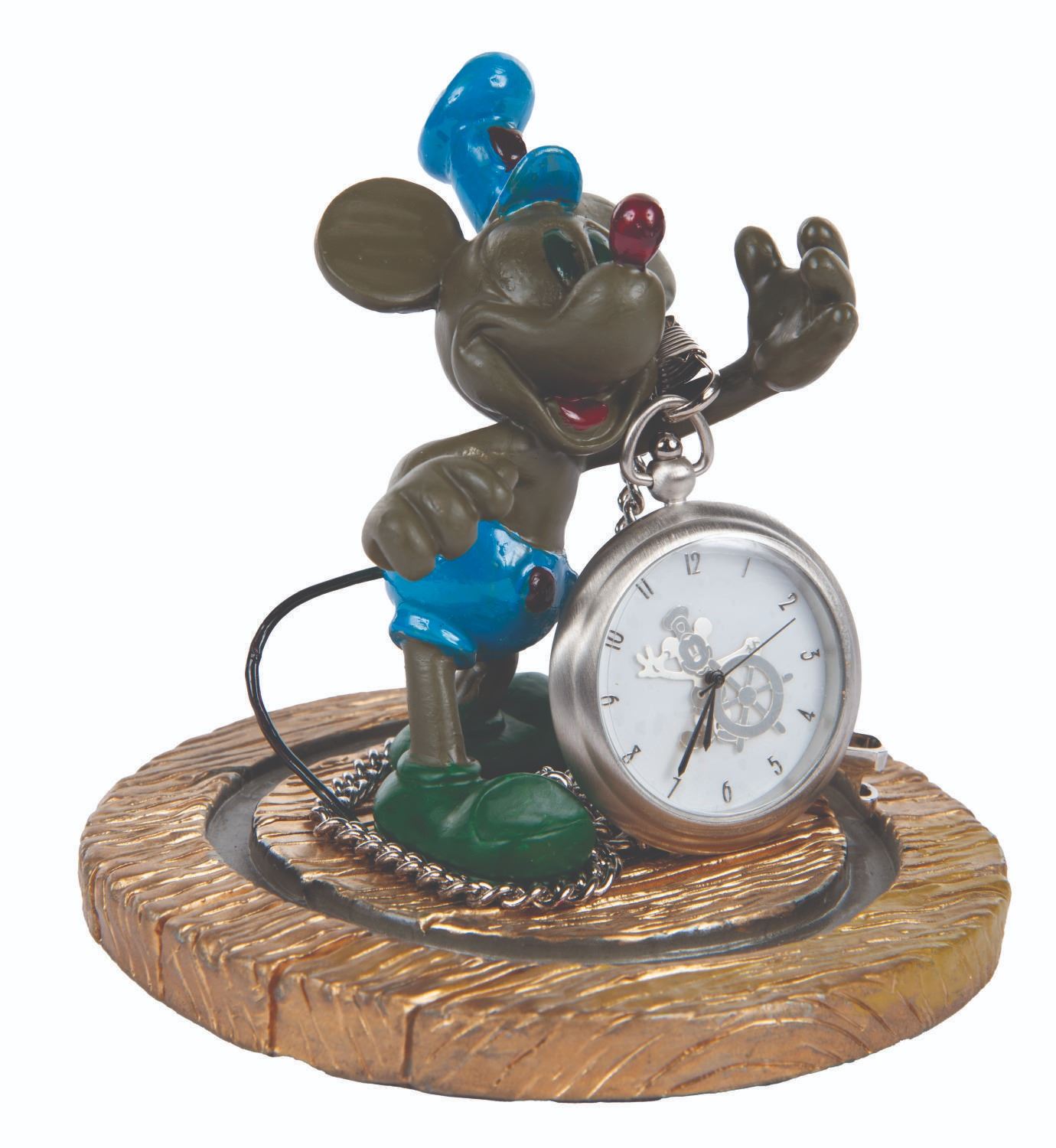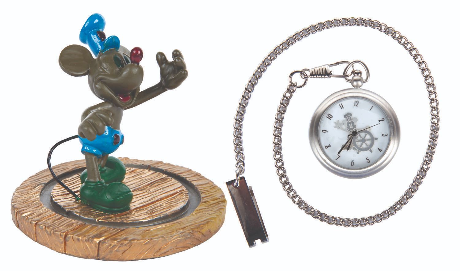 (Disney Cruise Line, 1999-2000) A pocket watch and figural display celebrating the inaugural voyages of the Disney Wonder and featuring Mickey Mouse as he appeared in "Steamboat Willie." The 2" in diameter (including bezel) watch with a 14.5" chain is in very good condition with slight scuffs, while the 4" figure under a 5" glass dome display in fine condition.