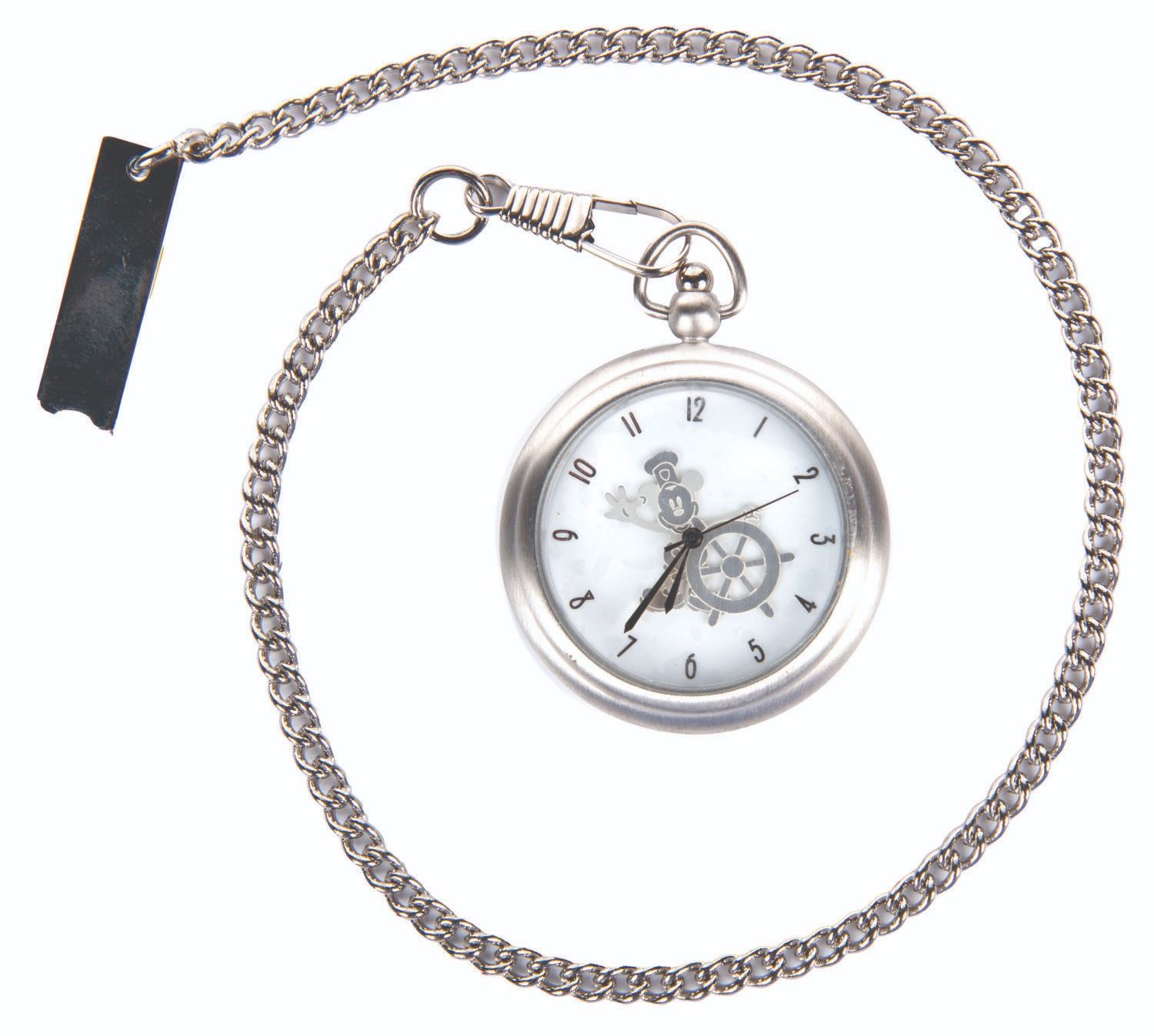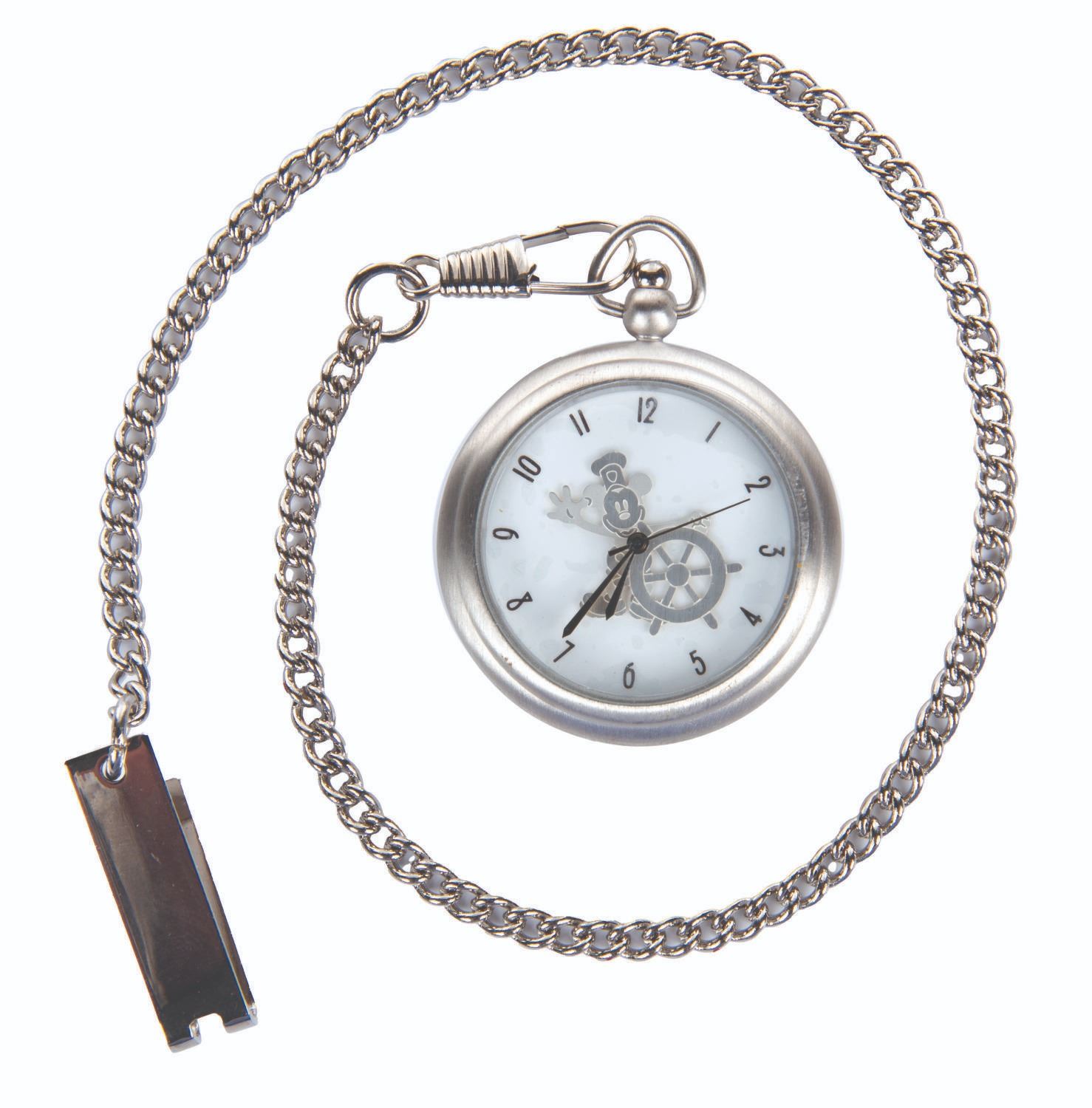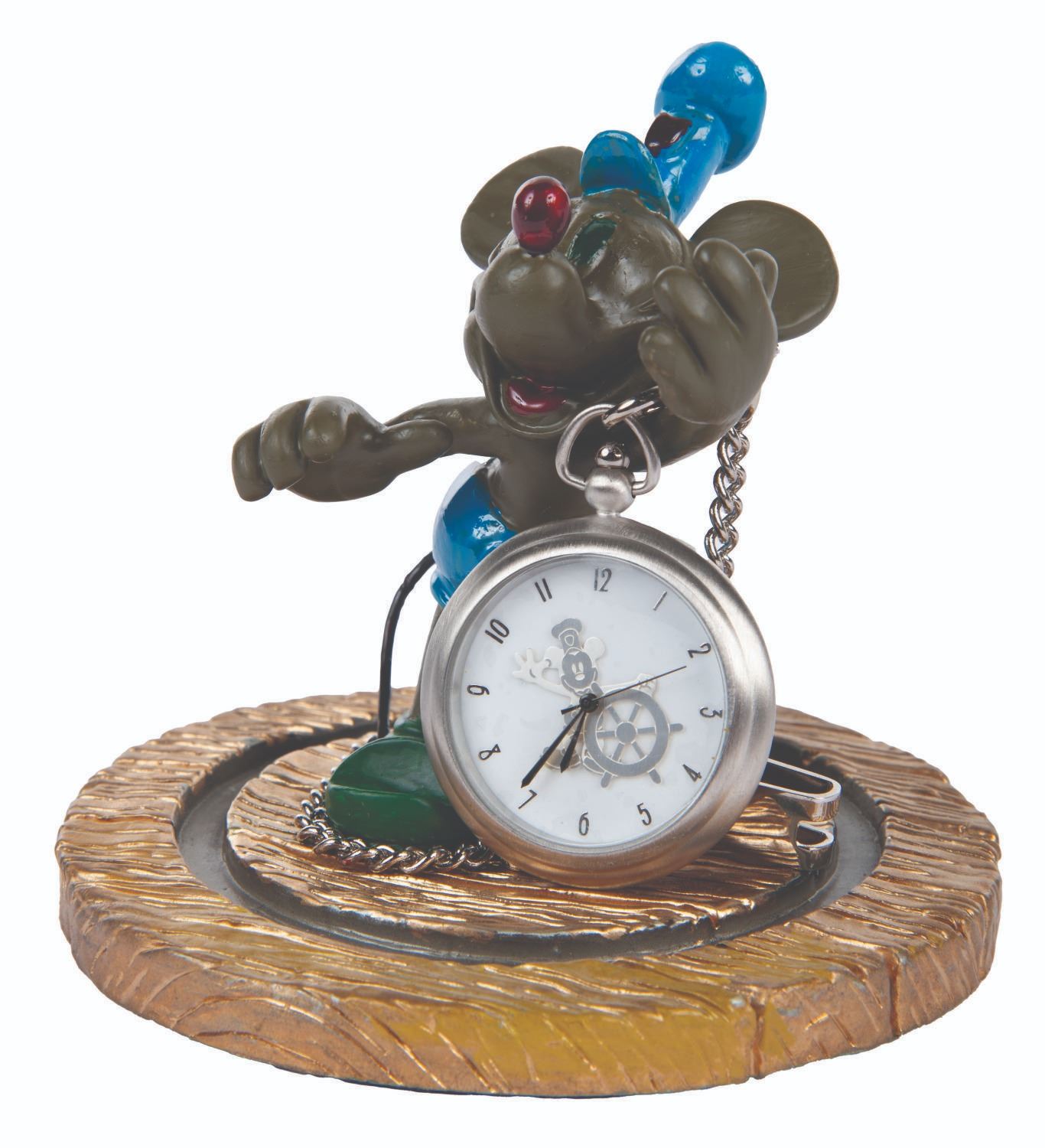 (Disney Cruise Line, 1999-2000) A pocket watch and figural display celebrating the inaugural voyages of the Disney Wonder and featuring Mickey Mouse as he appeared in "Steamboat Willie." The 2" in diameter (including bezel) watch with a 14.5" chain is in very good condition with slight scuffs, while the 4" figure under a 5" glass dome display in fine condition.