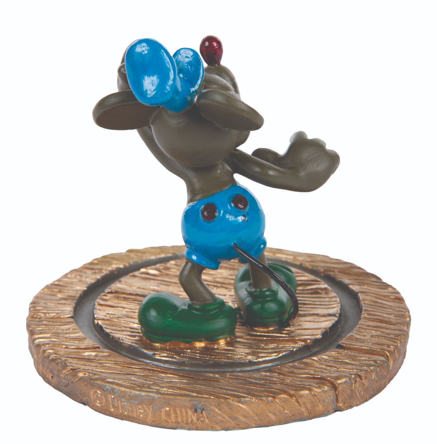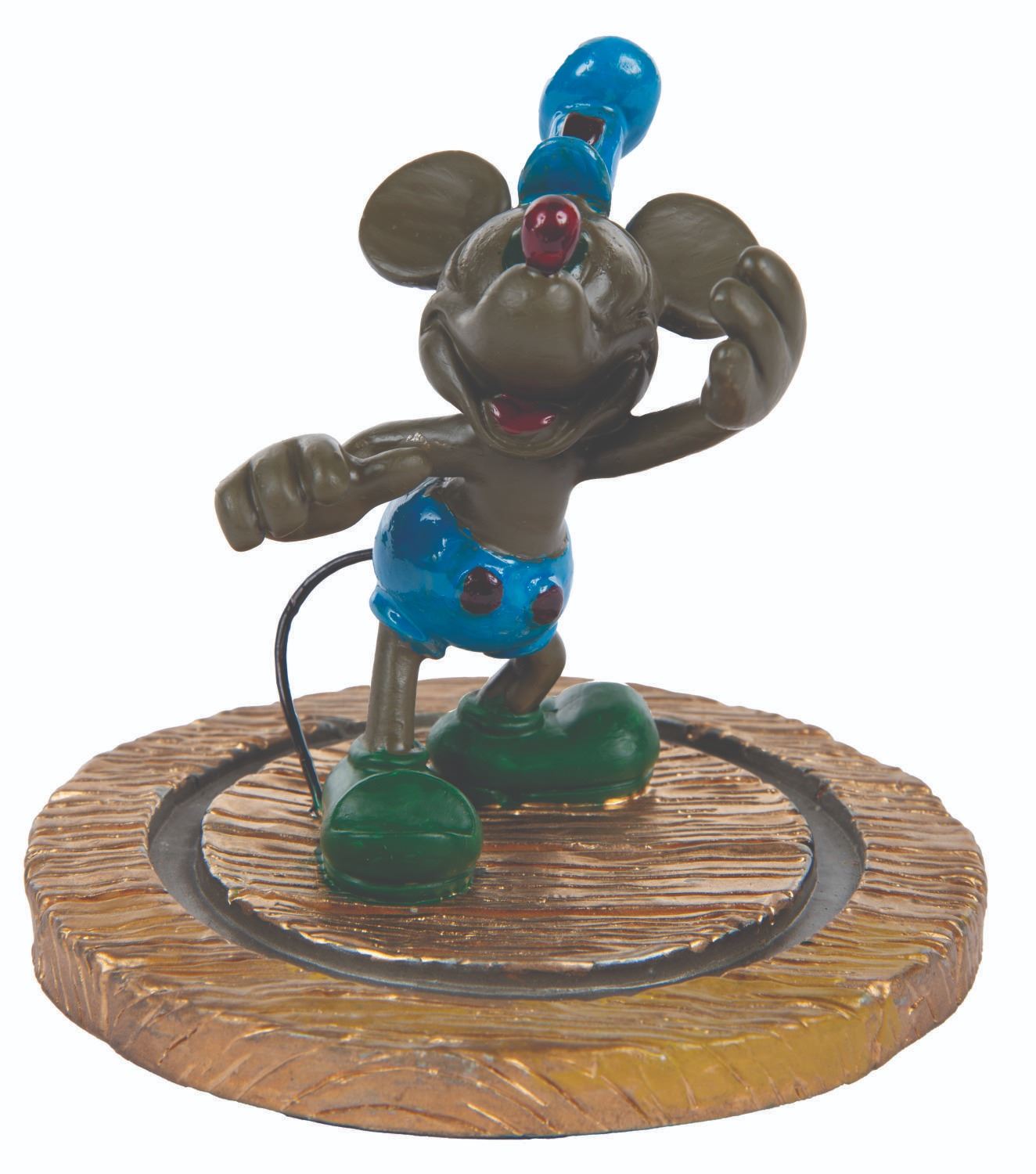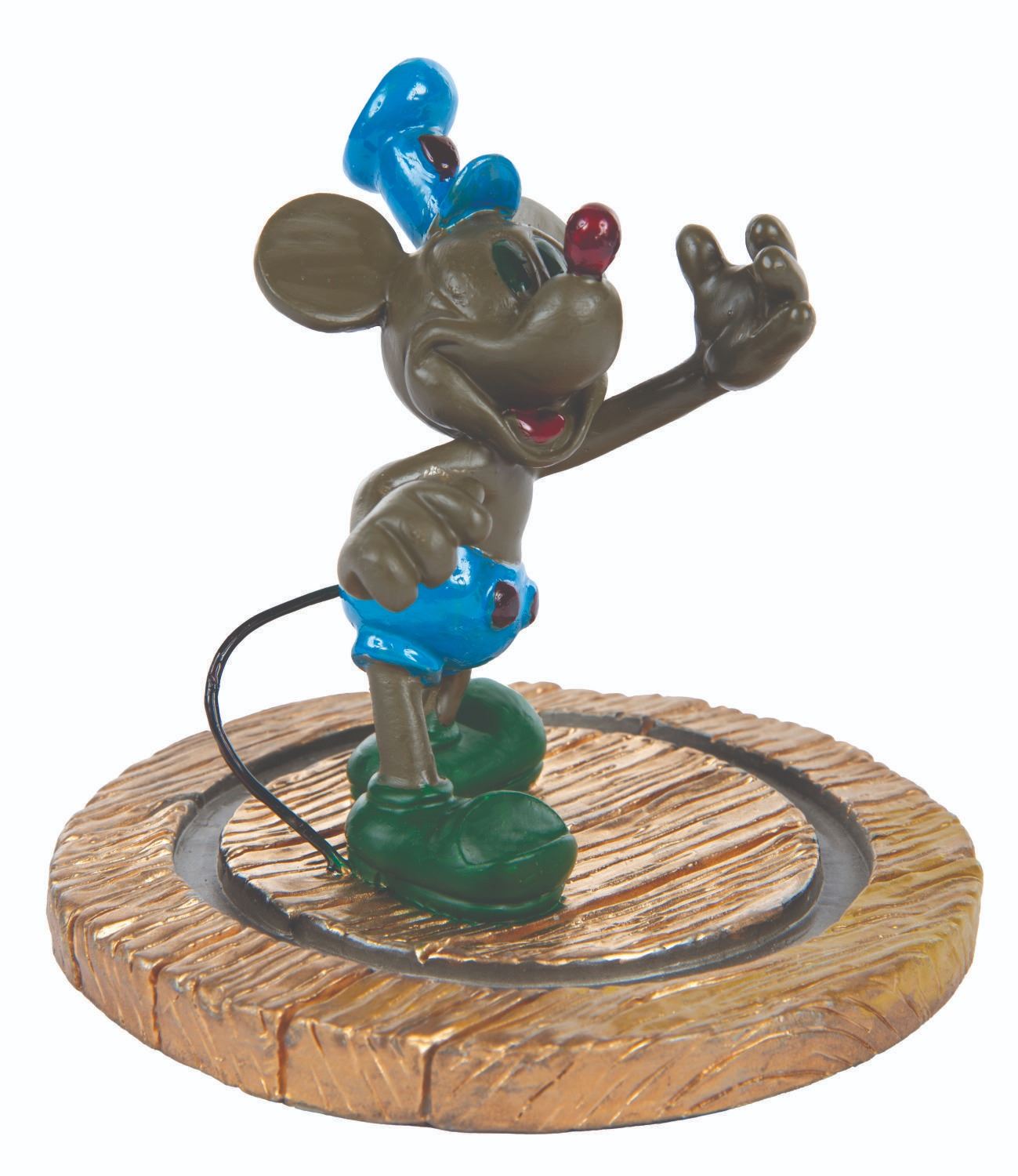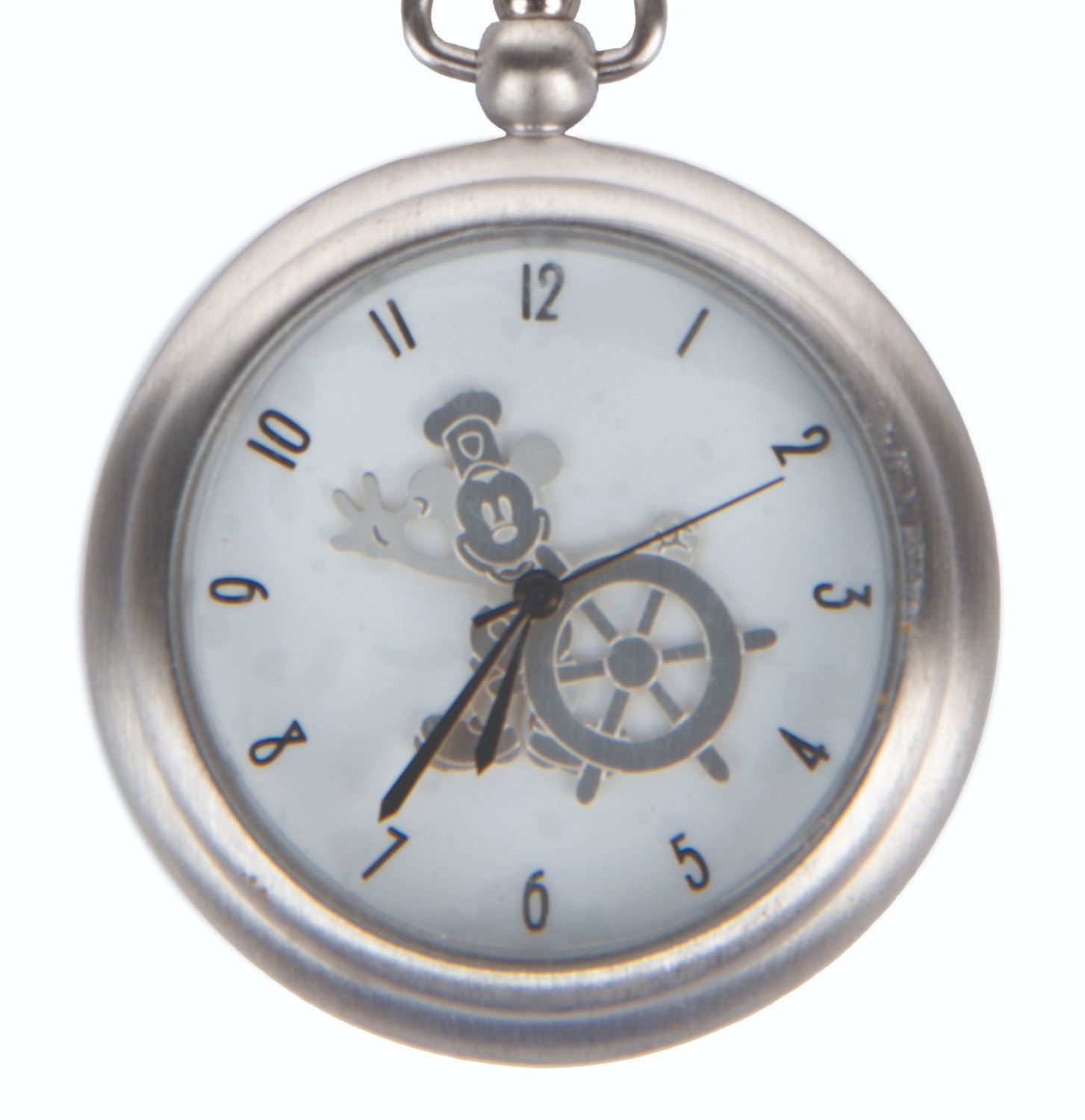 (Disney Cruise Line, 1999-2000) A pocket watch and figural display celebrating the inaugural voyages of the Disney Wonder and featuring Mickey Mouse as he appeared in "Steamboat Willie." The 2" in diameter (including bezel) watch with a 14.5" chain is in very good condition with slight scuffs, while the 4" figure under a 5" glass dome display in fine condition.