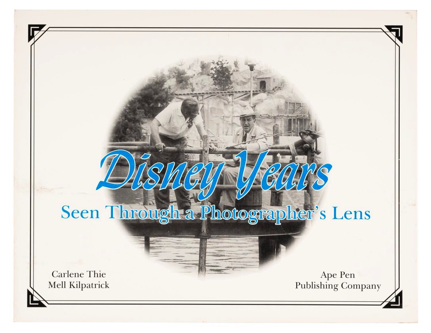 (Ape Pen, 2002) A first edition of Disney Years Seen Through a Photographer’s Lens book, signed on the title page and numbered 242/1000 by author Carlene Thie. The book features photographs by Mell Kilpatrick from the early days of the Park. Measuring 8.5” x 11”, the signed book is in good condition with light stains and wear.