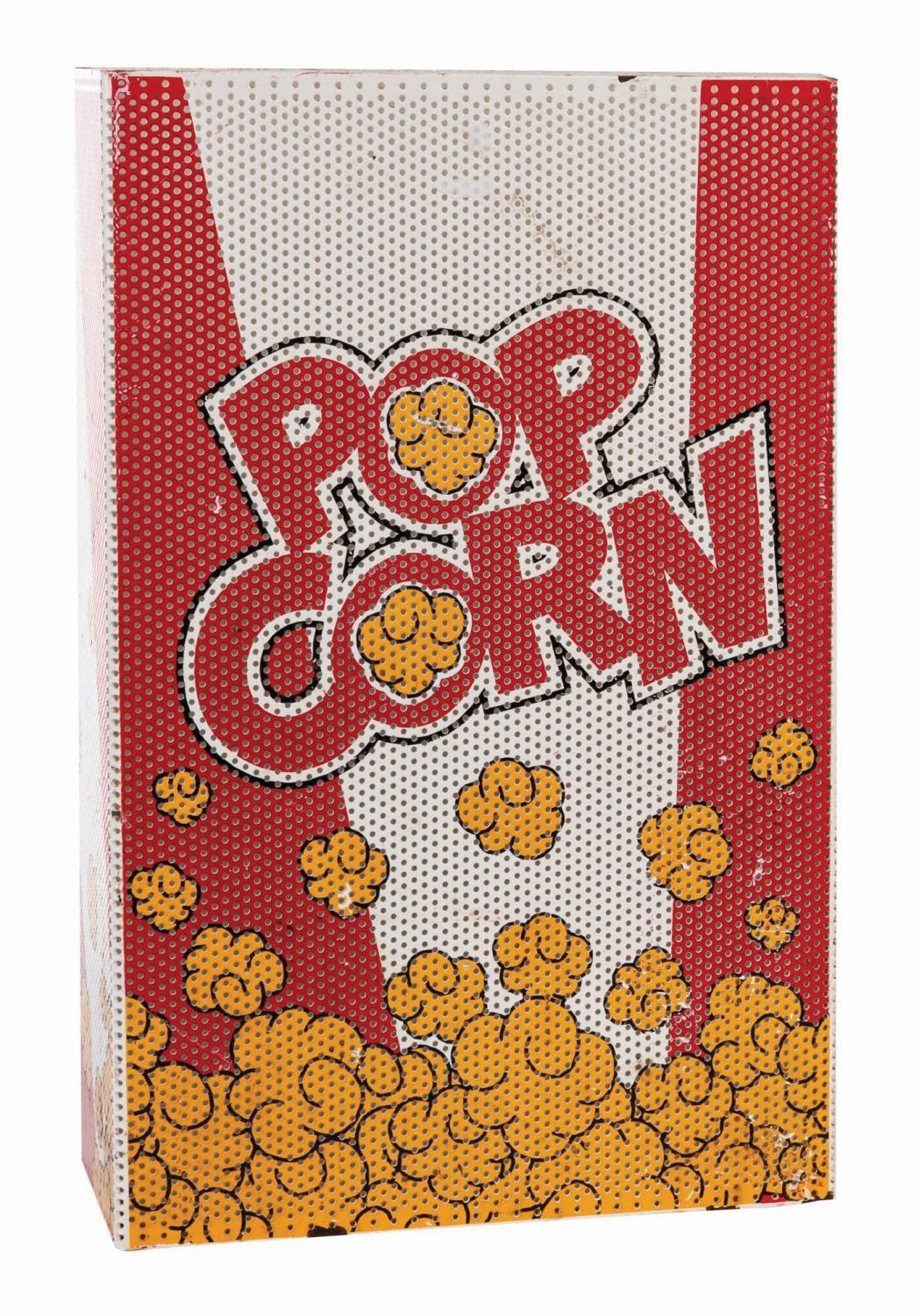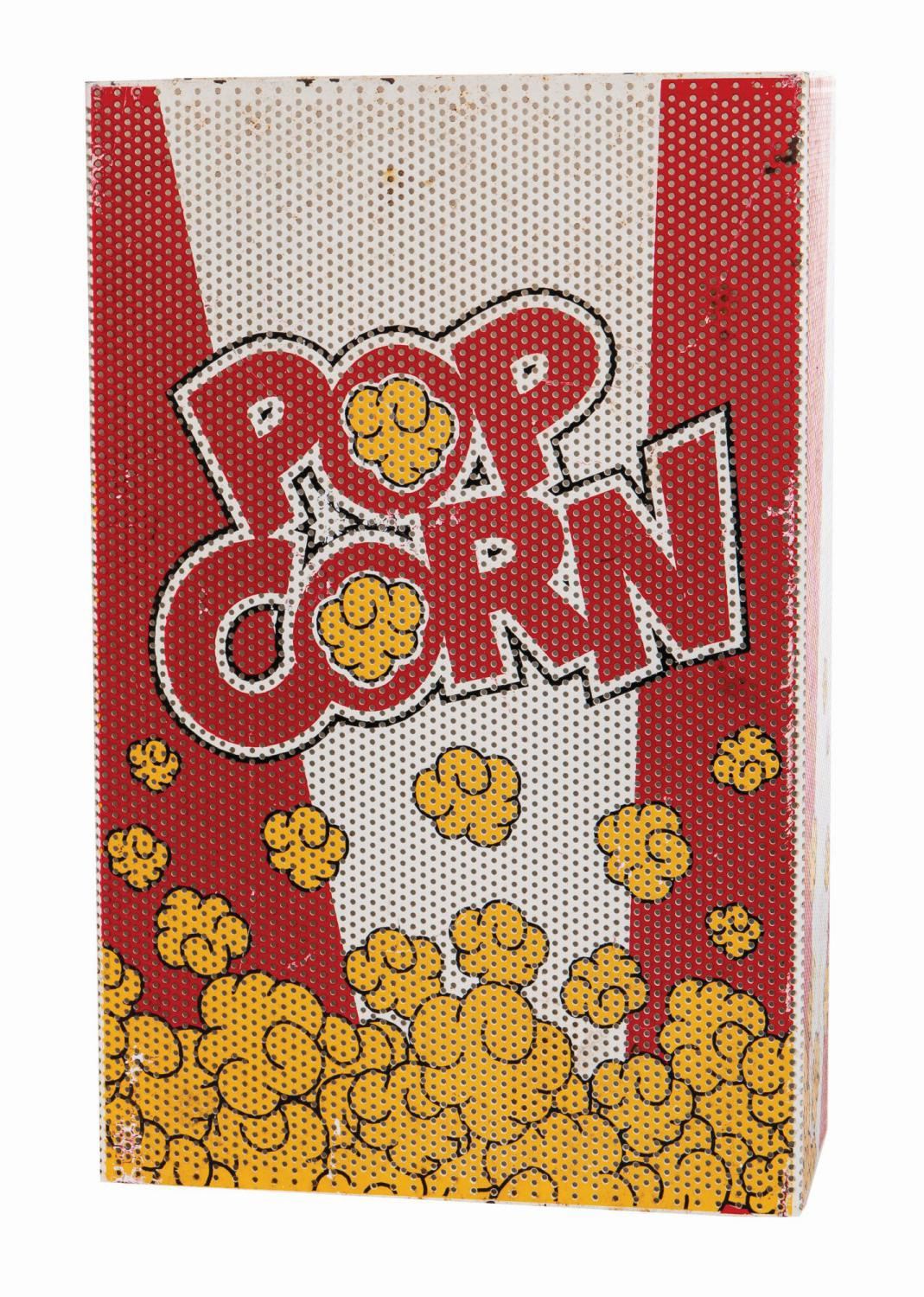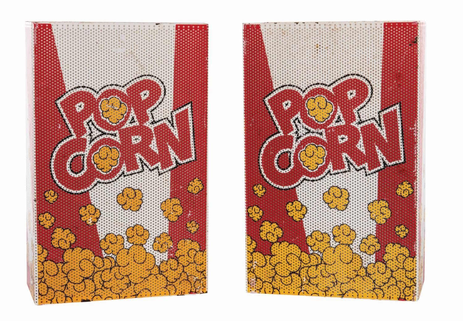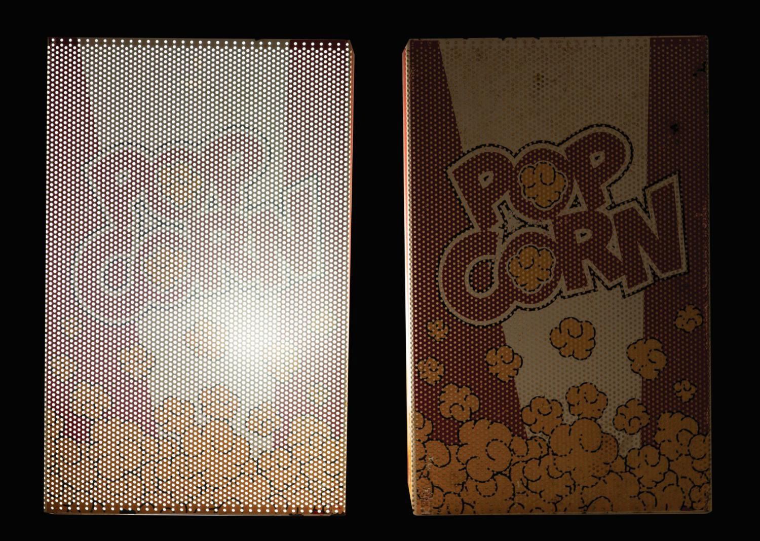 (Disney's All-Star Resort, 2000s) A pair of popcorn box wall lamps from Disney's All-Star Resort. The popcorn imagery of the original wall-mounted fixtures was "illusioneered" to disappear when the lamp sconces are plugged in. The movie theater inspired lamps were removed during a previous c.2013 rehabilitation of the resort hotel, with original wiring still attached. Measuring 9.5"x15" and 5" wide, the lamps are in very good condition.