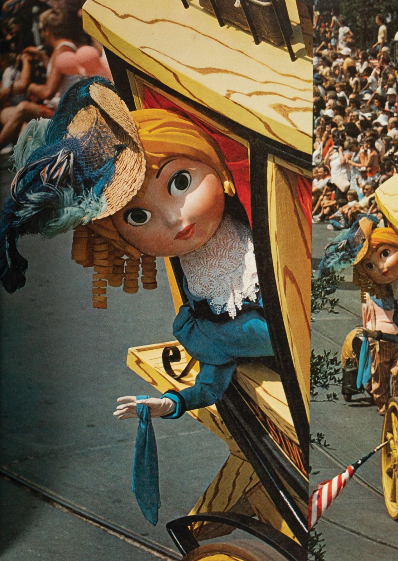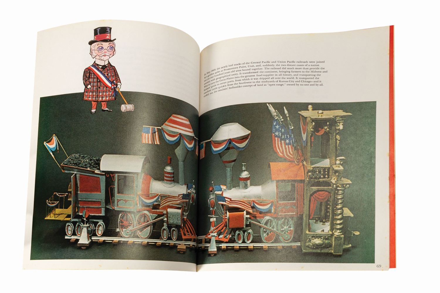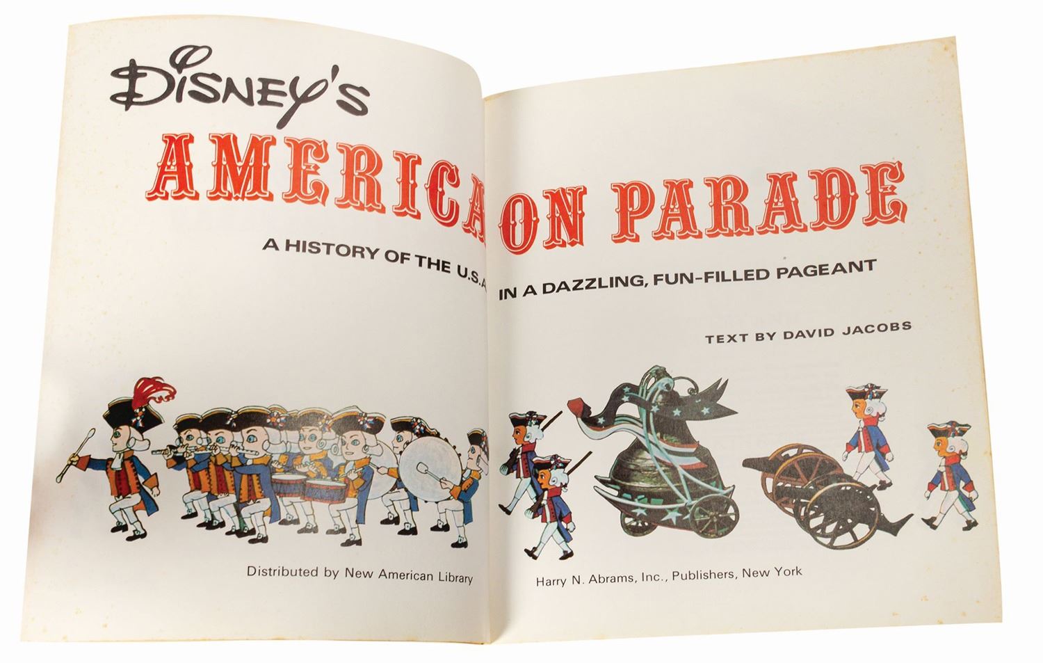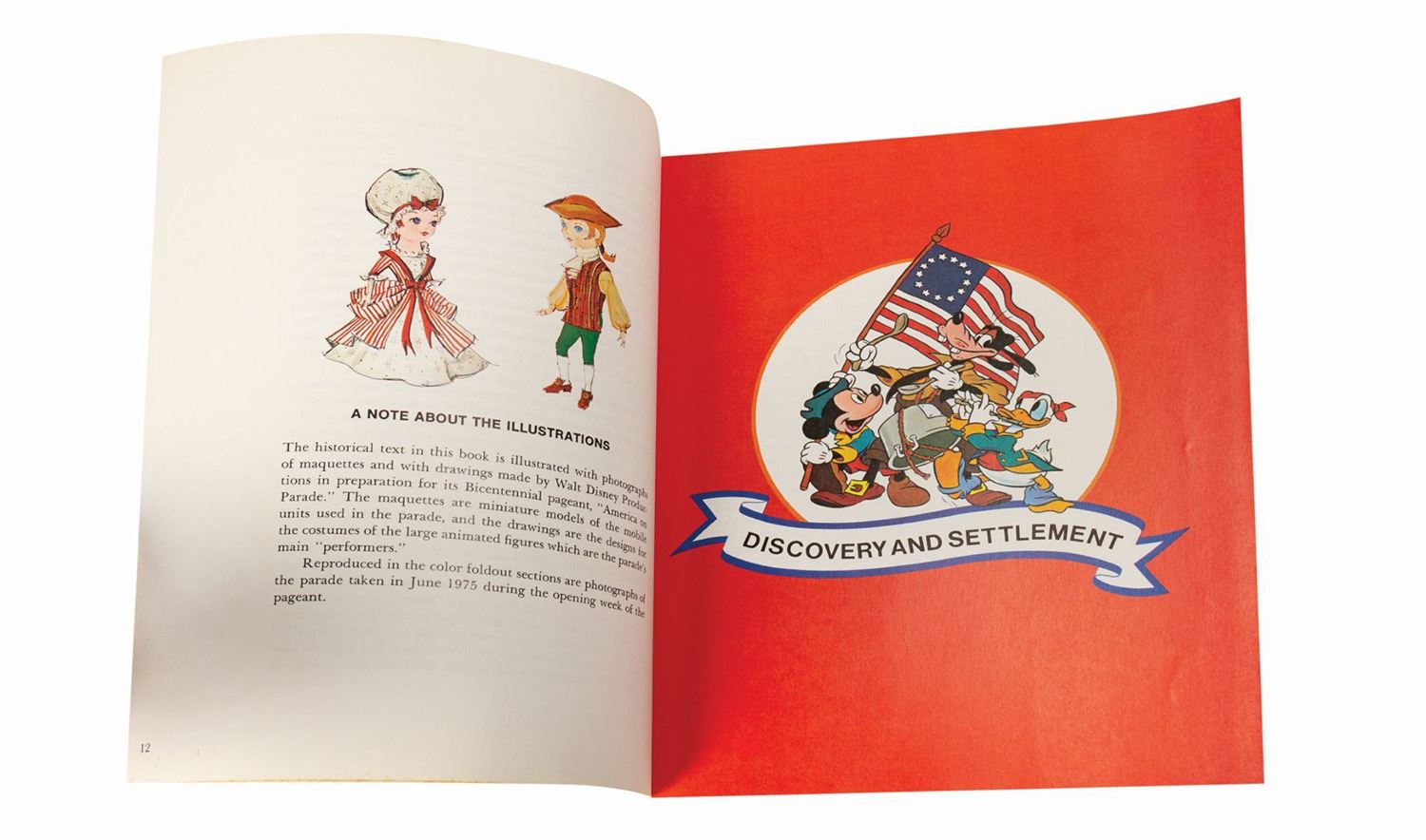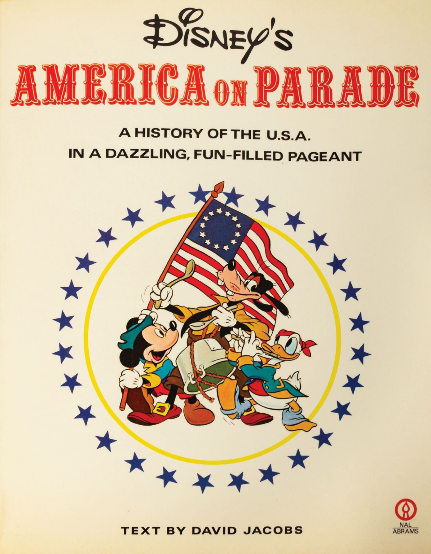 (Disney, 1975) A softcover edition of "Disney's America on Parade: A History of the U.S.A. in a Dazzling, Fun-Filled Pageant." Written by David Jacobs, the book provides a primer on American history looking back from the perspective of the bicentennial, and is illustrated with imagery from Disneyland, including park attractions, animated characters, Imagineering concept drawings and models, parades, and more. The 143-page book measures 11"x8.75" and is in good condition, exhibiting browning to covers and some foxing to text block.
