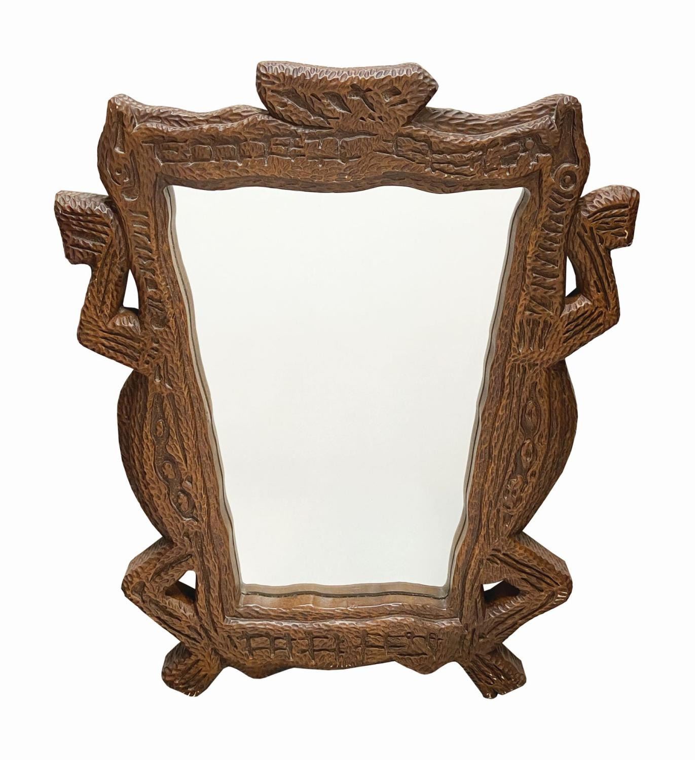 (Animal Kingdom, 2000) An African art-inspired guestroom mirror prop from Disney's Animal Kingdom Lodge at the Walt Disney World Resort. The intricate frame is constructed of cast resin expertly sculpted and painted to appear as wood carved by an indigenous artisan, and the glass mirror is backed with wooden board. The reverse of the frame retains the date ink stamp, "April 14 2000." Measuring 41.75"x35.75" and 2" deep, the piece is in very good condition with minor nicks and spot paint loss from resort use and removal. This item may require special shipping arrangements, please inquire for details and estimates.