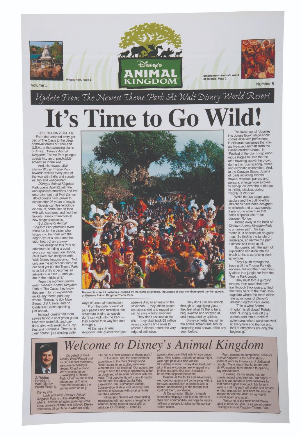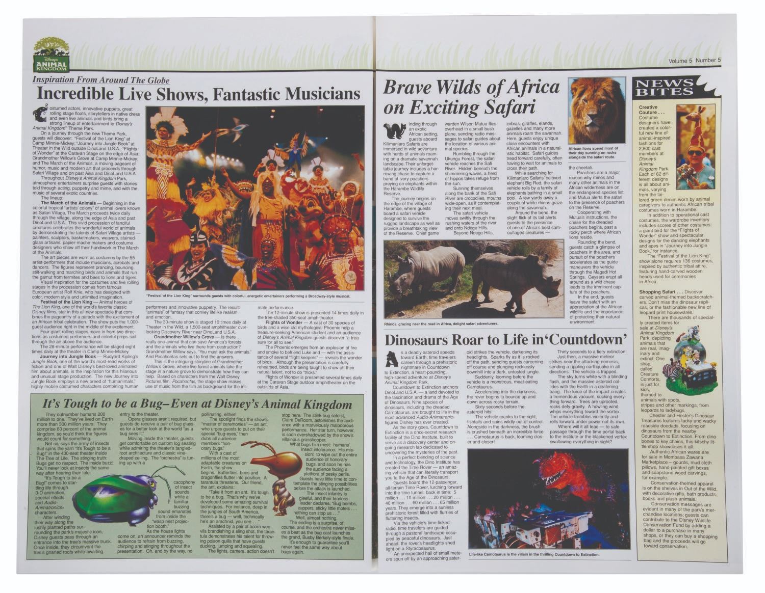 (Disney's Animal Kingdom, 1998) The Animal Kingdom newsletter gives an update from the newest theme park at Walt Disney World. The content spotlights the attractions, cast members, festivals, and other events occurring around seven areas including the Conservation Station, supplemented with classifieds. Measuring 17"x11", the periodical is in good overall condition, exhibiting sight wear to edges and corners.