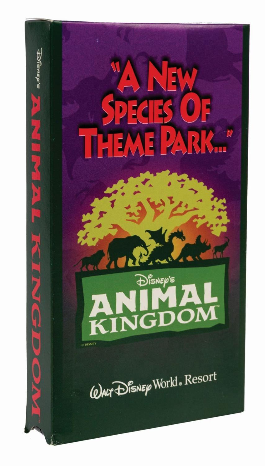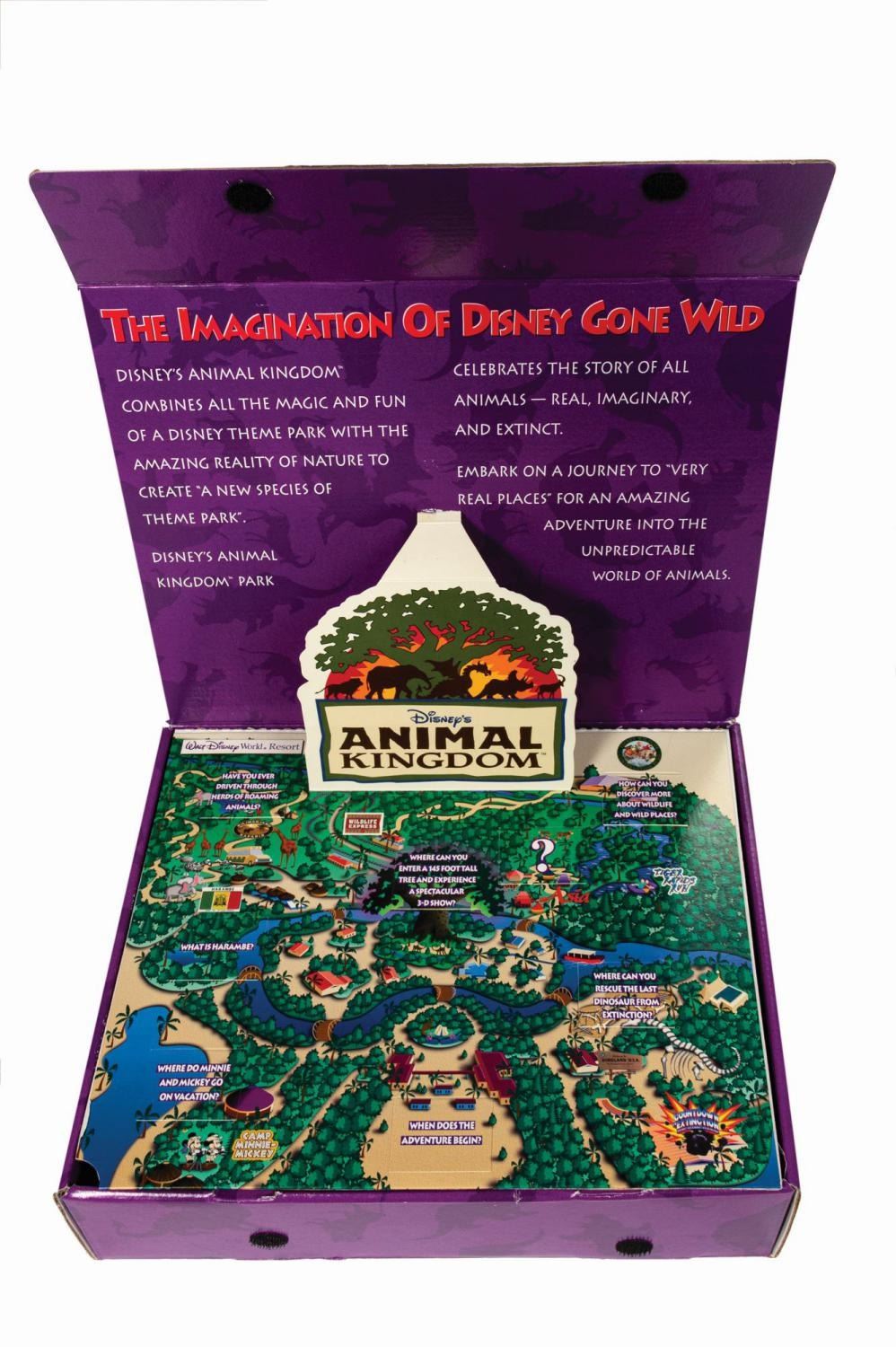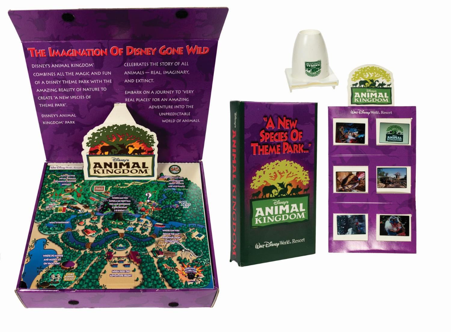 (Animal Kingdom, 1998) A rare vintage press kit issued in advance of the grand opening of Disney's Animal Kingdom. Contained in a cardboard box with a dinosaur, dragon, and animal silhouette pattern background, the flap opens to reveal a die-cut pop-up park logo and stylized map of the park. The map conceals an inner compartment with a promotional VHS tape, a 6-page brochure, an Animal Kingdom branded slide viewer, and a set of (6) color 35mm slides depicting park attractions. Measuring 9.75"x11.75" and 3" deep, the kit is in very good condition with some surface and edgewear to the box and some black streaks to the slide viewer case (likely a manufacturing issue).