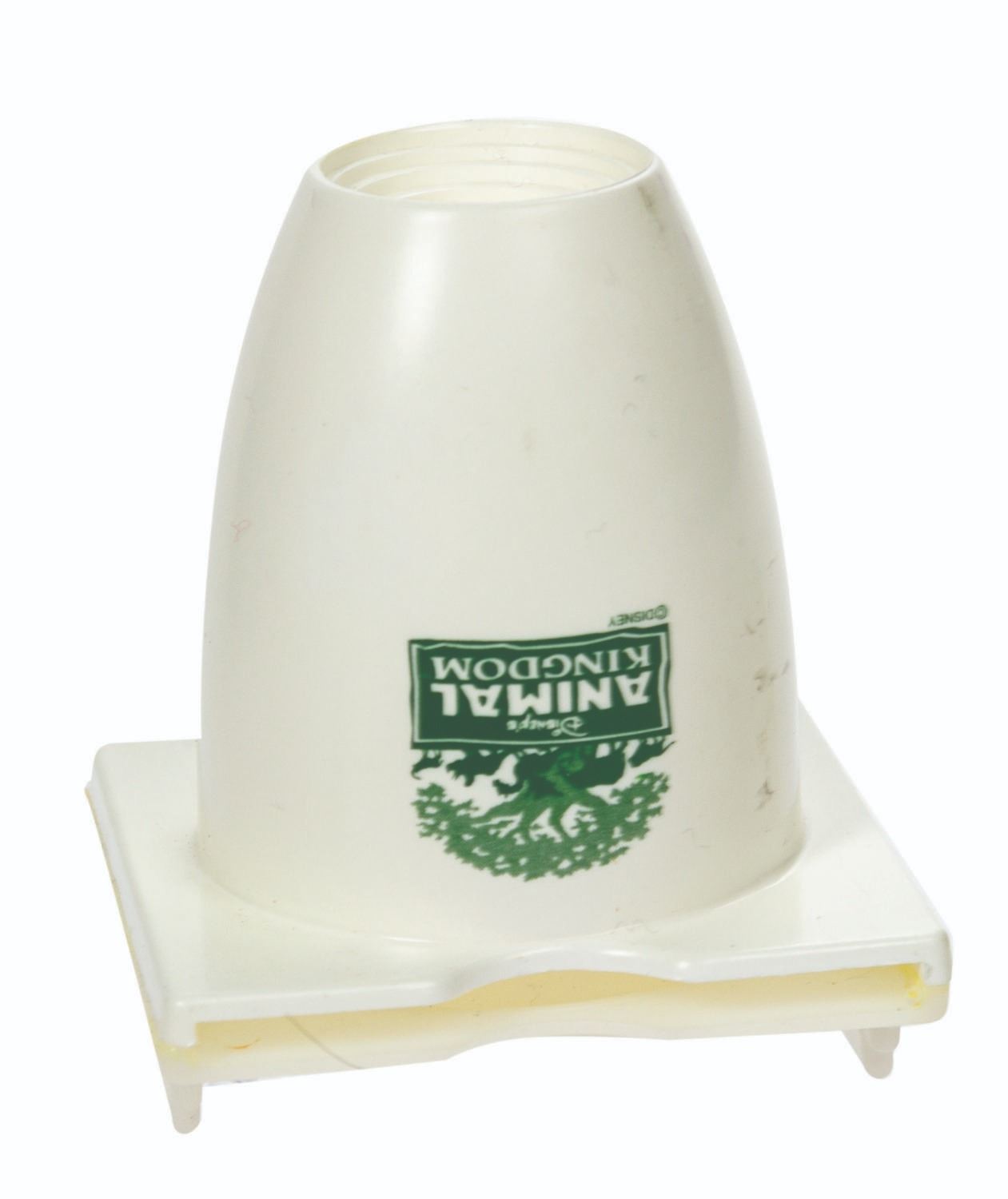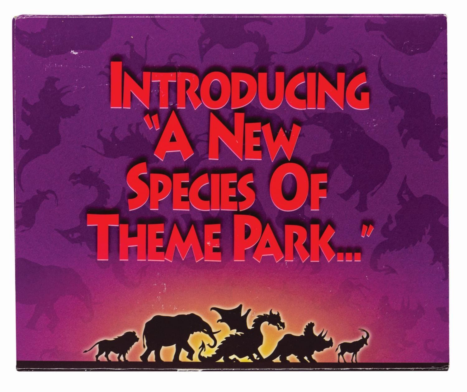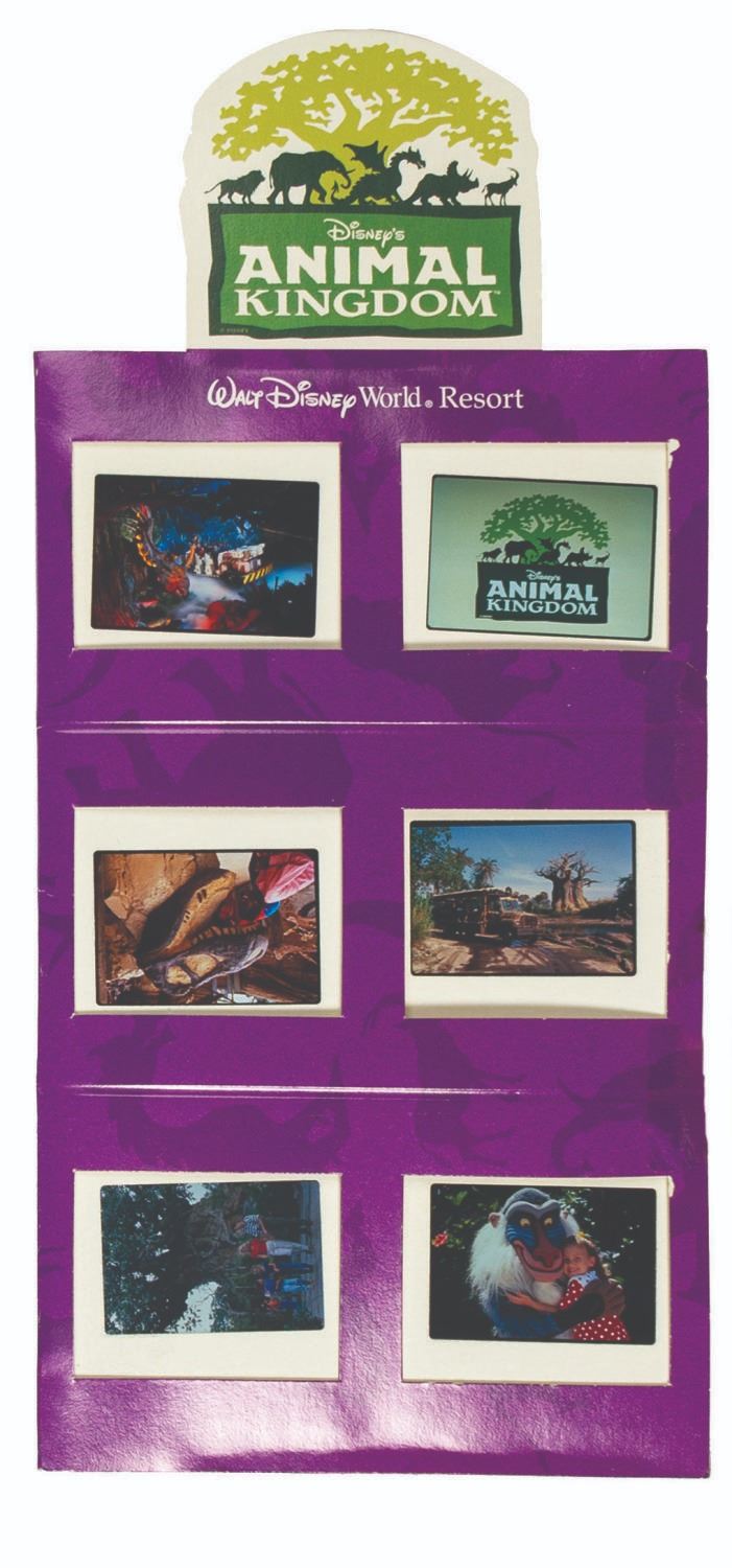 (Animal Kingdom, 1998) A rare vintage press kit issued in advance of the grand opening of Disney's Animal Kingdom. Contained in a cardboard box with a dinosaur, dragon, and animal silhouette pattern background, the flap opens to reveal a die-cut pop-up park logo and stylized map of the park. The map conceals an inner compartment with a promotional VHS tape, a 6-page brochure, an Animal Kingdom branded slide viewer, and a set of (6) color 35mm slides depicting park attractions. Measuring 9.75"x11.75" and 3" deep, the kit is in very good condition with some surface and edgewear to the box and some black streaks to the slide viewer case (likely a manufacturing issue).