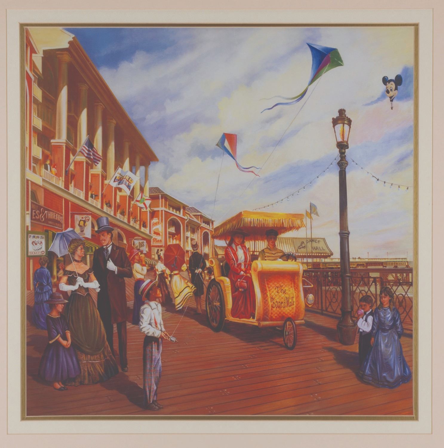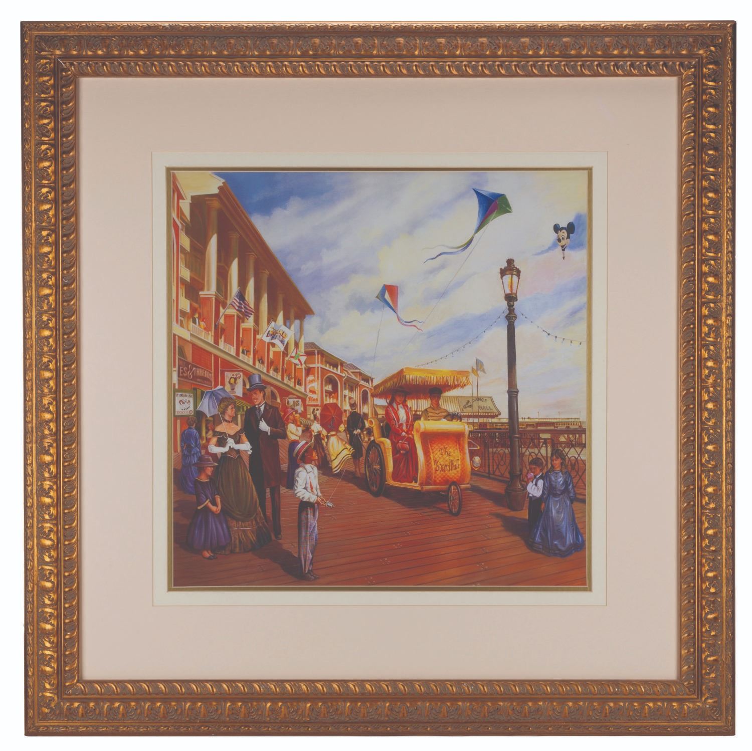 (Disney’s BoardWalk Resort, 2000s) A framed print from Disney’s BoardWalk Resort in Walt Disney World. This art was displayed on the wall next to a bed in a concierge-level room at the Resort. With an image size of 21.5” x 21.5” on a 32.5” x 32.5” matte in an elegant 37.5” x 37.5” glassless frame, the piece is in very good condition with light wear from Resort use.