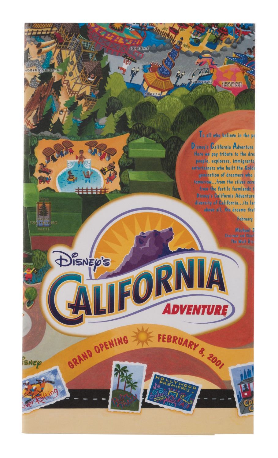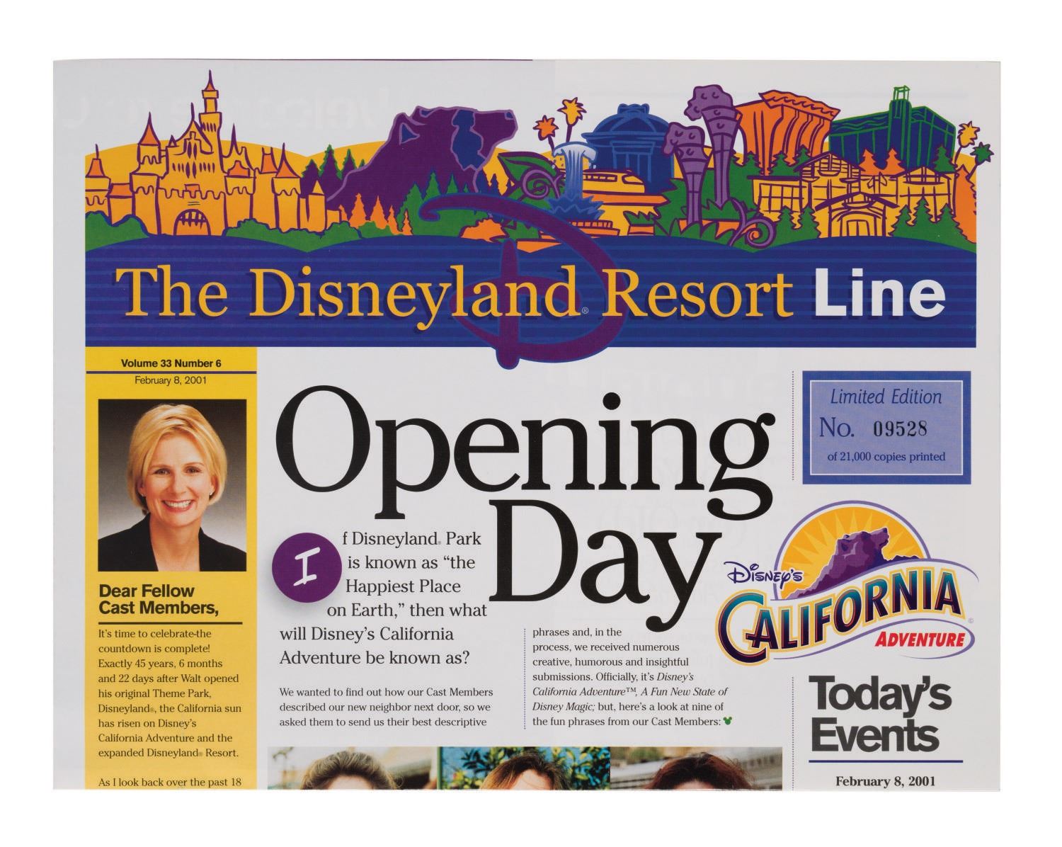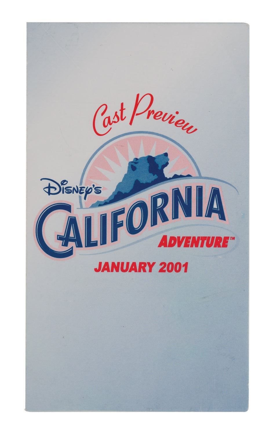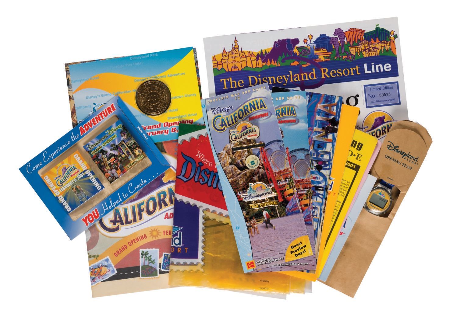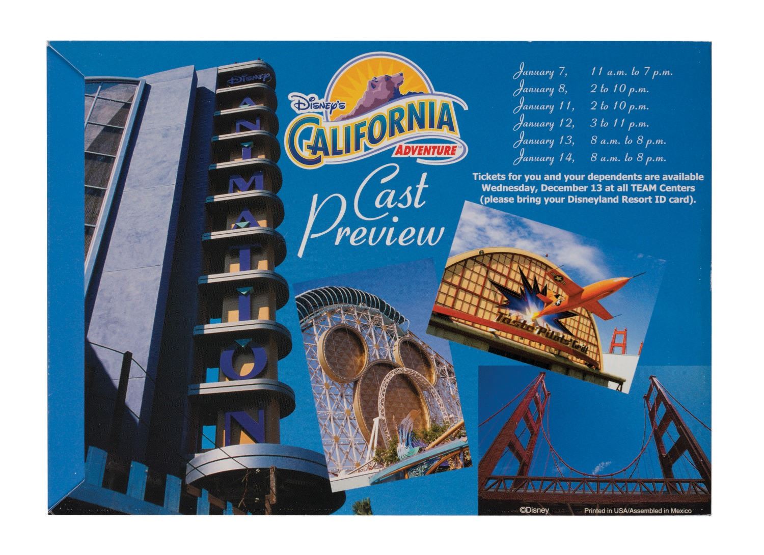(Disney's California Adventure, 2001) A collection of (16) pieces of memorabilla commemorating Disney's California Adventure. Among the lot are several rare Cast Member-only mementos including a pre-opening map, a limited-edition and embossed issue of Disneyland Resort Line, (3) souvenir maps, a Cast Member Reference, The New Disneyland Resort brochure, Cast Preview Invitation, and Cast Preview Passport with holder. Measuring various sizes, the items are in good overall condition, despite slight wear to edges, original folds, and corners.