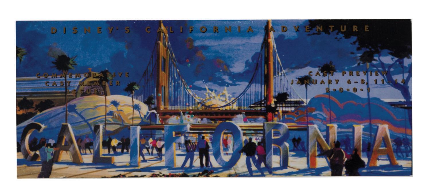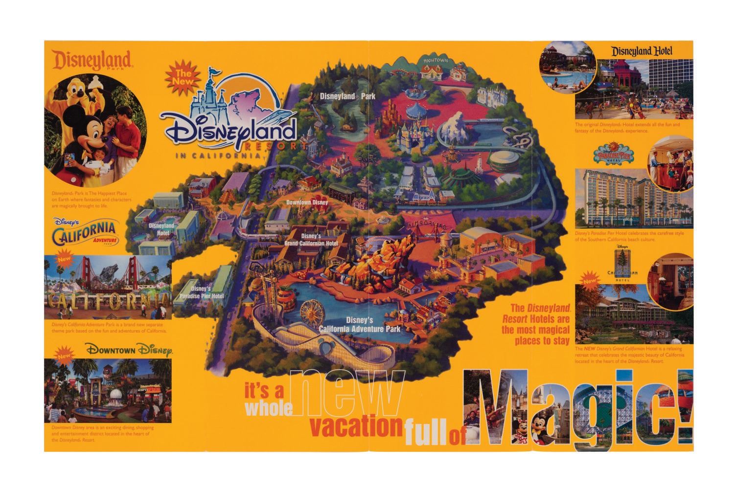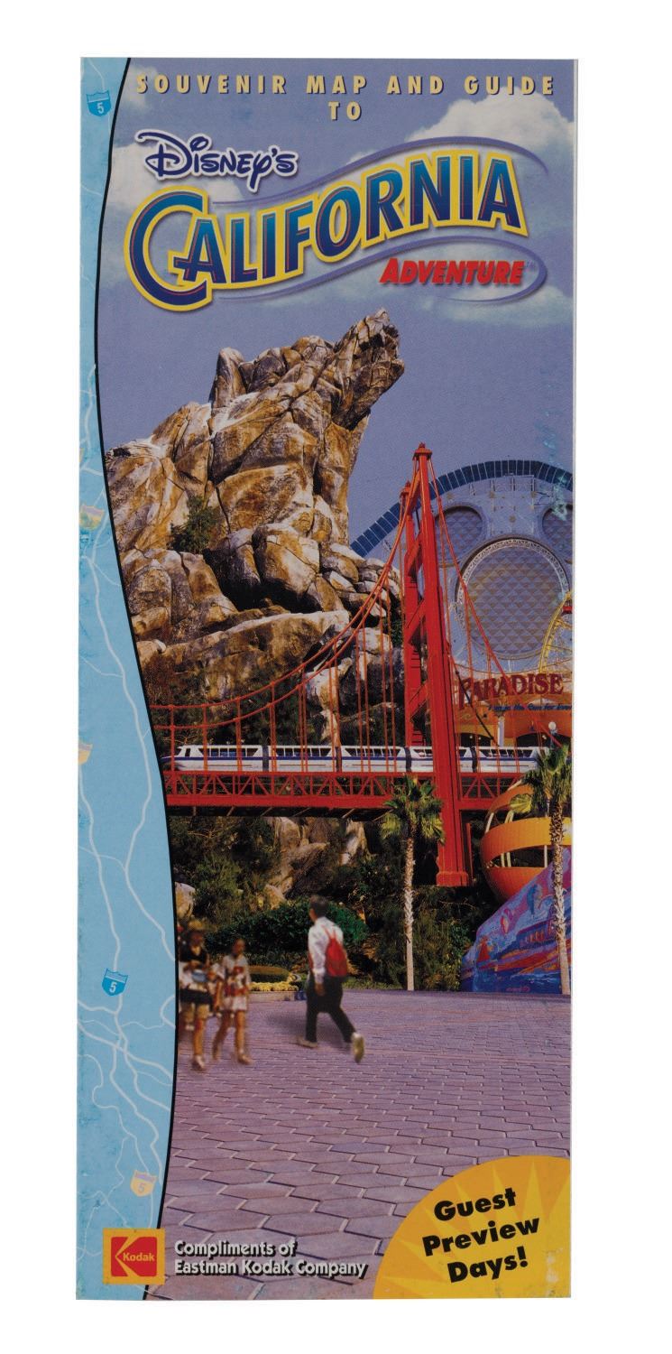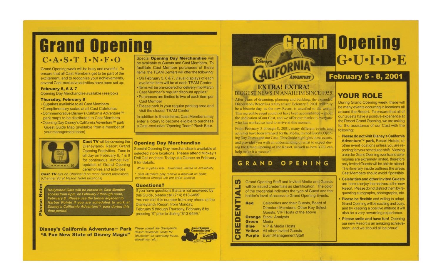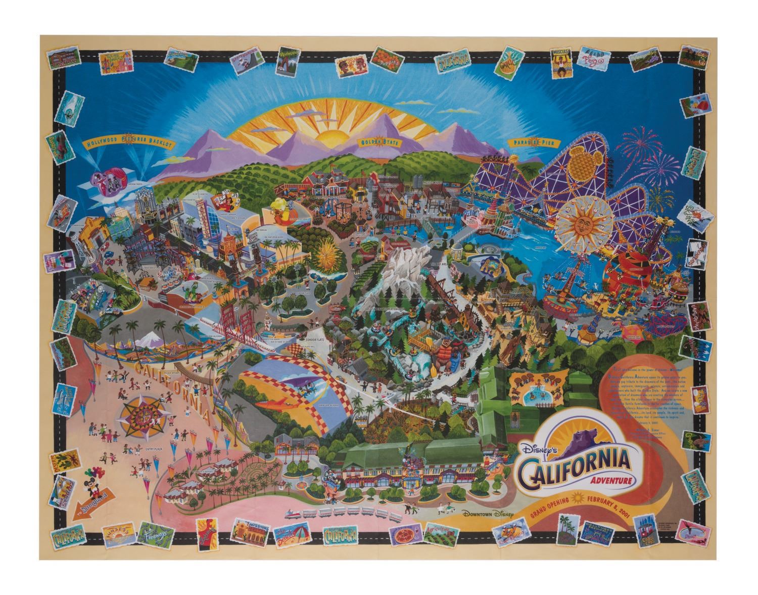 (Disney's California Adventure, 2001) A collection of (16) pieces of memorabilla commemorating Disney's California Adventure. Among the lot are several rare Cast Member-only mementos including a pre-opening map, a limited-edition and embossed issue of Disneyland Resort Line, (3) souvenir maps, a Cast Member Reference, The New Disneyland Resort brochure, Cast Preview Invitation, and Cast Preview Passport with holder. Measuring various sizes, the items are in good overall condition, despite slight wear to edges, original folds, and corners.