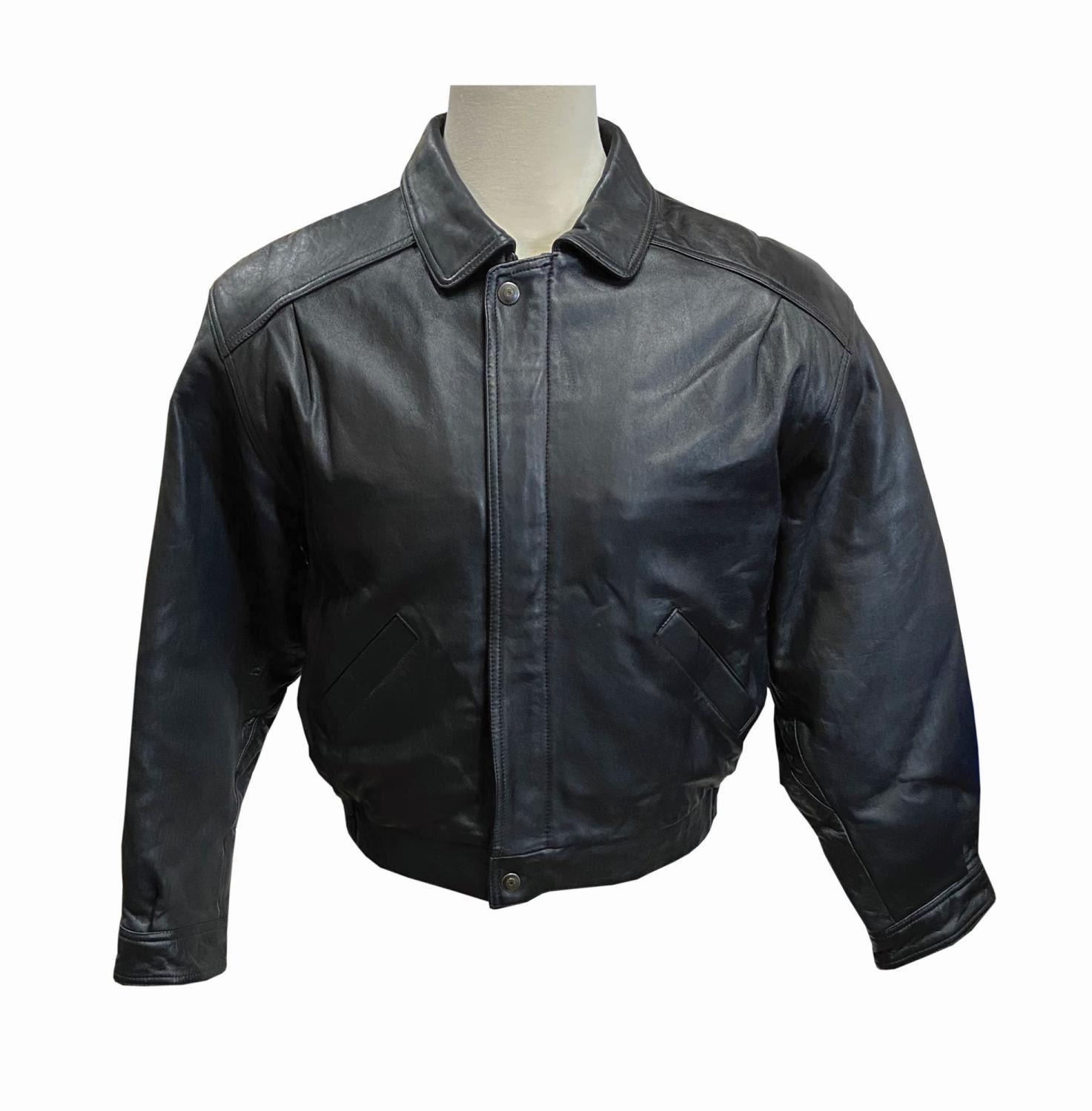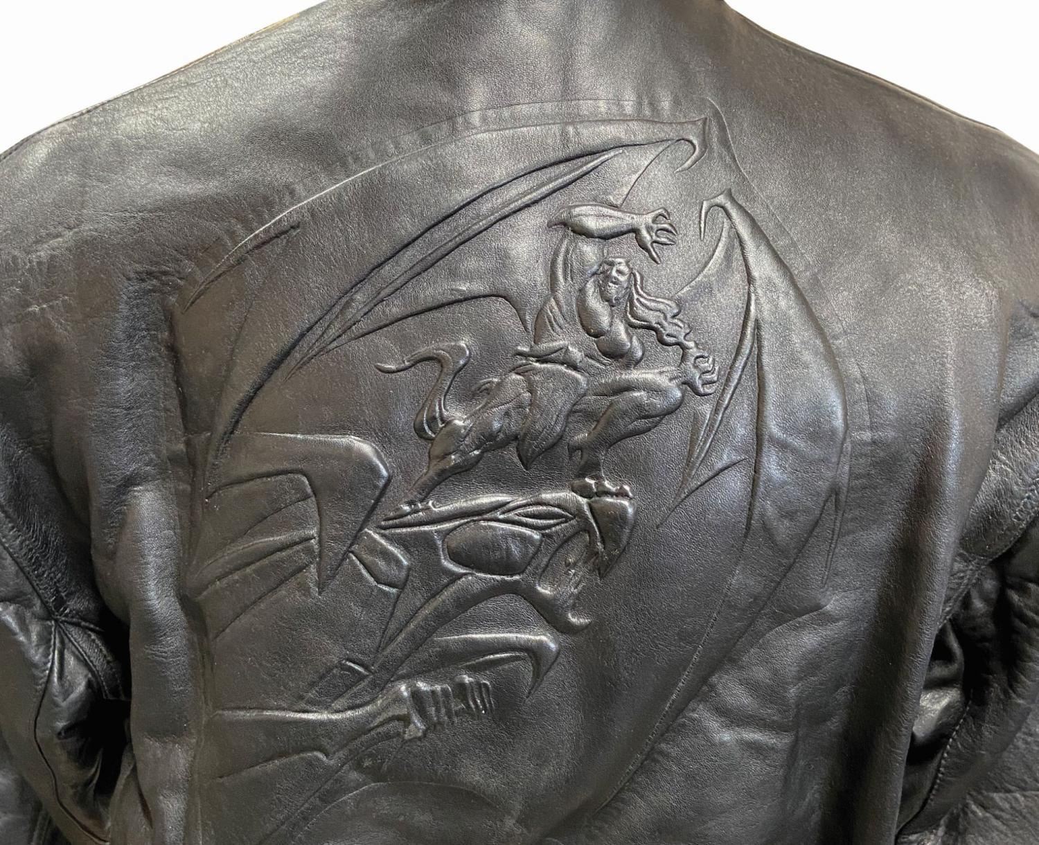 (Disney, c.1990s) An embossed leather jacket created for the production team and studio personnel working on the popular animated television show, Gargoyles. The black leather jacket features a large, embossed image of Goliath atop the castle on the back. The zippered jacket has snap button cuffs, two exterior and two interior pockets, and an elastic waistband. Though there is no size marking on the jacket, it appears to be a men's Medium. The condition is very good with minimal wear.
