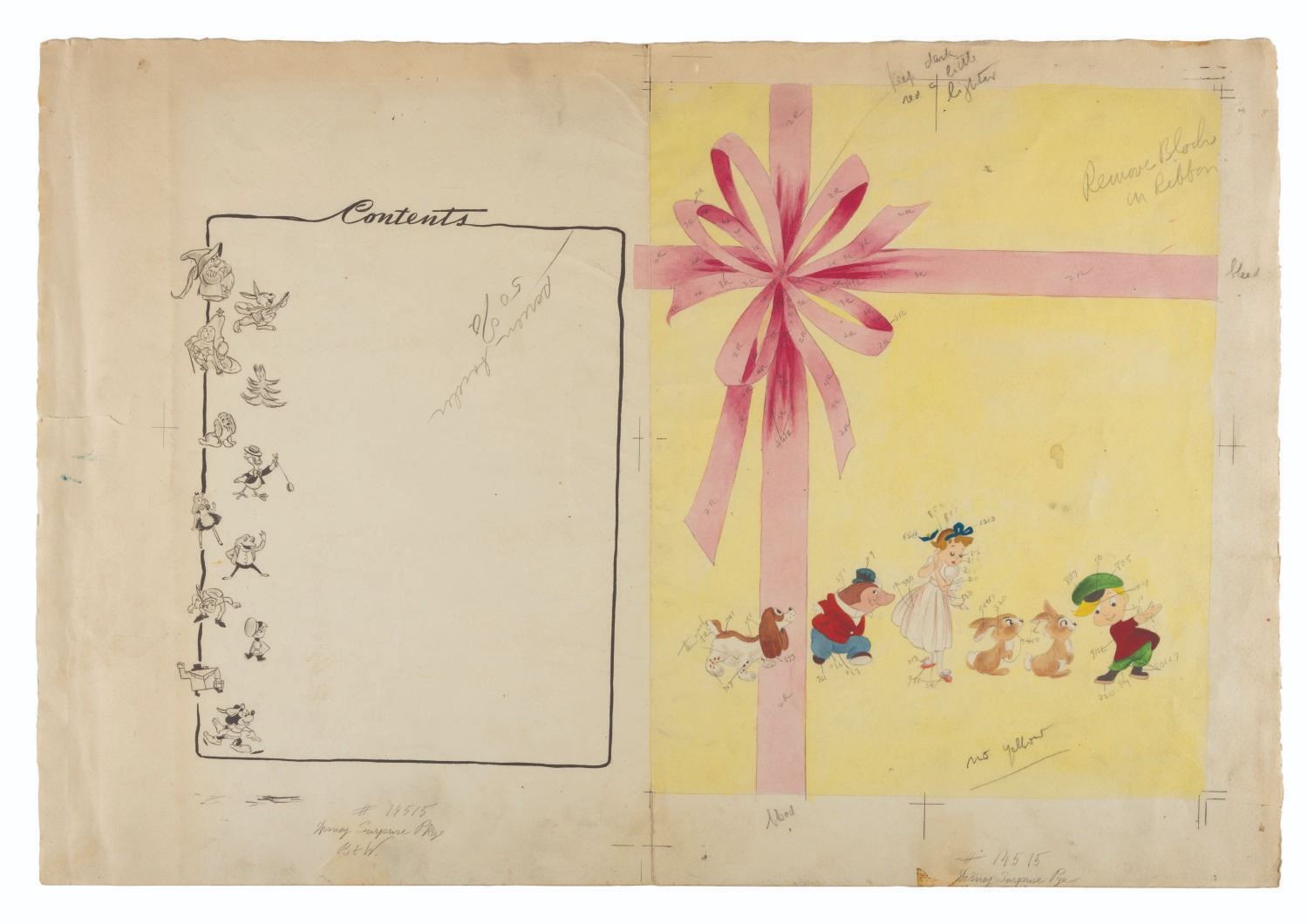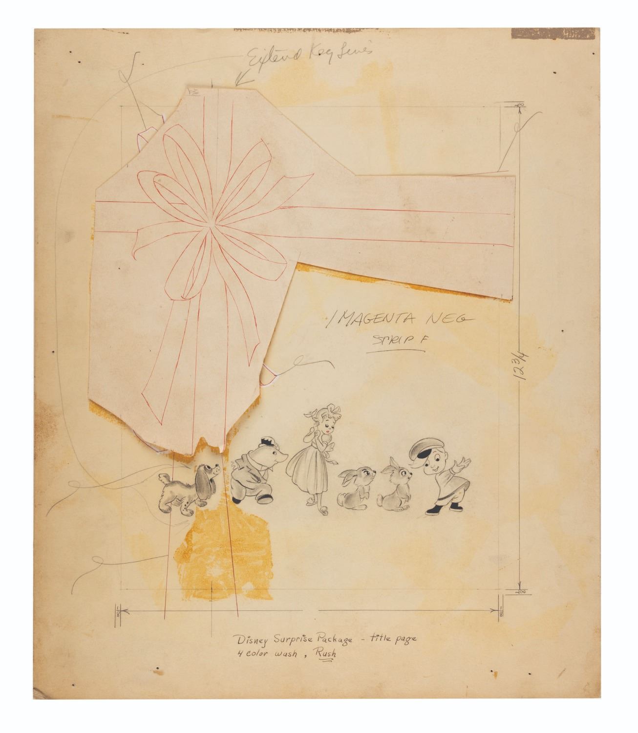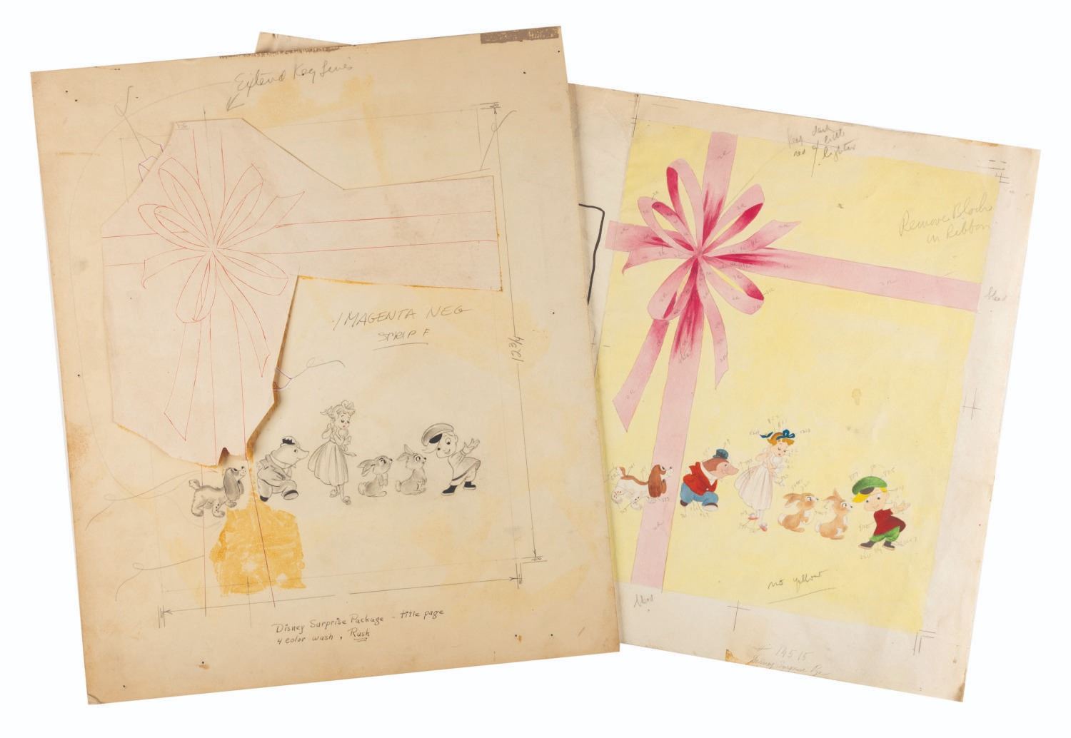 (Simon & Schuster, 1944) A collection of original artwork used for the title page of Walt Disney's Surprise Package. Accomplished in mixed media, the collection includes the original drawing on artist board with a paste-up of the bow, and the hand-painted color key next to a print of the book’s contents page on watercolor paper. Measuring 15” x 17.75” and 15.5” x 22.5”, the artwork is in fair condition with edge wear, creasing, stains, discoloration from age, a 1.5” tear to the left edge of the color key, and the paste up has detached from the drawing from age leaving adhesive stains and is included.