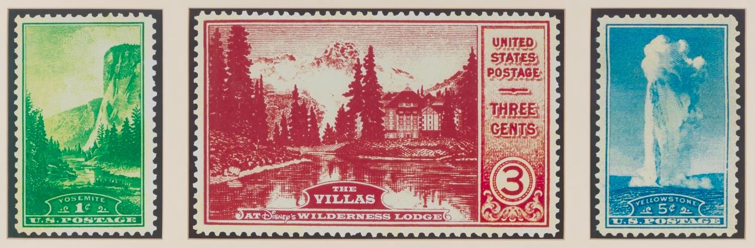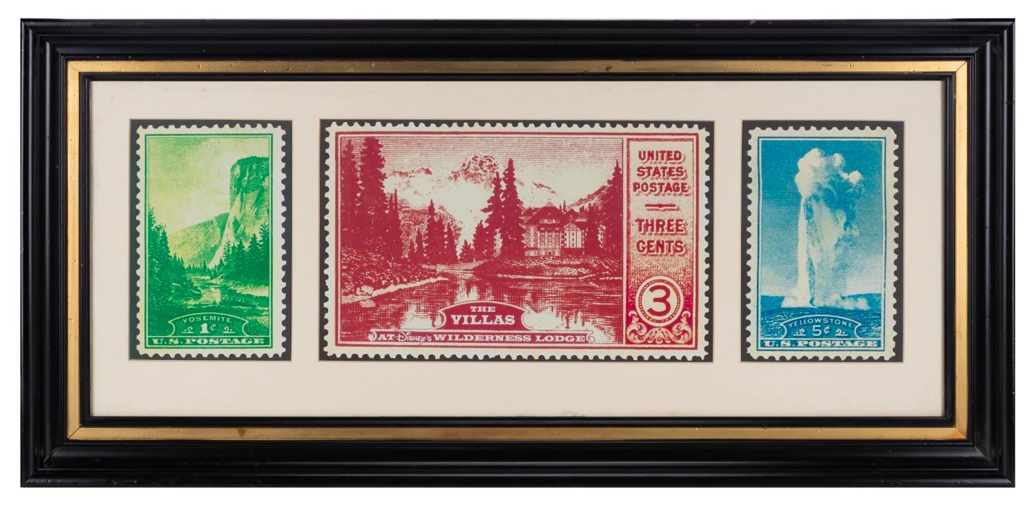 (Disney’s Wilderness Lodge, 2000s) A three-stamp wall art print that was displayed in Disney Vacation Club-exclusive rooms at The Villas at Disney’s Wilderness Lodge. The print has been matted and framed, though it does not have any glass or plexiglass. With image sizes ranging from 7.25” x 10.75” to 10.75” x 17.5” in a 15” x 38” matte of a 43.75” x 2.75” x 20.5” tall frame, the art is in fine condition, while the frame has typical scuffs, stains, and wear from Resort use.