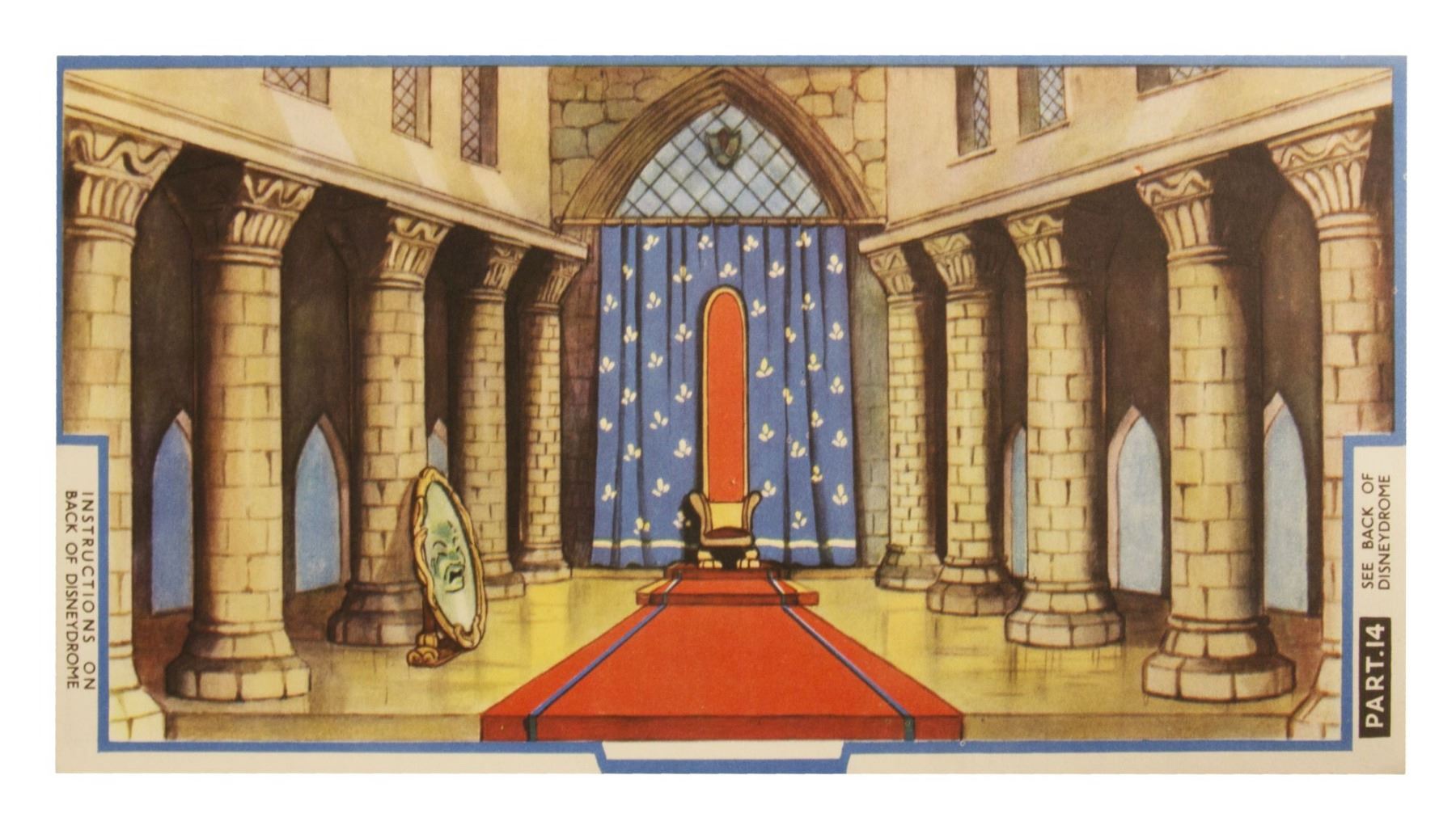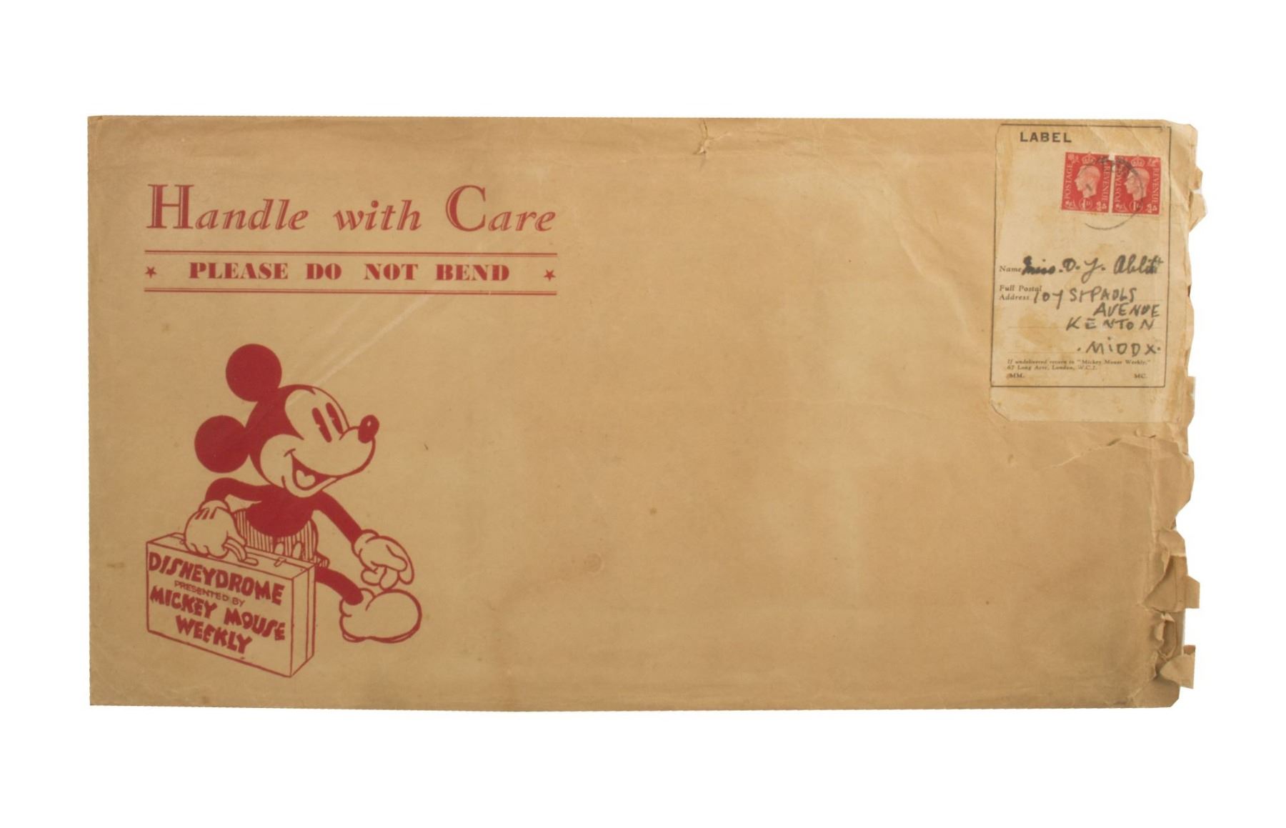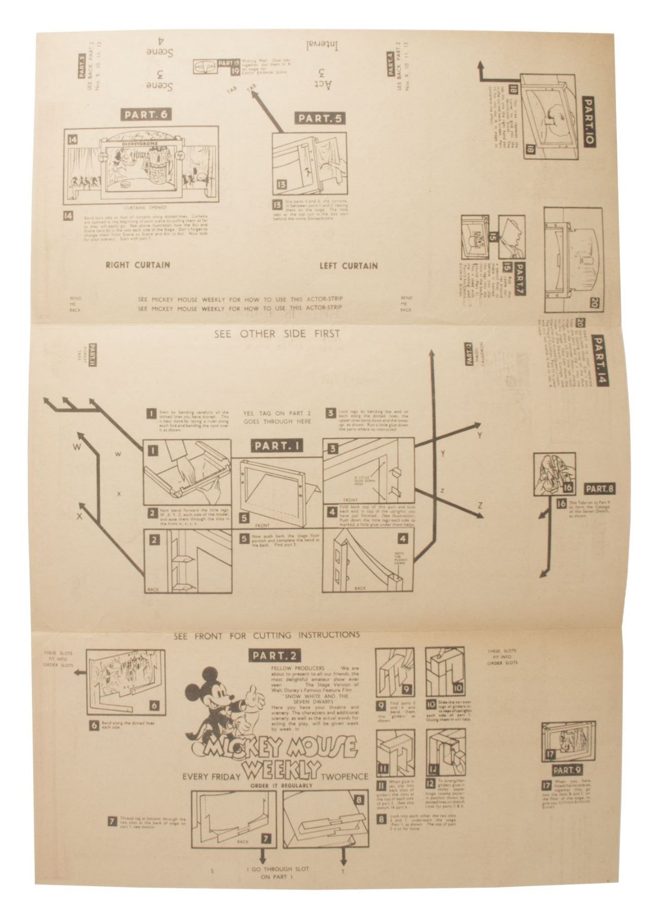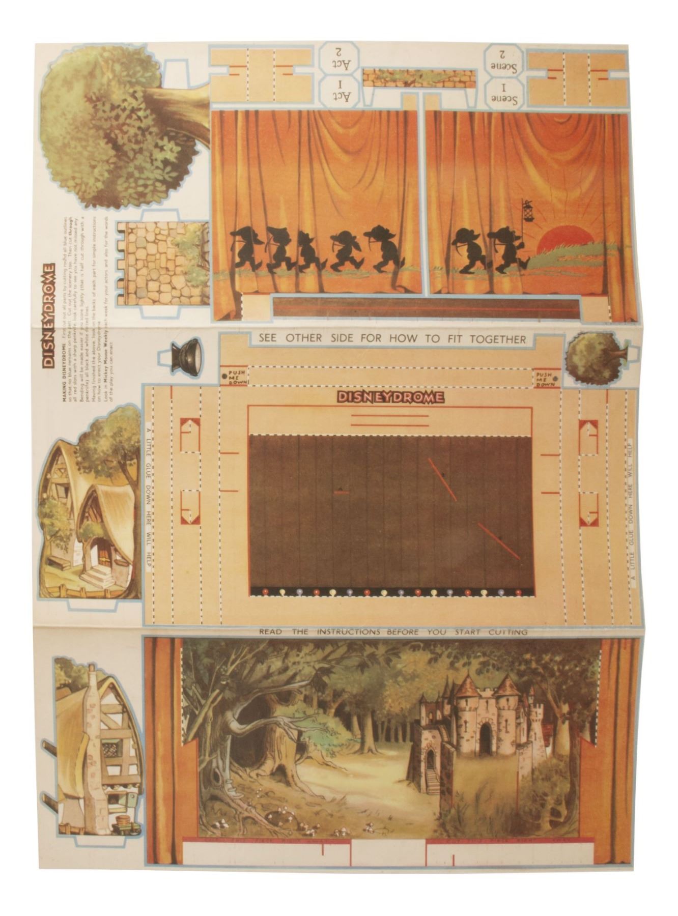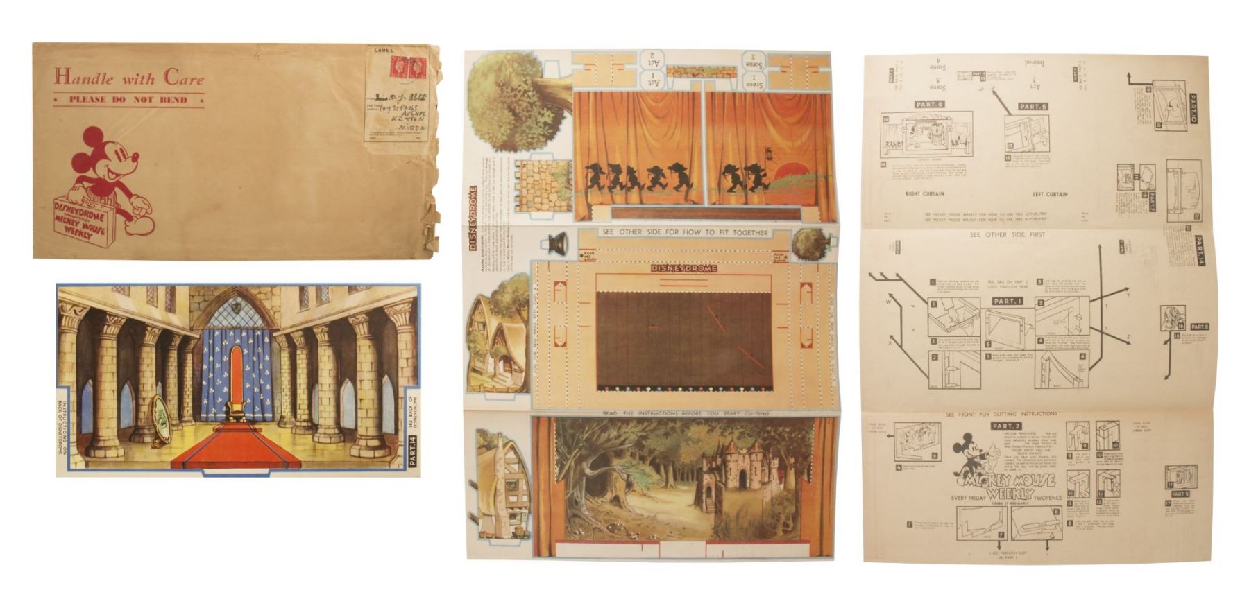 (Walt Disney Studios, 1938) A very rare unused Disneydrome paper model theatre by Mickey Mouse Weekly that was created to promote Snow White and the Seven Dwarfs. The uncut model theatre comes in its original Mickey Mouse Weekly mailing envelope with a separate double-sided background sheet and a printed letter from Mickey Mouse regarding use of the Disneydrome. The envelope measures 9"x17" and the set is in very good condition with some small tears and discoloration to the envelope from use.