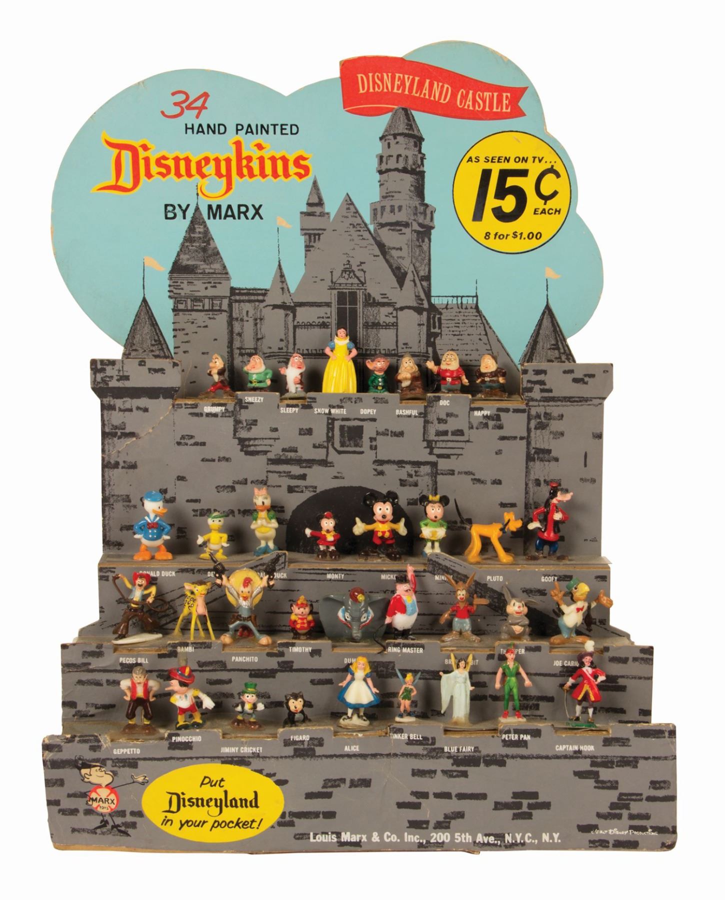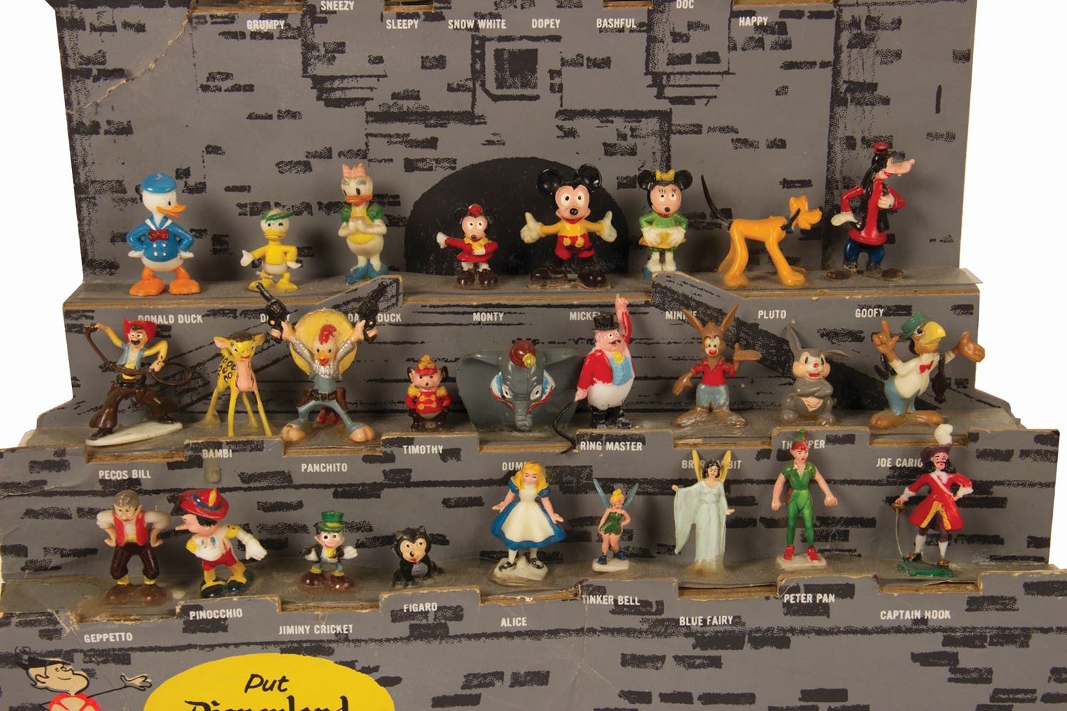 (Disney, 1961) A rare vintage store display featuring a complete set of all (34) first series Disneykins figures manufactured by Marx. The plastic figures are arrayed above their printed names on tiered steps of an display stand inspired by Disneyland's Sleeping Beauty Castle. Each of the popular cartoon figures is adhered to the cardboard store display. Measuring 16.25"x12.25" and 4" deep, the display is in very good condition. All figures are intact and exhibit only minor wear. The castle display exhibits some creasing overall and warping to the bottom tier with browning and tape repair to the reverse.
