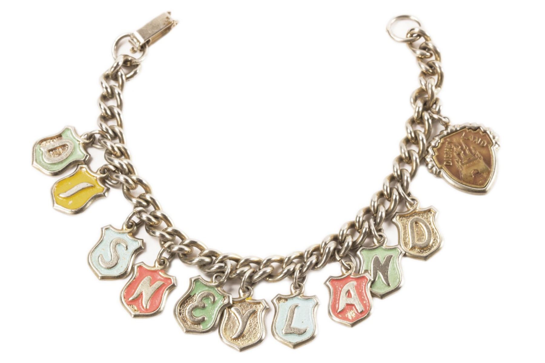 (Disneyland, c.1960) A souvenir charm bracelet from Disneyland that spells out "Disneyland" and ends with a charm of Sleeping Beauty Castle. The hand-painted colors in this bracelet are still very bold, and the bracelet measures 7" long. The condition is very good with minor wear.