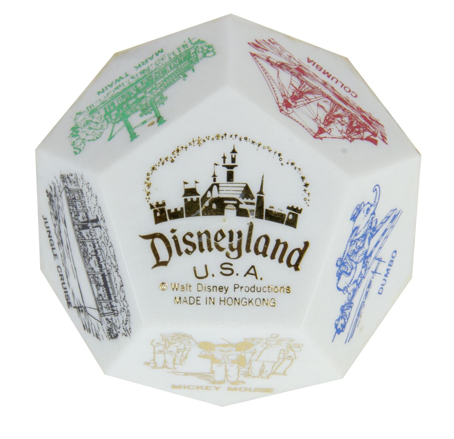 (Disneyland, c.1960s) A rare 12-sided paperweight featuring the various lands and attractions of the park. This paperweight measures 2.5" tall and is in very good condition with minor wear.