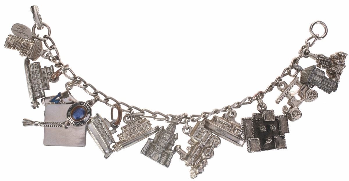 (Disneyland, 1960s) Charm bracelet featuring (13) Disneyland attraction-themed charms, including one personalized "Warren High School" graduation cap charm. Chain measures 6" long. In good condition.