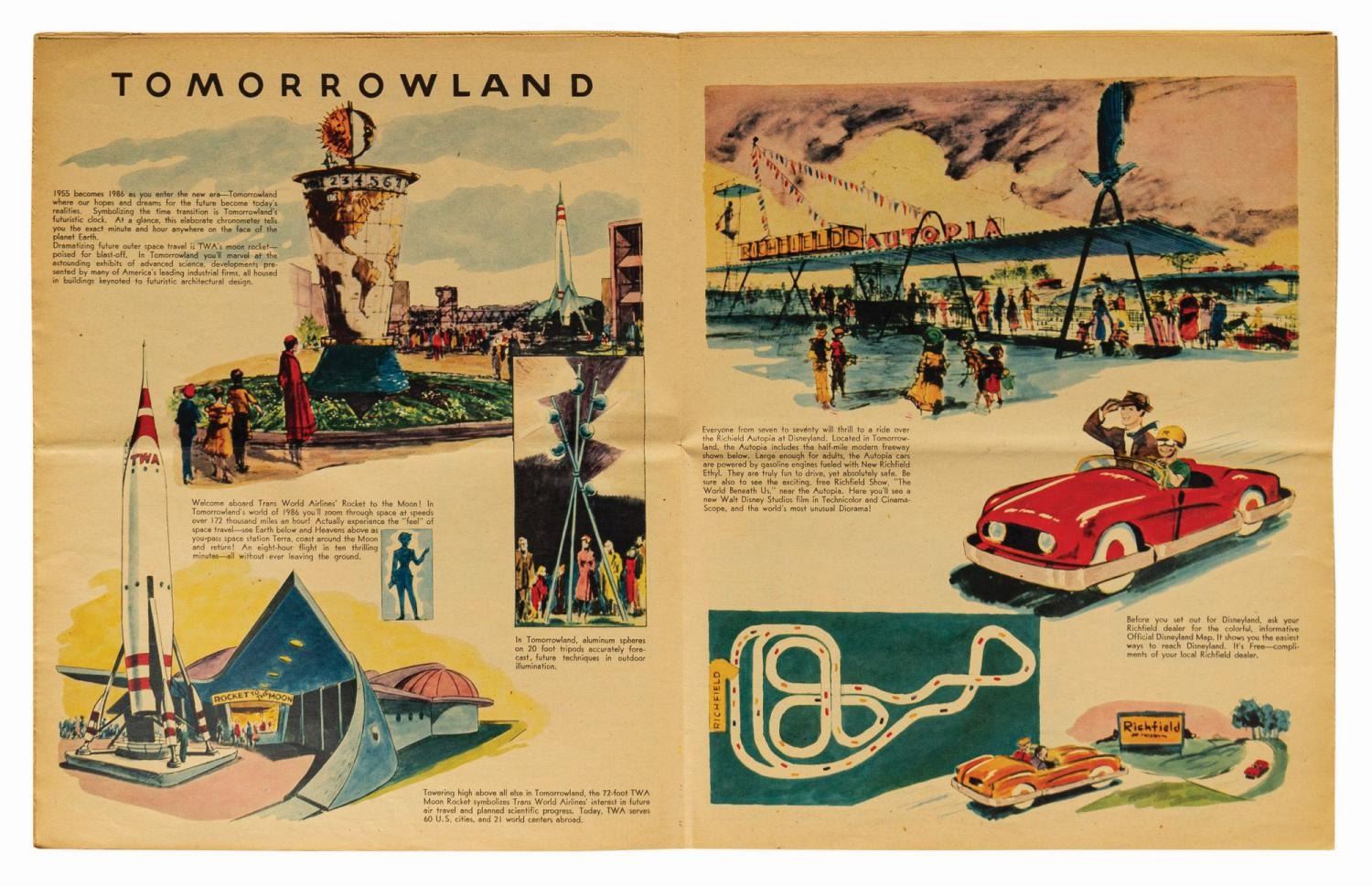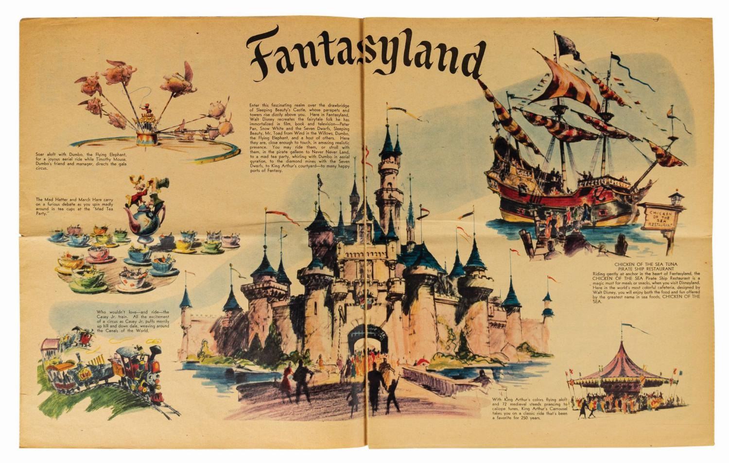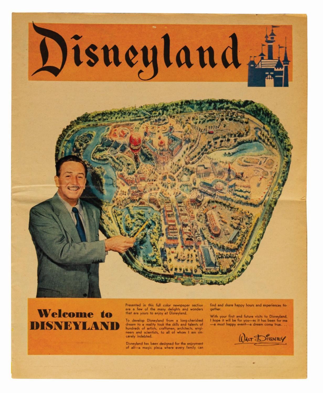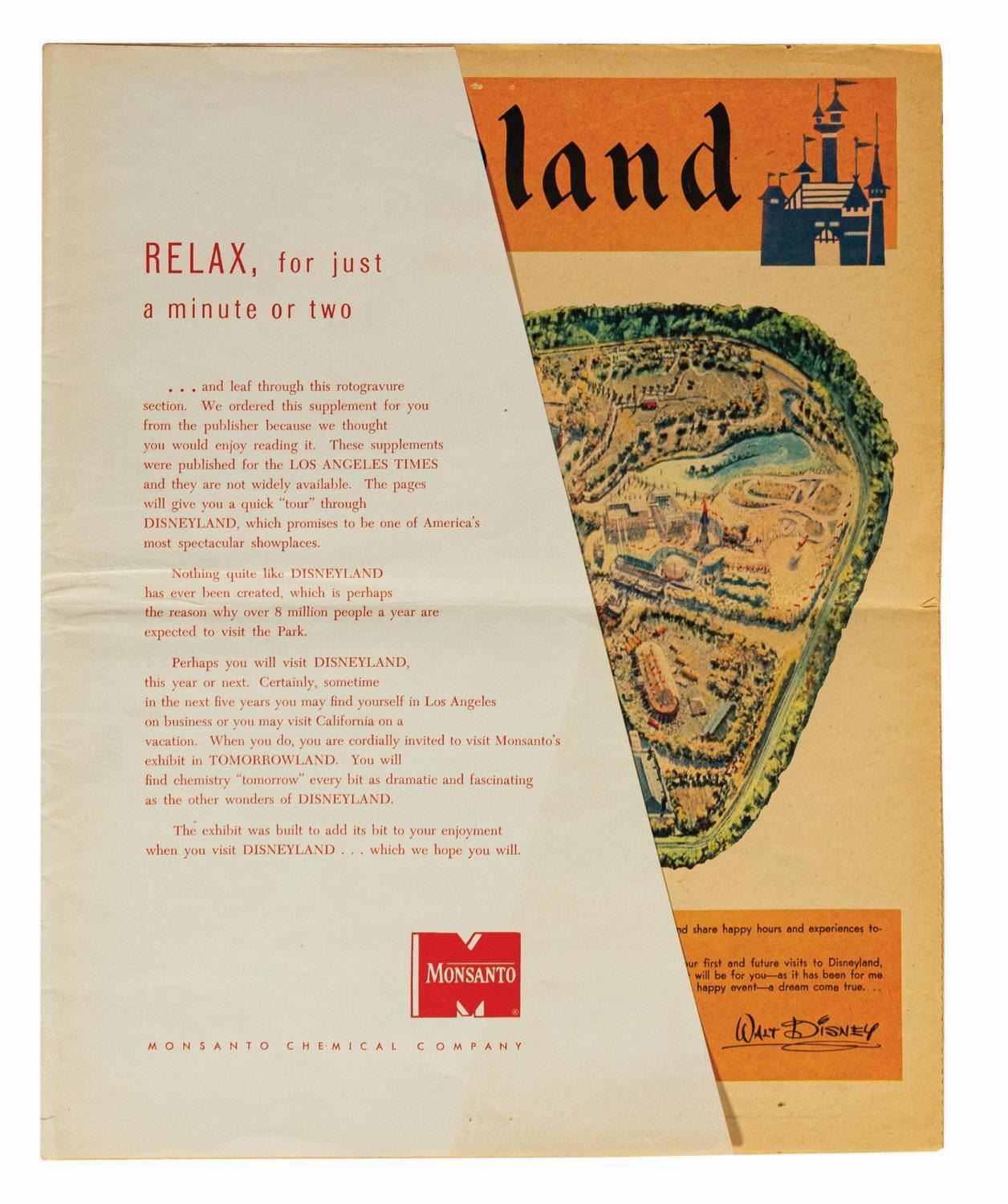 (Disneyland, 1955) This full-color 20-page newspaper supplement was originally published by the Los Angeles Times on July 15, 1955, two days before the grand opening of Disneyland. The Monsanto Chemical Company ordered an additional run from the publisher and sent them to VIPs and business contacts nationwide to promote their contributions to the hot new vacation destination. Much rarer than the version included in the newspaper, this undated edition of the supplement includes a letter from Monsanto on a half-page overleaf. Measuring 13.25"x11", the piece is in very good condition with some minor edge wear and a horizontal fold and staple mark as originally offered.