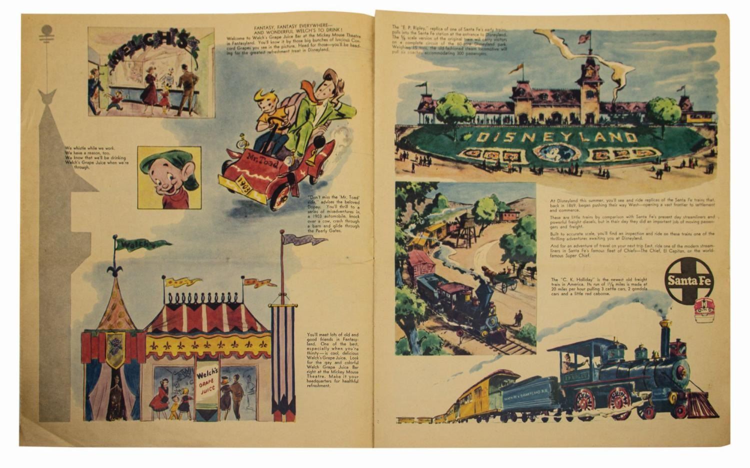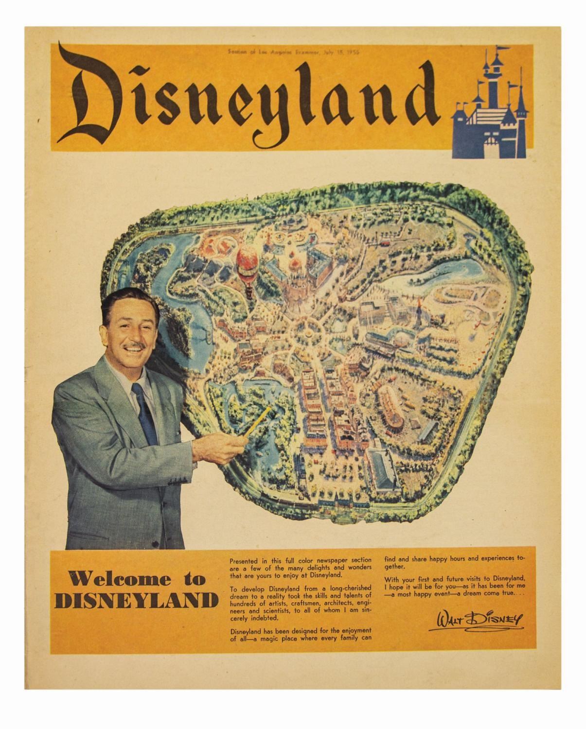 (Disneyland, 1955) This rare 20-page newspaper supplement was issued by the Los Angeles Times just two days before the Grand Opening ceremony of Disneyland to promote Walt's new Park to the general public. The pictorial profusely features illustrations and artist's renderings of the lands and attractions that guests would soon experience throughout. Measuring approximately 10.75"x13.25", the pictorial and is in good condition with some holes near the crease, and supplement has been adhered to a sticky board for display.
