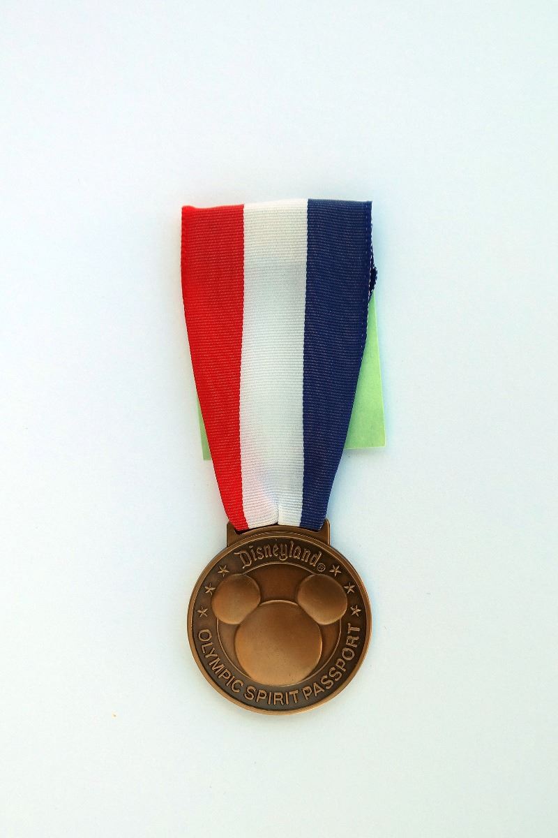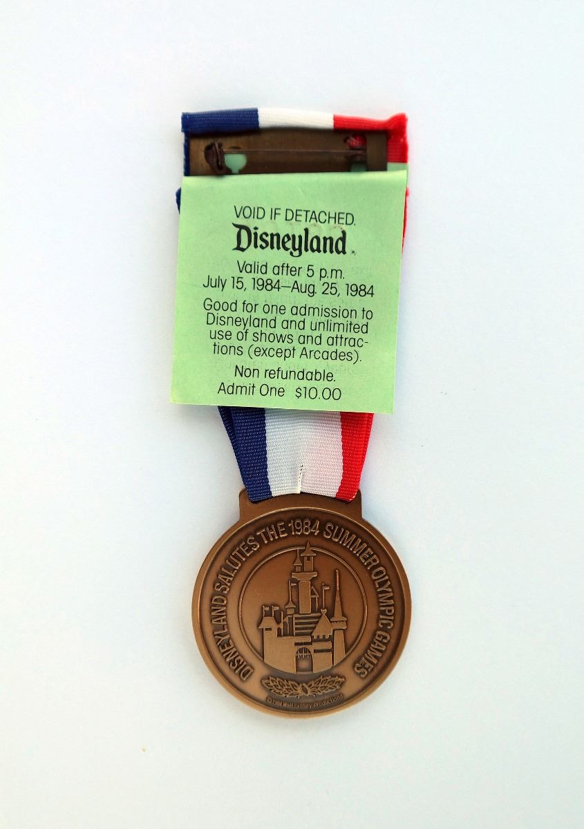 (Disneyland, 1984) Bronze-color medal with red, white, and blue ribbon created to commemorate the 1984 Summer Olympic Games. This medal and its attached admission label, would permit the wearer to enter the park between July 15 and August 25 of 1984. Features Mickey imagery on the front and Sleeping Beauty Castle on the back. Measures 4"x1.5". In good condition.