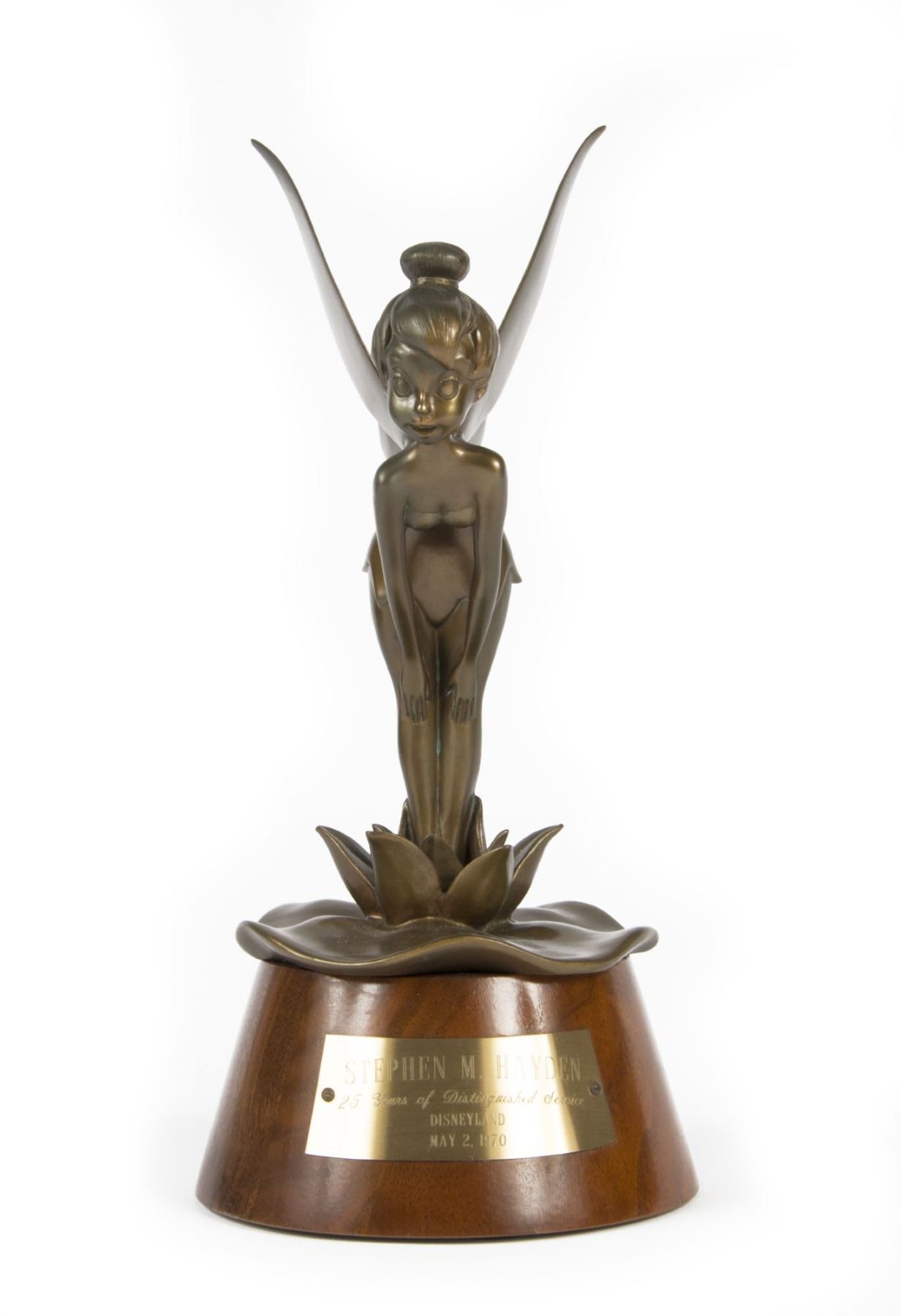 (Disneyland, 1970/95) A 25-year cast member service award presented to Stephen M. Hayden. The award features a bronze Tinker Bell attached to a wooden base with a custom engraved name plaque along the bottom which celebrates "25 Years of Distinguished Service" and lists Hayden's first day of employment as May 2, 1970. Few cast members make it to this milestone year. This rare award measures 13" tall and is in good condition with some minor wear from previous display.