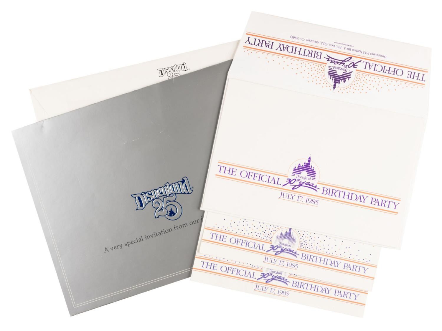 (Disneyland, 1980/1985) A collection of one Disneyland 25th birthday party invitation and three 30th birthday invitations from the Park’s anniversary celebrations. Ranging in size from the 5.25” x 8” 30th-anniversary invitation to the 8.75” x 11.5” 25th-anniversary envelope, the items are in good to very good condition with light wear, creases, and scratches.