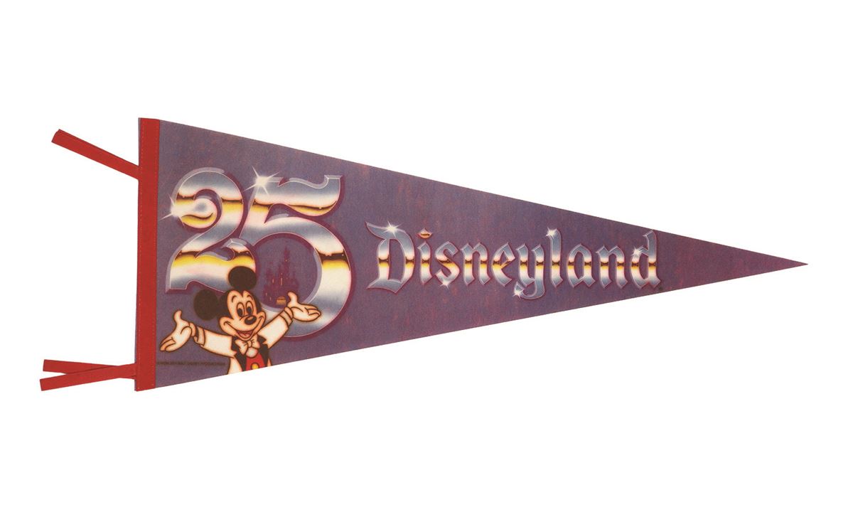 (Disneyland, 1980) A Disneyland 25th Anniversary felt pennant featuring Mickey Mouse and the text "25 Disneyland" in a large font. Measures 11.5"x28.5". In good condition with some mild discoloration on reverse side.
