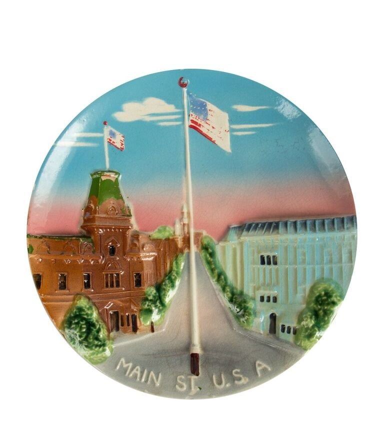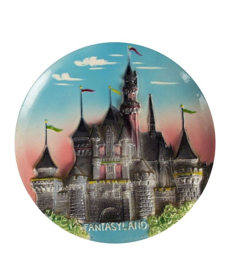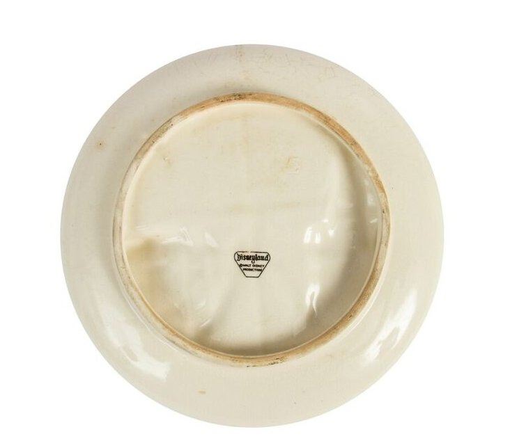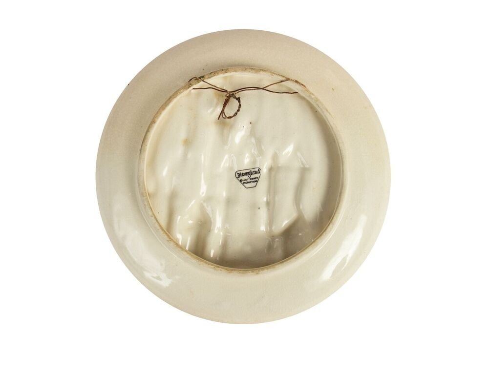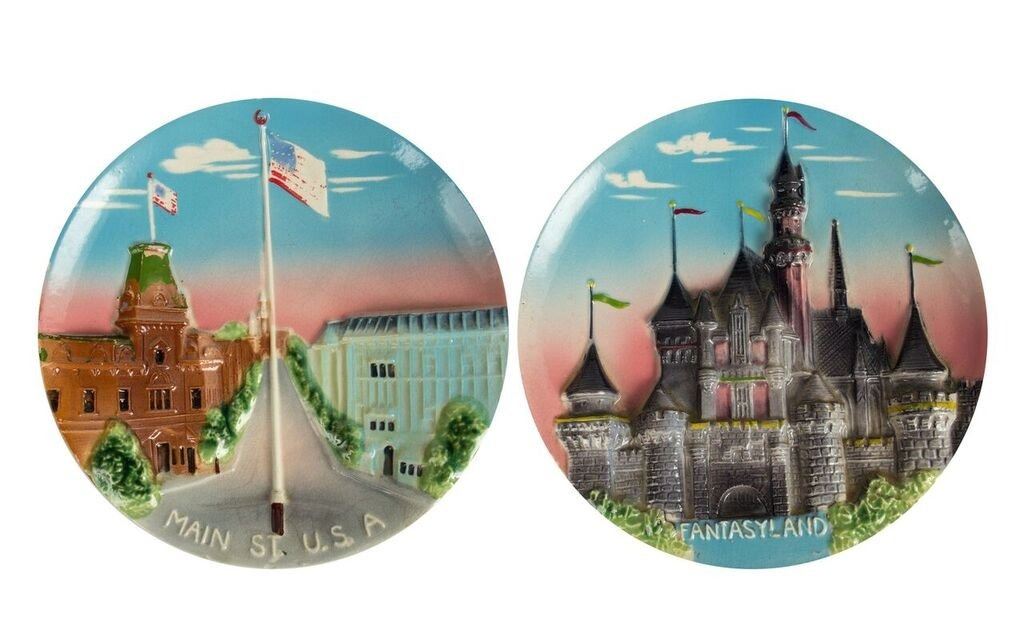 (Disneyland, c.1958) A pair of (2) very early plates created as part of a park-exclusive set. These ceramic plates were hand-painted in Japan and feature pop-out artwork of Main Street U.S.A. and Fantasyland. The plates contain two holes along the base that allow for wall-display. The plates measure 8" in diameter and the pair is in good displayed condition, with some minimal paint-wear and some scuffing and discoloration along the back sides.