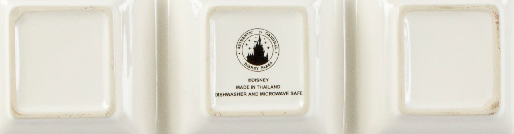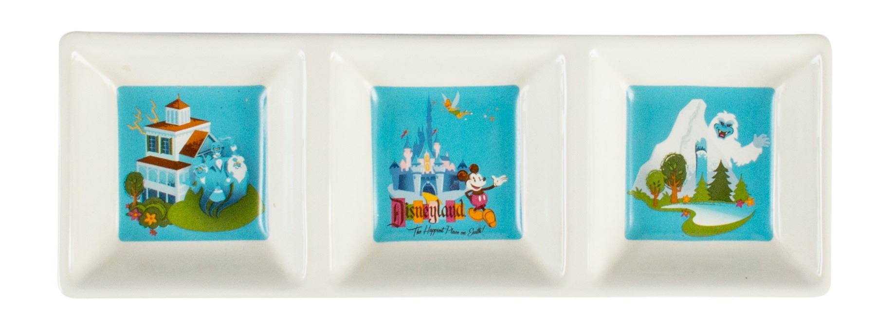 (Disneyland, c.2000s) A retro-style ceramic tray with three connected sections featuring stylish Disneyland imagery. Depicted are the "Haunted Mansion", "Sleeping Beauty Castle", and "Matterhorn Bobsleds" attractions. Measuring 4.5"x13", the tray is in very good condition with little wear.