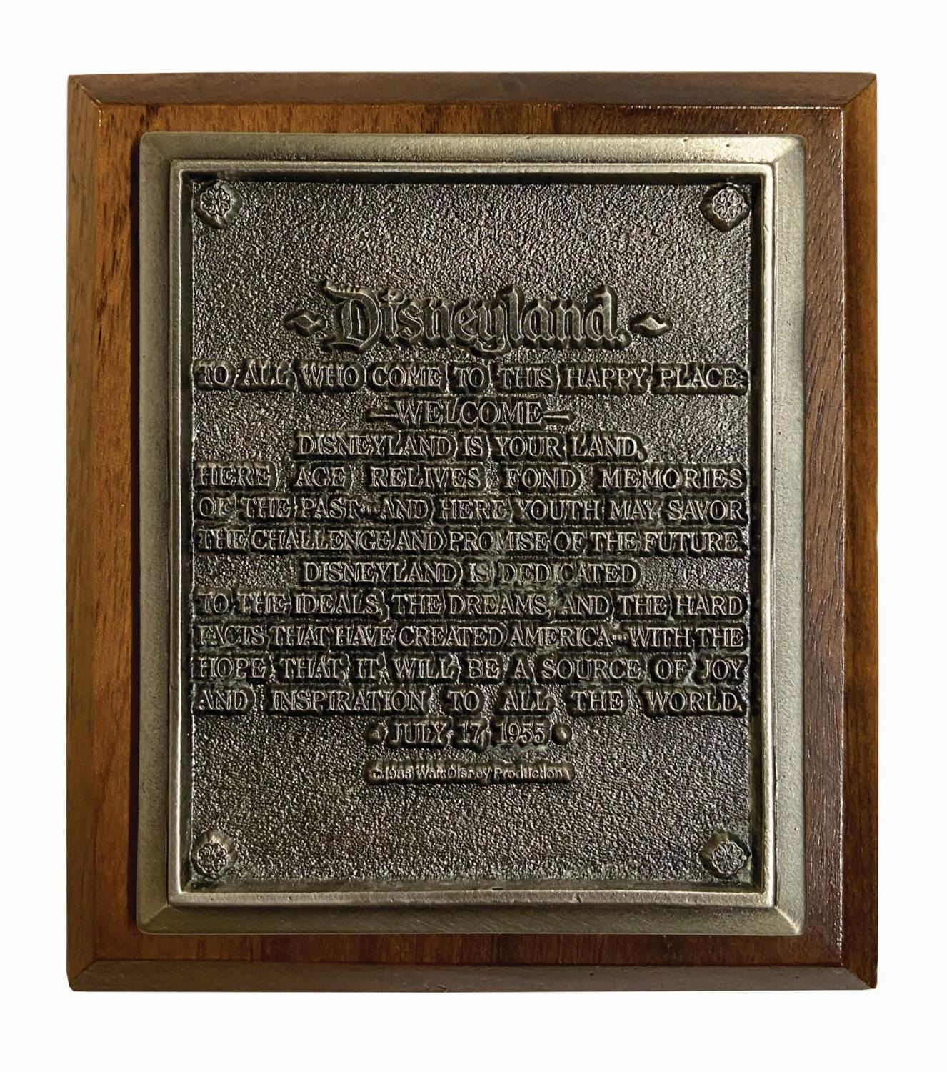 (Disneyland, 1985) A miniature replica of the original Disneyland dedication plaque presented by Walt at the park's grand opening ceremony on July 17, 1955. Created in celebration of Disneyland's 30th anniversary, the tabletop plaque is composed of cast metal on a wooden base with felt feet. The original felt drawstring storage pouch is included. Measuring 4.25"x3.75" and 1" deep, the plaque is in very good condition with a pair of tiny scratches at the bottom of the base and minimal wear.