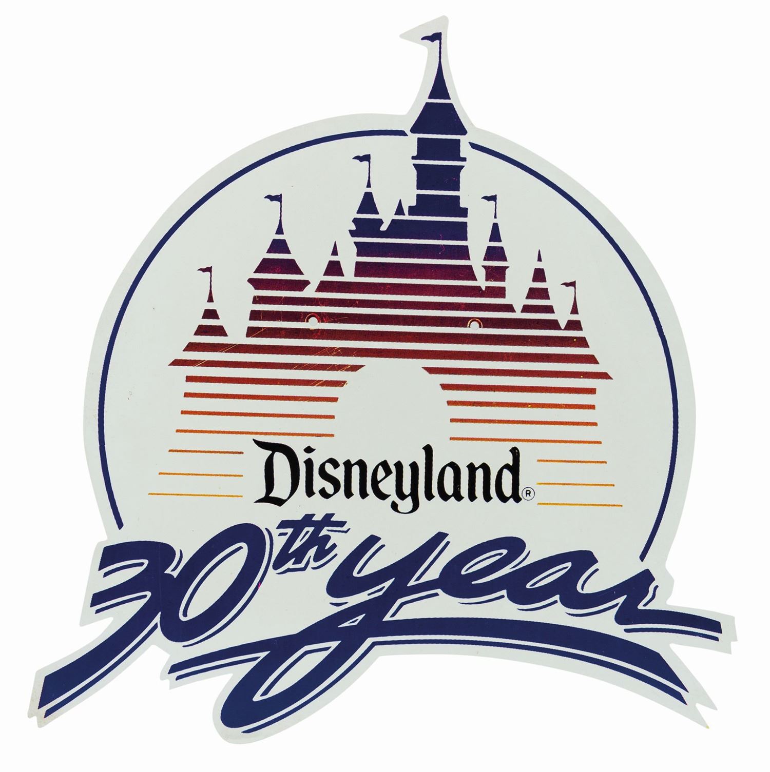 (Disneyland, 1985) An original lamppost sign from Disneyland's 30th anniversary. The sign is printed on PVC board, and depicts Sleeping Beauty Castle. The single-sided sign measures 22"x22" and is in good overall condition with some surface scratches and two screw holes from the sign's original use. A Disneyana Convention label is included.
