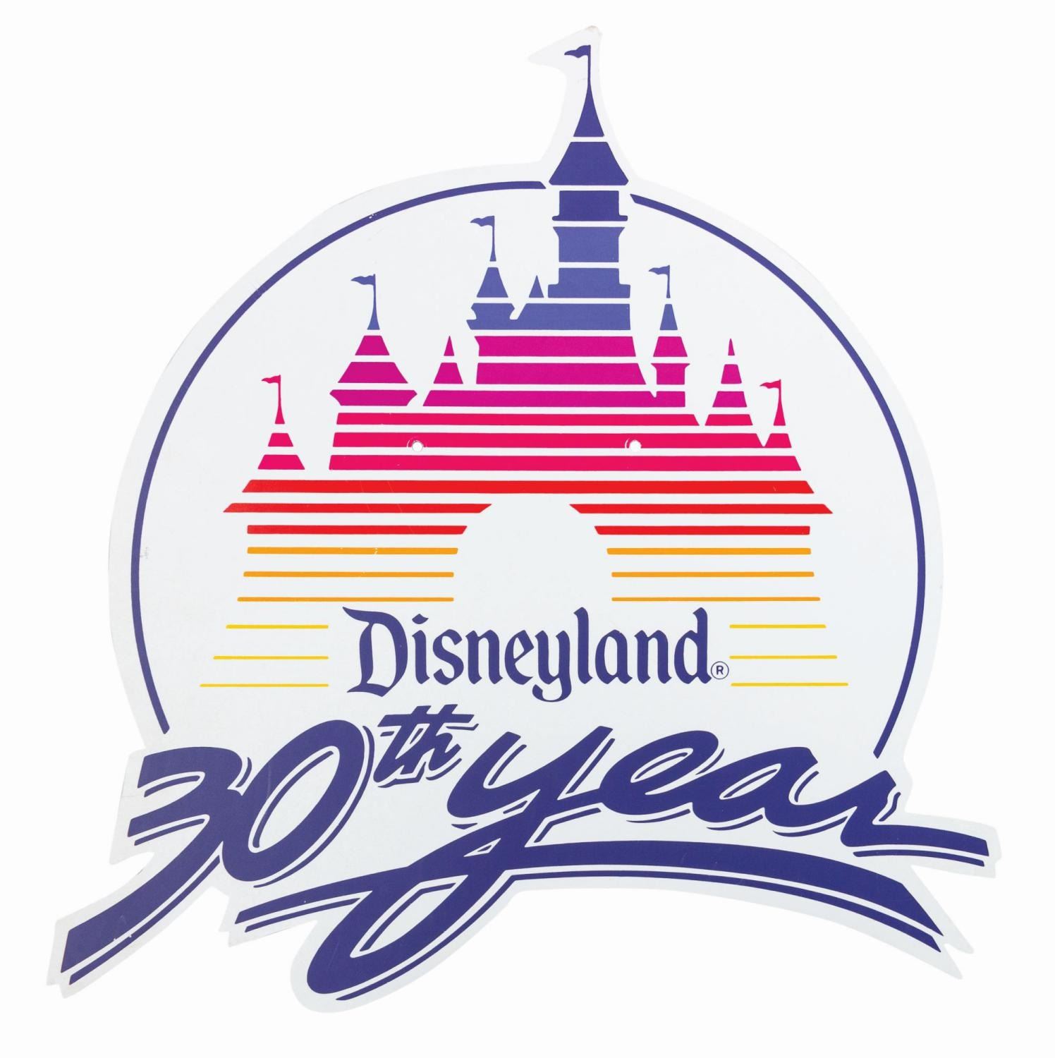 (Disneyland, 1985) An original lamppost sign from Disneyland's 30th anniversary. The sign is printed on PVC board and depicts Sleeping Beauty Castle. The single-sided sign measures 22"x22" and is in very good overall condition with some surface scuffs and scratches, and two screw holes from the sign's original use. There is a Walt Disney productions stamp on the reverse.