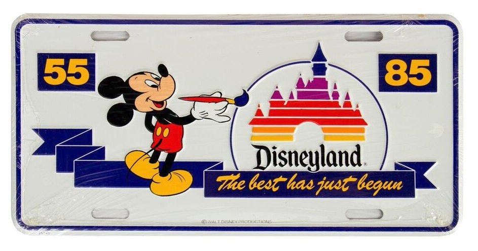 (Disneyland, 1985) A special souvenir license plate create in celebration of Disneyland's 30th Anniversary. This license plate features Mickey Mouse and the Disneyland logo, and notes the years 1955 to 1985. This item measures 6"x12" and is in fine condition, still in its original shrink wrap.
