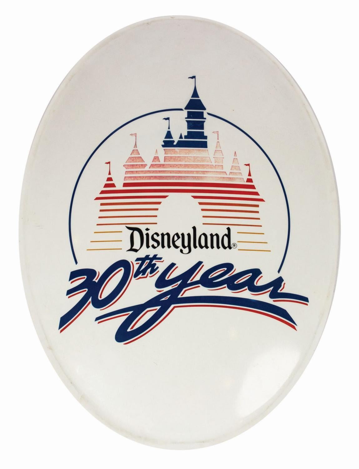 (Disneyland, 1985) A rare vintage park-used Disneyland 30th anniversary shield sign. The plastic oval-shaped sign was used as part of the elaborate Incredible Countdown Clock installation at the park's entrance, where signs like this adorned the crest of the clock and accented the organ pipes on either side. The sign features the Disneyland 30th Anniversary logo at center and is stamped "Walt Disney Productions" on the reverse. Measuring 24"x17.75", the convex sign is in very good park-used condition with some surface scratching, scuffs, edge wear, and spot soiling to the reverse.