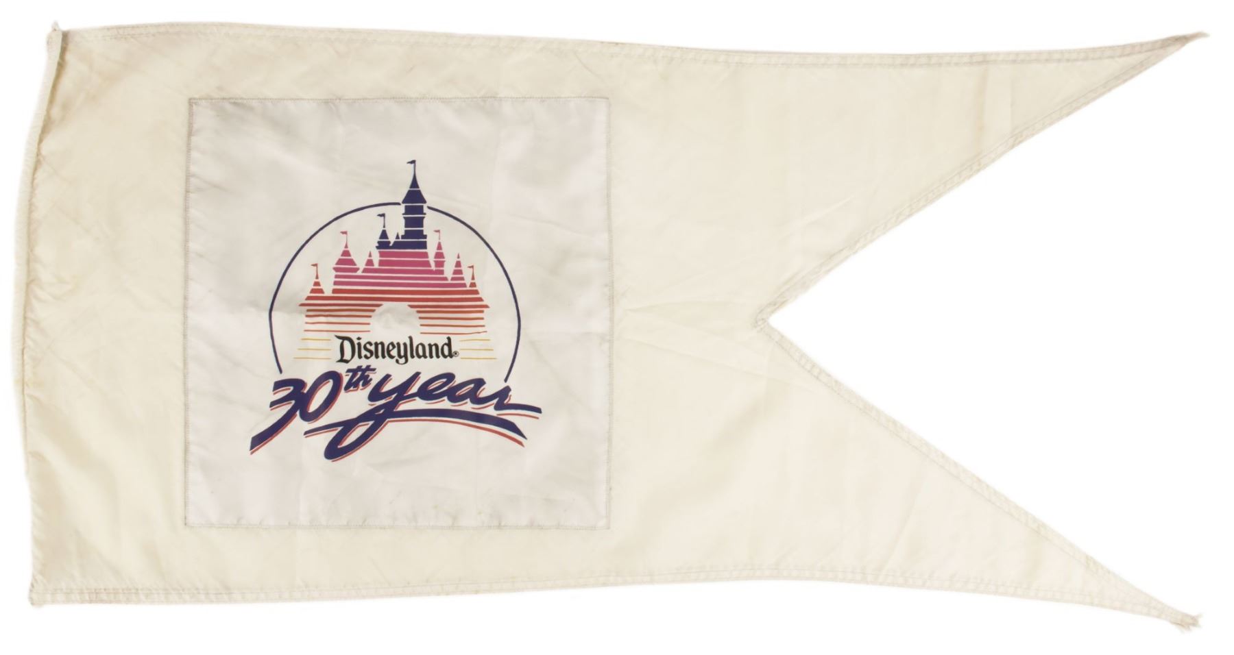 (Disneyland, 1985) A very rare park-used flag created for the 30th anniversary celebrations at Disneyland. The double-sided flag features a large logo patch for the anniversary sewn into both sides. Measuring approximately 20"x40", the flag is in fair to good condition overall with some areas of yellowing along the pole end, some fraying at the points, and general surface wear from use. A sturdy cord originally ran through the pole end of the flag, and while the cord has been trimmed at the ends, it is still fed through that end of the flag.