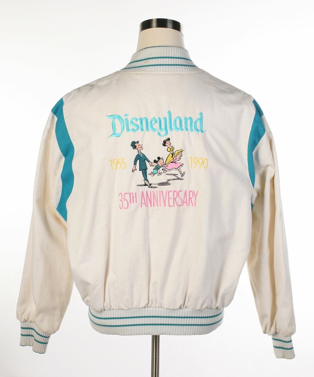 (Disneyland, 1990) White jacket with blue accents created for cast members in celebration of Disneyland's 35th Anniversary. Sold exclusively at "Company D", Disney's Cast Member-only store. The unused jacket features an exclusive retro 1950s family design on the back and notes the anniversary. Size X-Large. In fine condition.