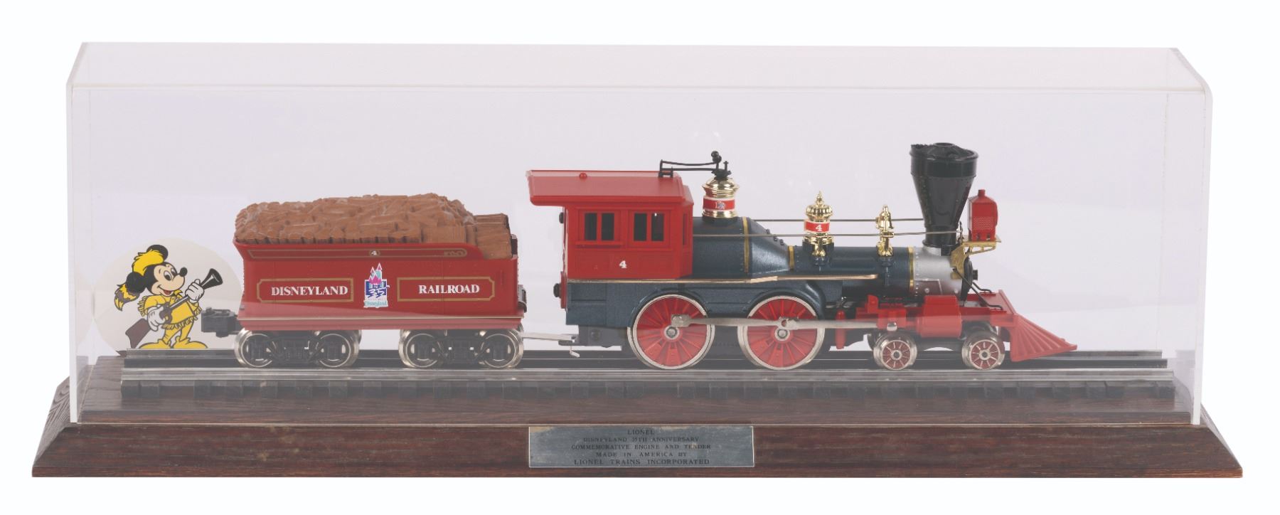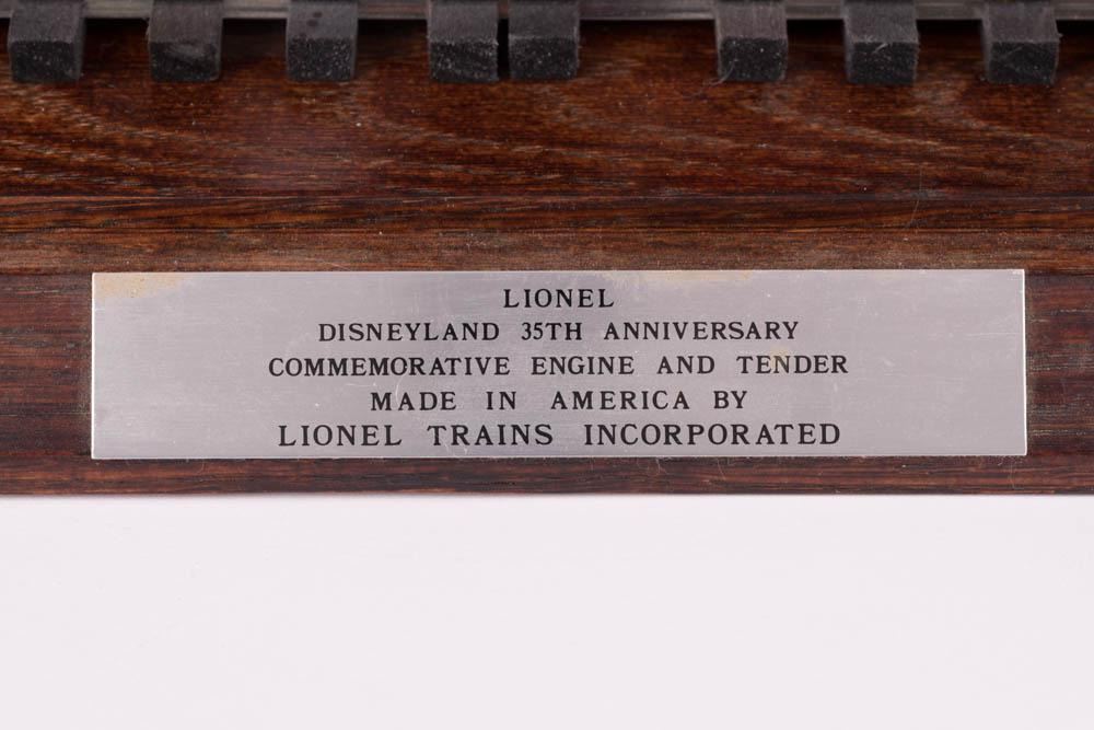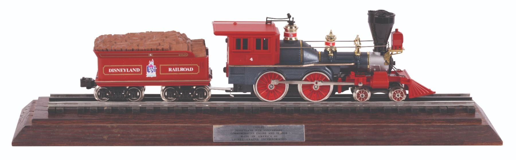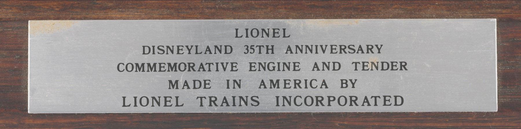 (Disneyland, 1990) A Disneyland 35th Anniversary Commemorative Ernest S. Marsh Engine and Tender by Lionel Trains Incorporated. The detailed O-Gauge 1:48 scale of the American 4-4-0 Engine No. 4 features the "35 Years of Magic" logo on the tender and is presented in a display case atop a length of track with commemorative plaque. The electronics have not been tested for function. The train measures 16" long (from pilot to coupler), 4.25" tall, and displays in a fine condition, with slight flaws from production. The train comes within its Lucite display atop a wooden base measuring 21.5"x5.5" and 7" tall.