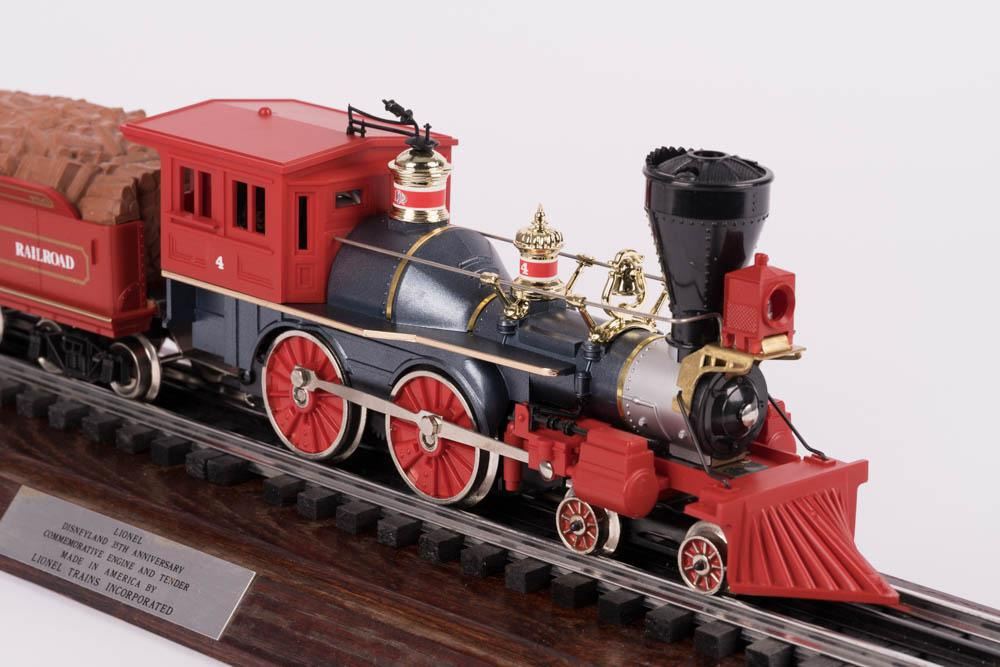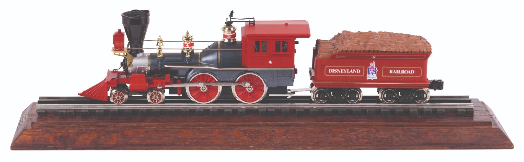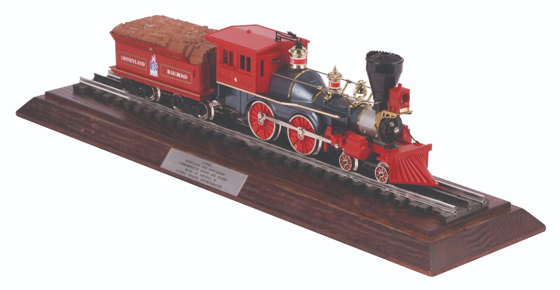(Disneyland, 1990) A Disneyland 35th Anniversary Commemorative Ernest S. Marsh Engine and Tender by Lionel Trains Incorporated. The detailed O-Gauge 1:48 scale of the American 4-4-0 Engine No. 4 features the "35 Years of Magic" logo on the tender and is presented in a display case atop a length of track with commemorative plaque. The electronics have not been tested for function. The train measures 16" long (from pilot to coupler), 4.25" tall, and displays in a fine condition, with slight flaws from production. The train comes within its Lucite display atop a wooden base measuring 21.5"x5.5" and 7" tall.