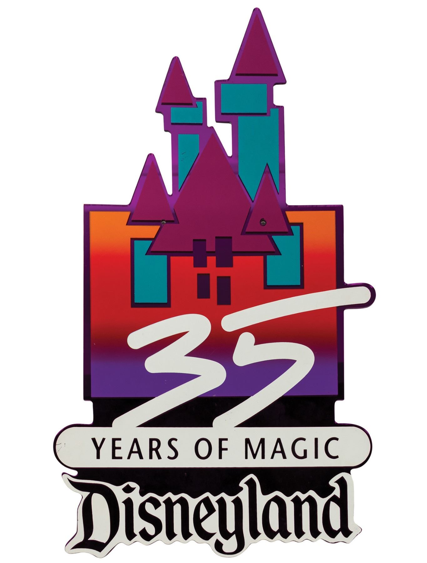 (Disneyland, 1990) A lamppost sign from Disneyland's 35th anniversary celebrations. Featuring a stylized Sleeping Beauty Castle design printed on acrylic board, the sign measures 26.25"x15.5" and is in good condition with a few surface scratches from use.