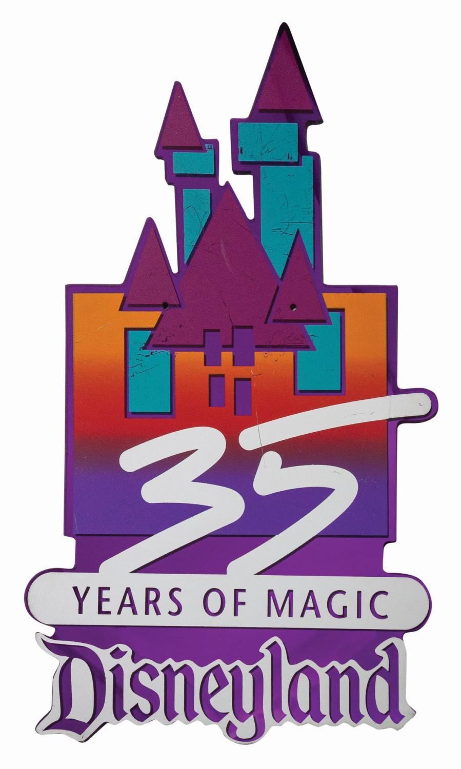 (Disneyland, 1990) A lamppost sign from Disneyland's 35th anniversary celebrations. Featuring a stylized Sleeping Beauty Castle design screen printed on acrylic board with an eye-catching purple metallic backing, the sign measures 26.25"x15.5" and is in good condition with moderate scratching throughout, particularly though the central section of the sign and the castle's towers.